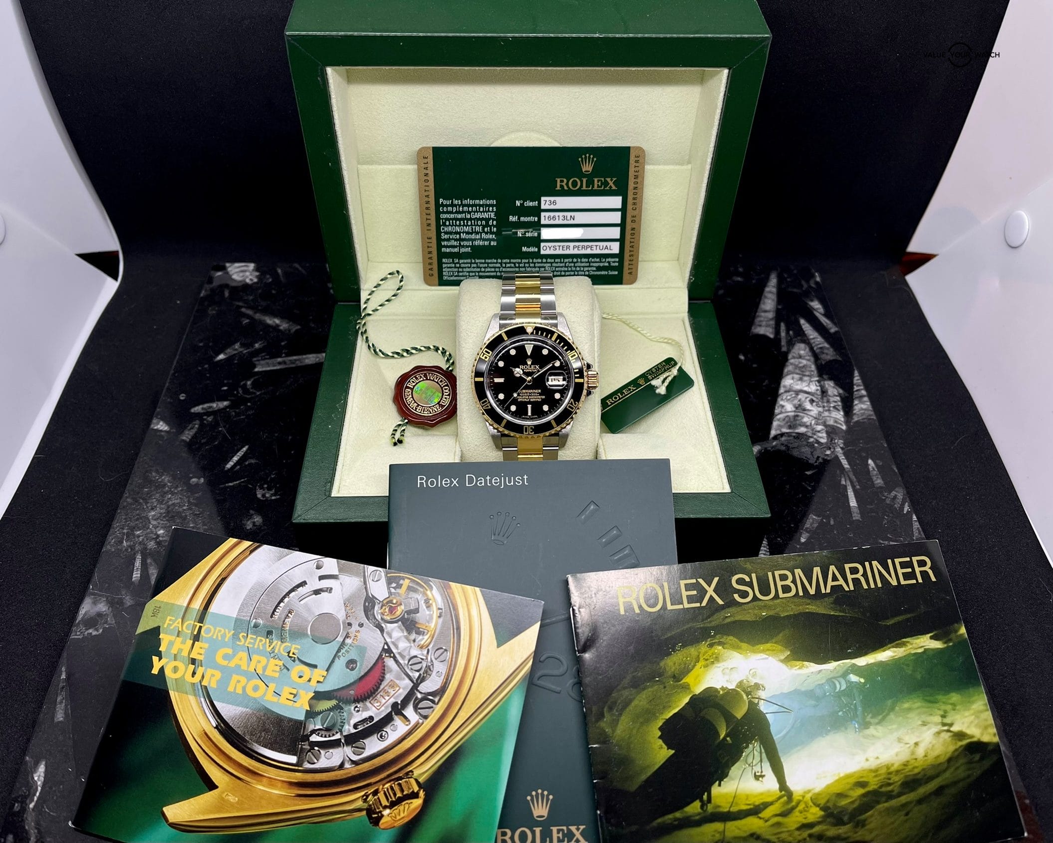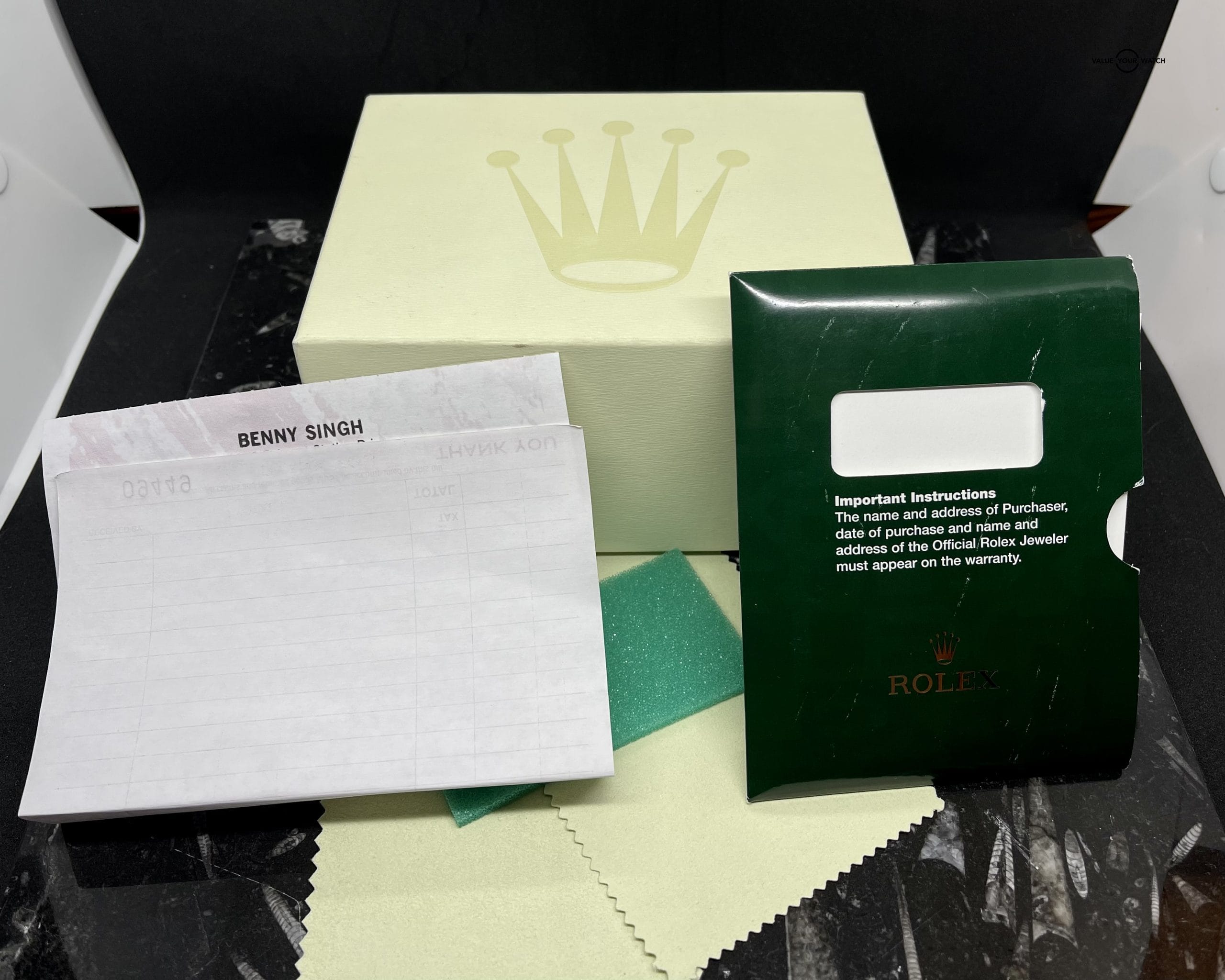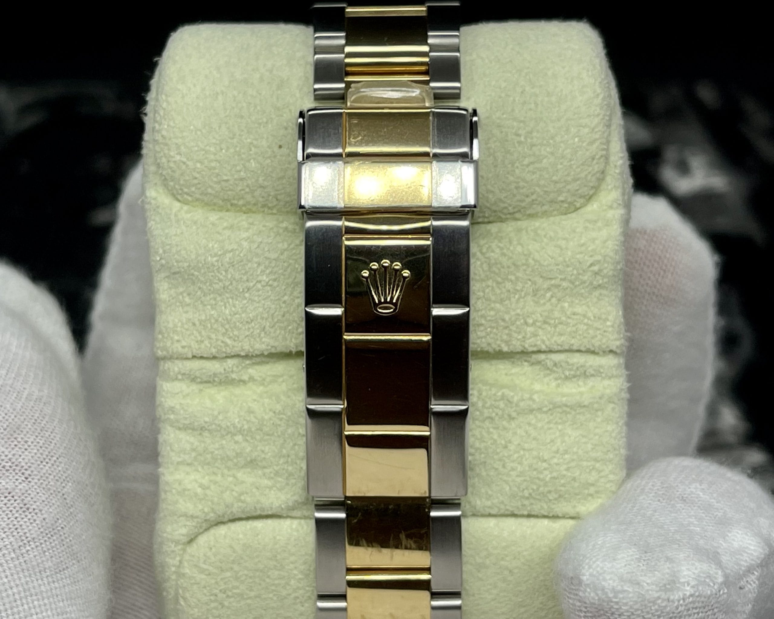 This watch comes with double box, 13.5 links, full stickers, double hang tags, filled warranty card, service receipt, service booklet, instruction booklet, instruction booklet for a Datejust (for some reason), card holder, and double microfiber cloths. The clasp has swirl marks on the center links, the bracelet has swirl marks and light scratching on a couple links, and the case, bezel, and crystal are flawless. All the scratches in the polished center links are light enough they could easily be removed with a cape cod cloth to bring it back to mint condition if desired. Get this beautiful pre-owned time piece before it’s gone!