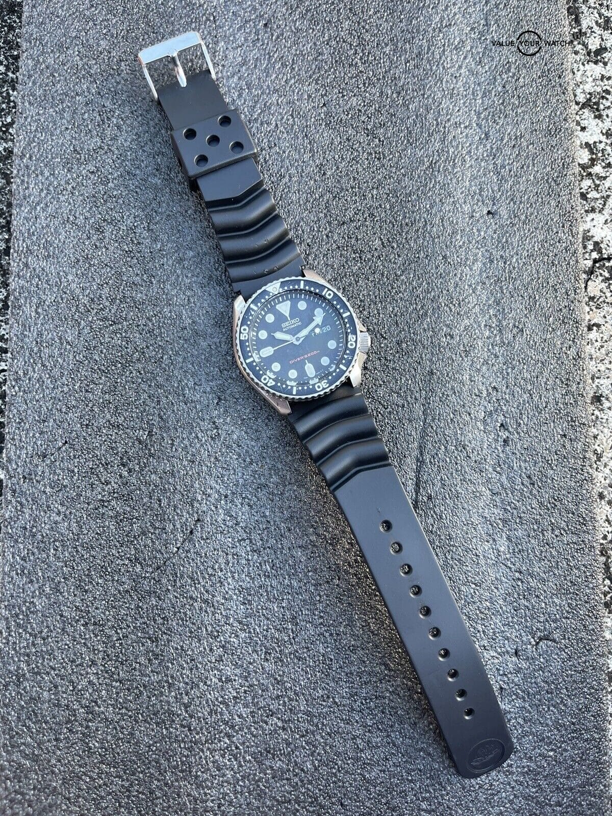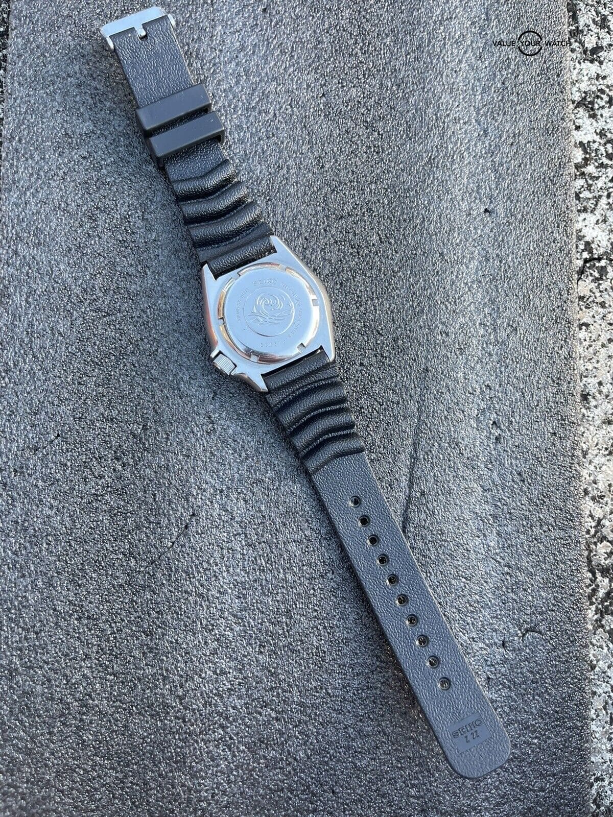Original black Seiko Rubber/Silicone band is used and shows scratches.