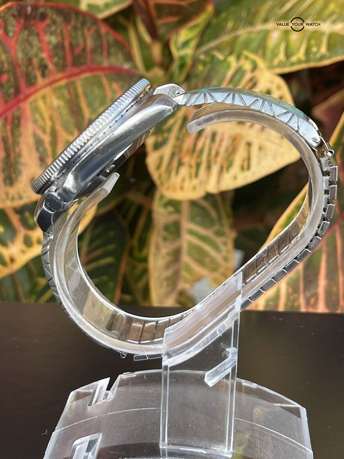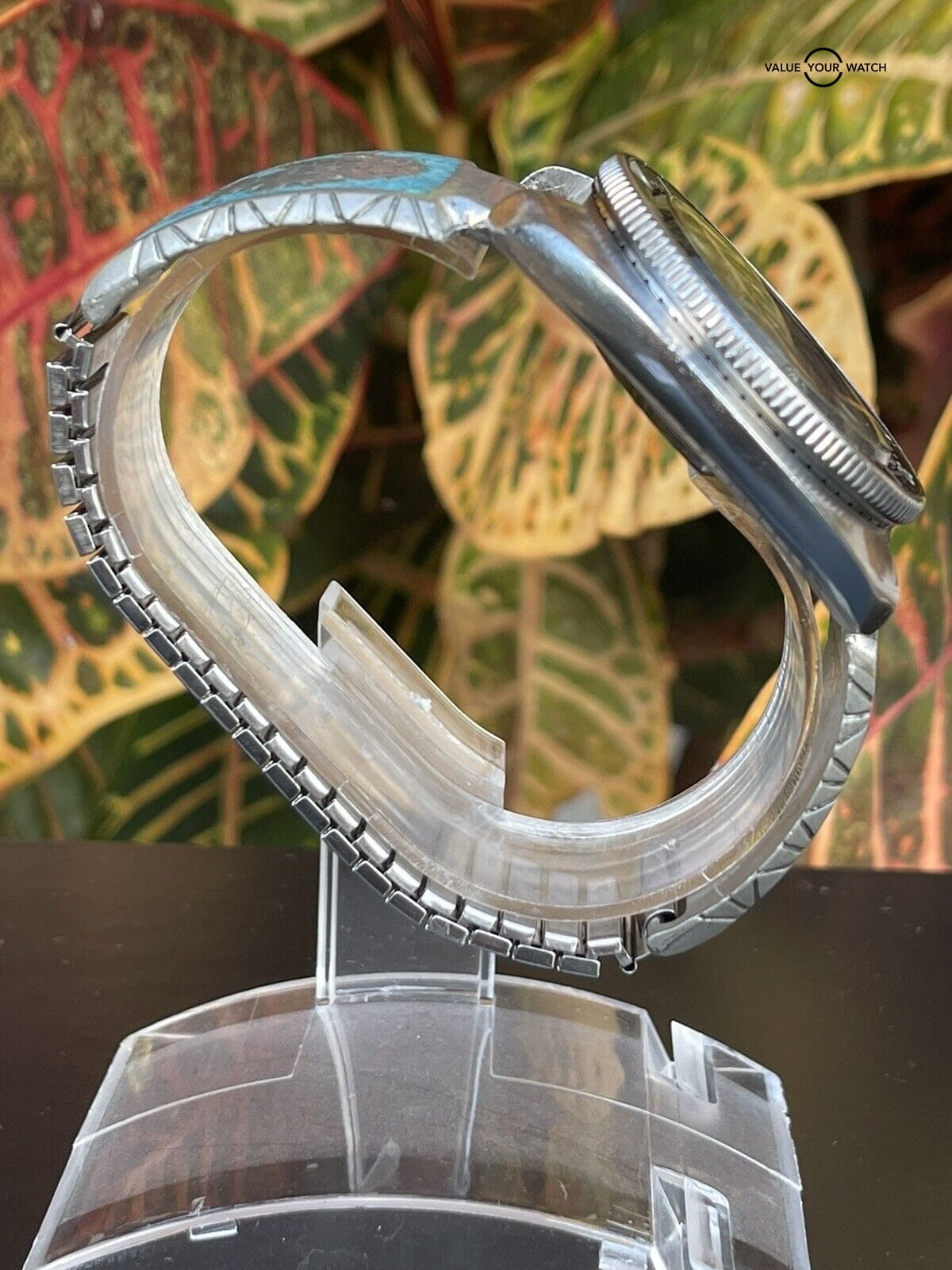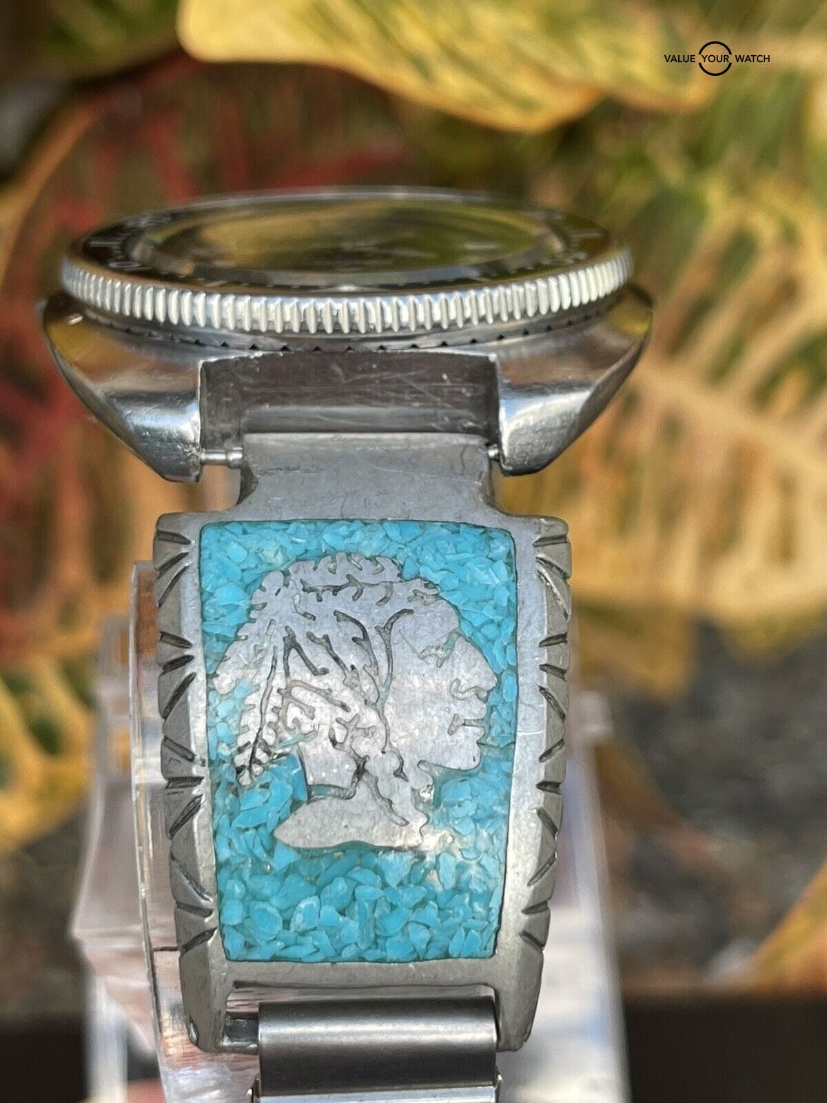 Powerful Native American Indian head turquoise stretch bracket is used and not original to the watch. Endlink looks 1-2mm smaller then the watch lugs so their is a gap.