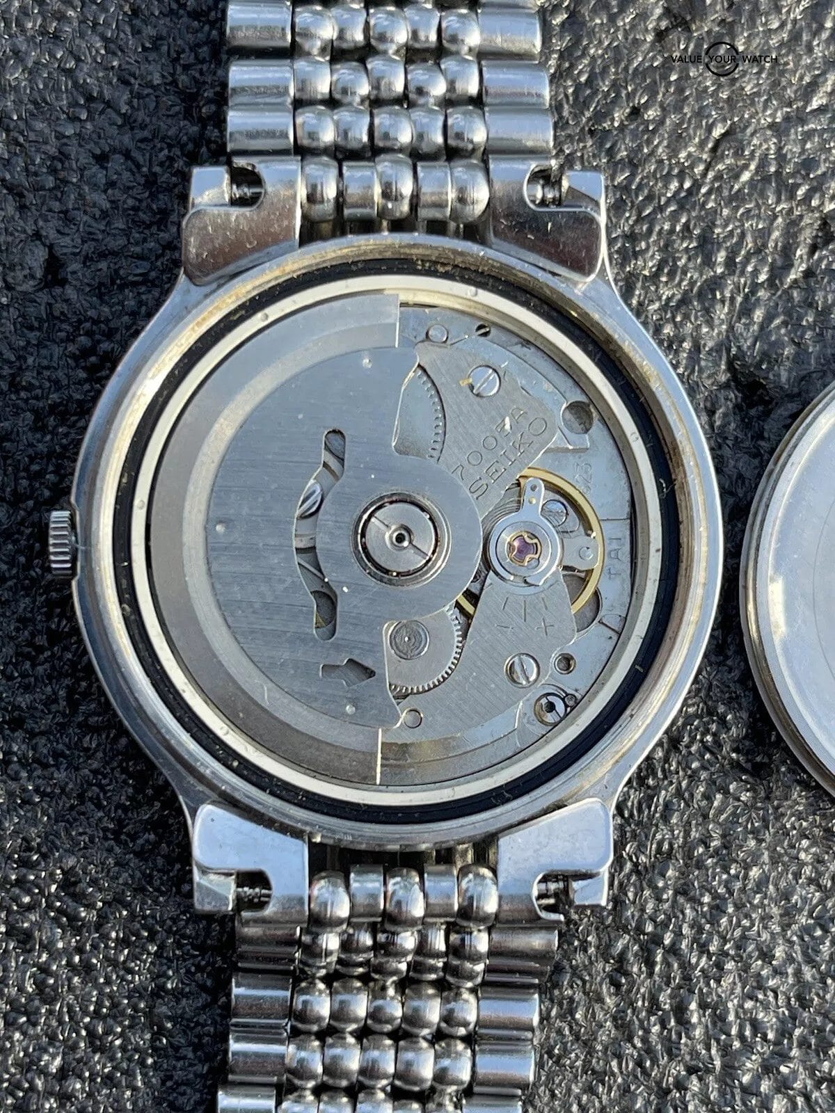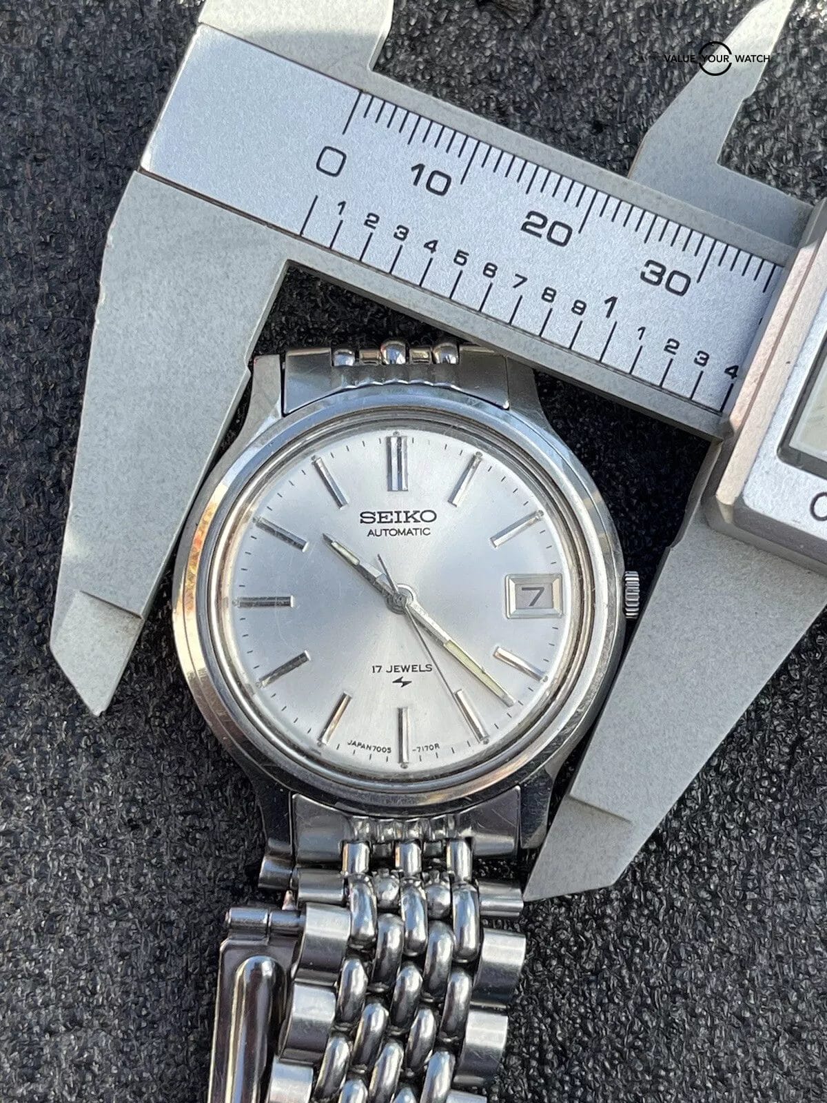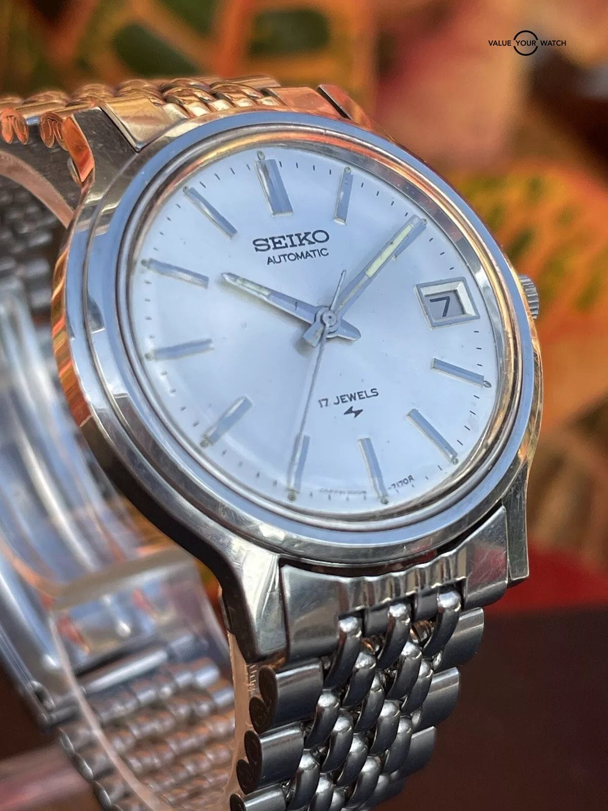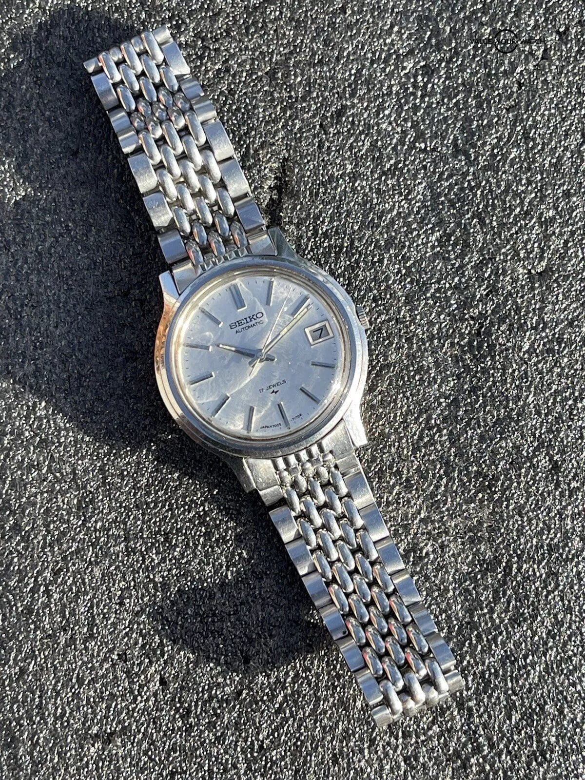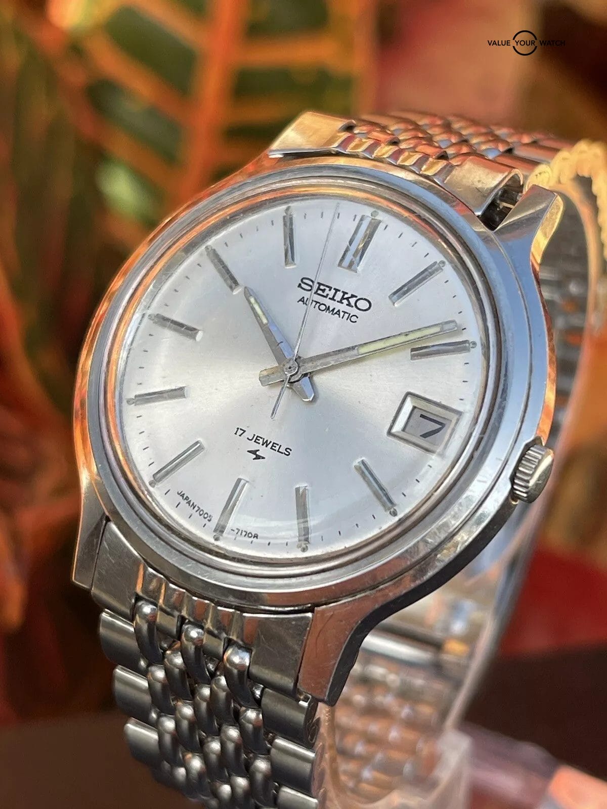 Here is beautifully patina’d silver dial Seiko automatic 17 jewel watch. Model number 7005-7110. This is from an estate sale and runs.
