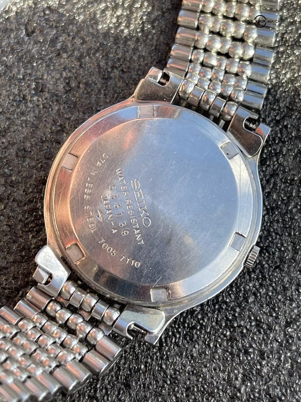Original bead of rice Seiko signed bracelet is used and shows signs of wear. It will fit up to 7.25 inch (18.4 cm) wrist.