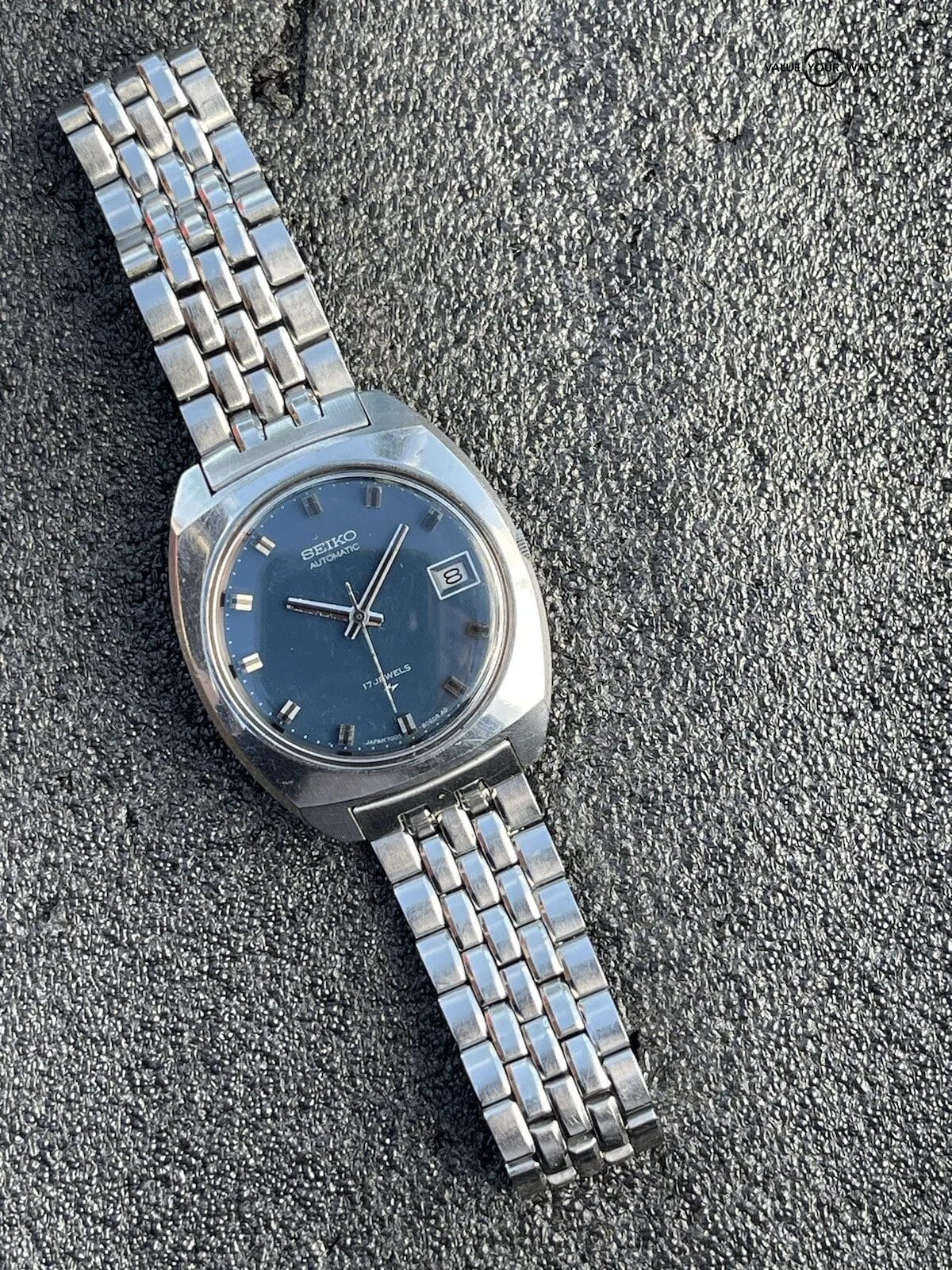 Here is beautifully patina’d blue dial Seiko automatic 17 jewel watch. Model number 7005-8040. This is from an estate sale and runs.