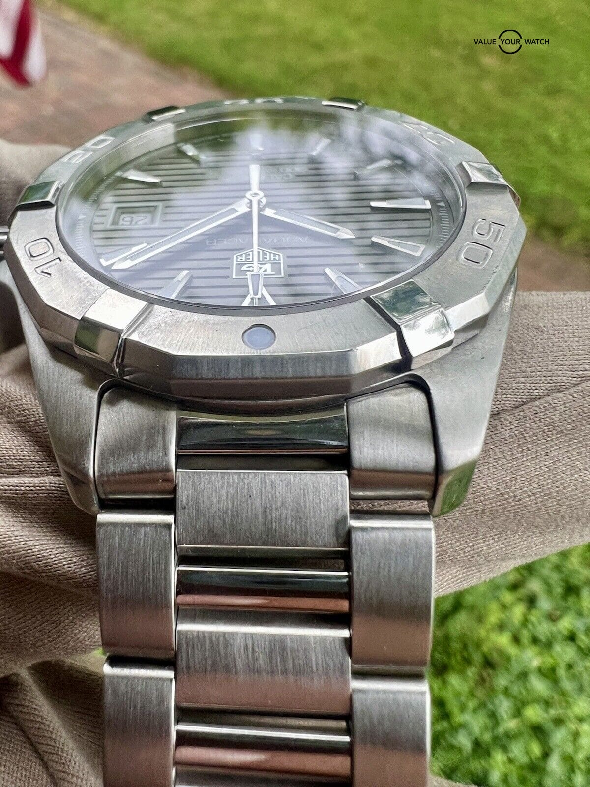 This TAG Heuer Aquaracer wristwatch is perfect for men who want to look elegant and sophisticated. With a silver case color, silver bezel, and silver bracelet, this watch is a perfect accessory for any formal occasion. The gray dial pattern with baton indexes and teaked indices adds to its classic charm.