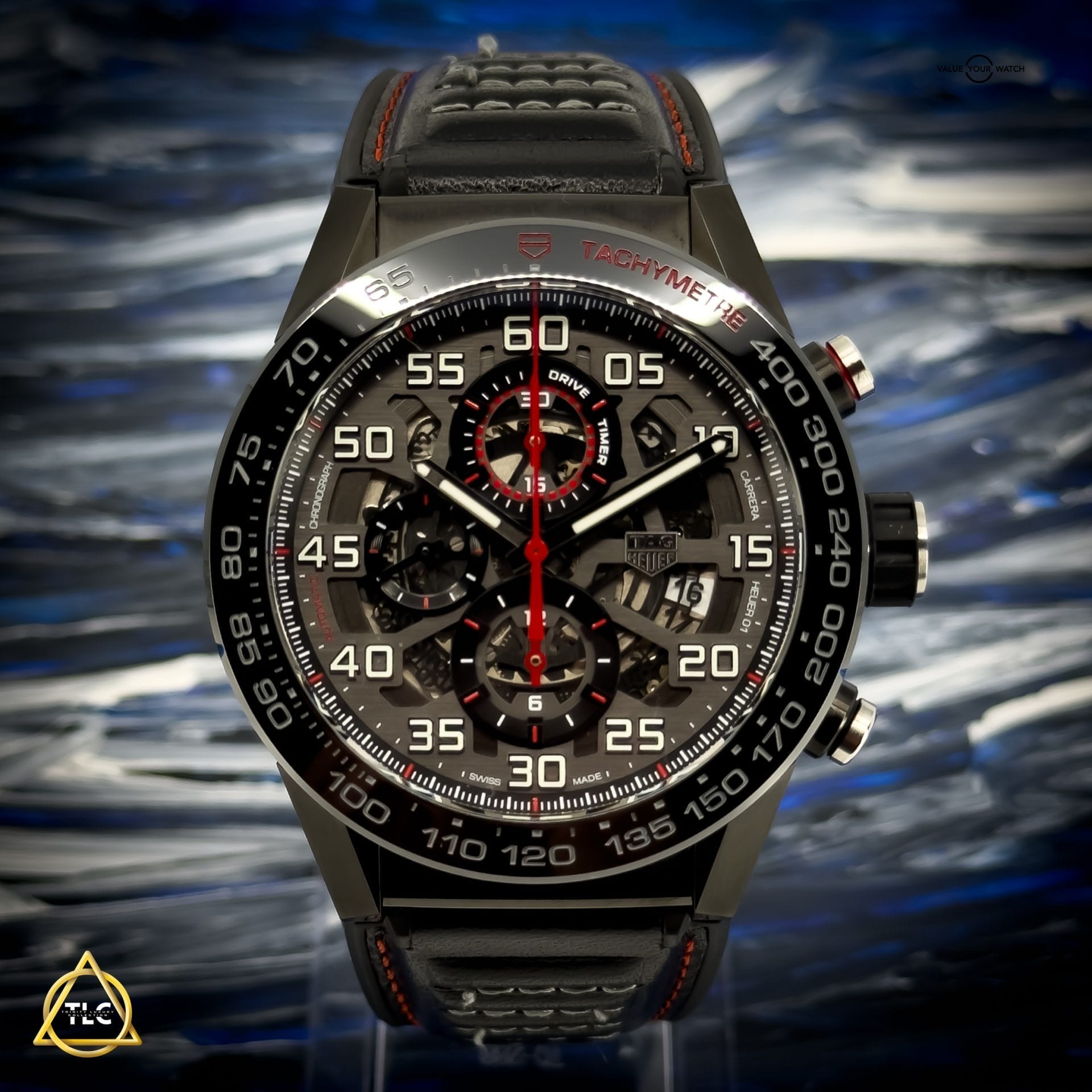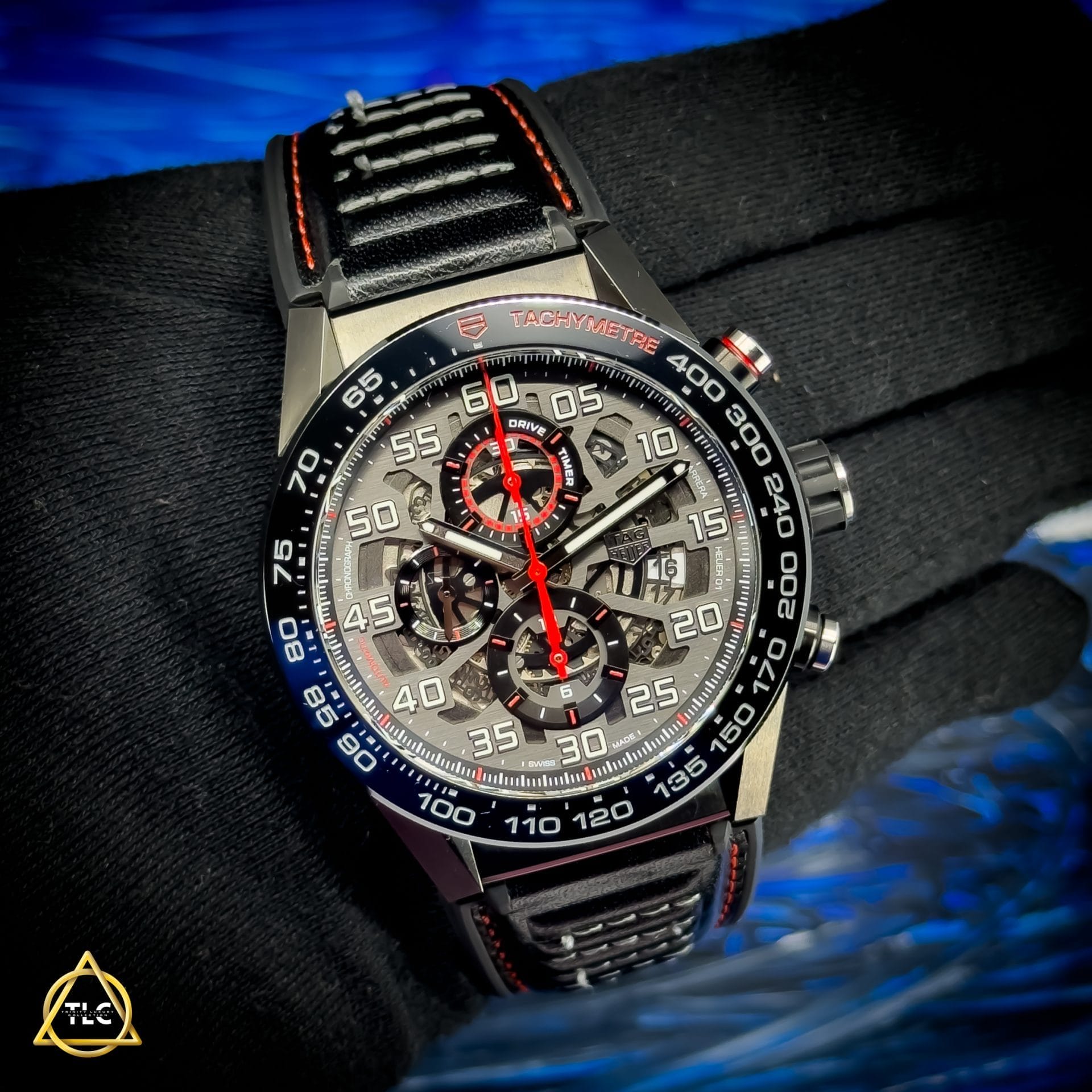 This TAG Heuer Carrera watch features a black tachymeter bezel and a gray skeleton dial with Arabic numeral indices. The watch is powered by a mechanical automatic movement and has a self-winding feature. It comes with a two-piece leather and rubber strap and the original box and papers. The case is made of stainless steel with an exhibition caseback. This Swiss-made watch has a reference number of CAR2A1H and a case size of 45mm. It is perfect for men who love wristwatches and want a stylish and functional accessory.