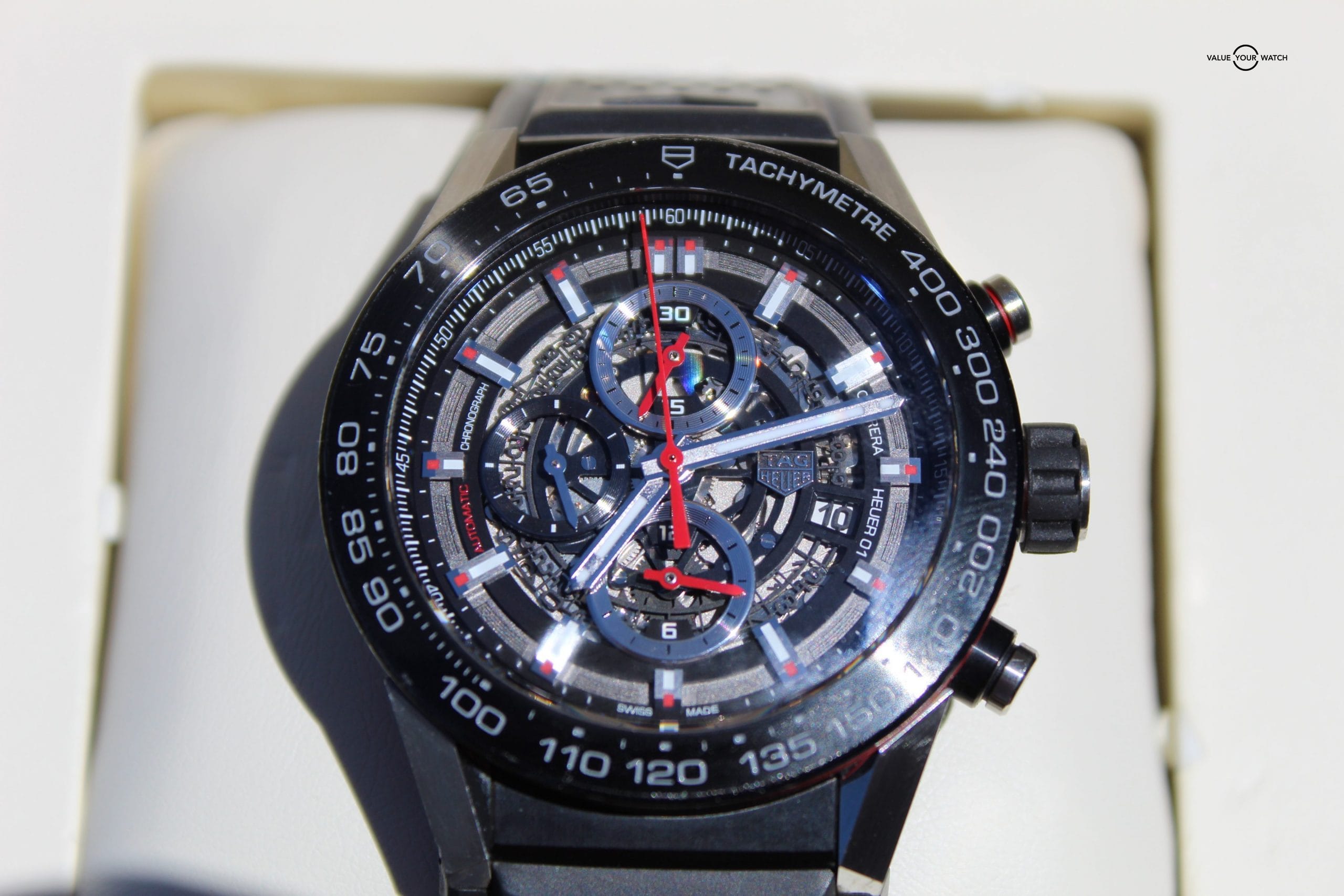 Tag Heuer Carrera 1 Chronograph Skeleton CAR2A1Z.FT6044 – Condition and Features This watch ranges from good to very good condition, meaning there are minor signs of wear on the case and bezel. The face has glow-in-the-dark hands. Watch comes with original receipt, (dated back in 2016). Mechanically the watch is keeping excellent time, especially if it is worn since it is a chronograph. – Comes With This watch comes with the inner and outer boxes, original receipt, warranty card and manual booklet. The watch is very versatile in its wear-ability. It is compatible with small and large wrists. The rubber has been left uncut and is easily adjusted to fit your wrist size.