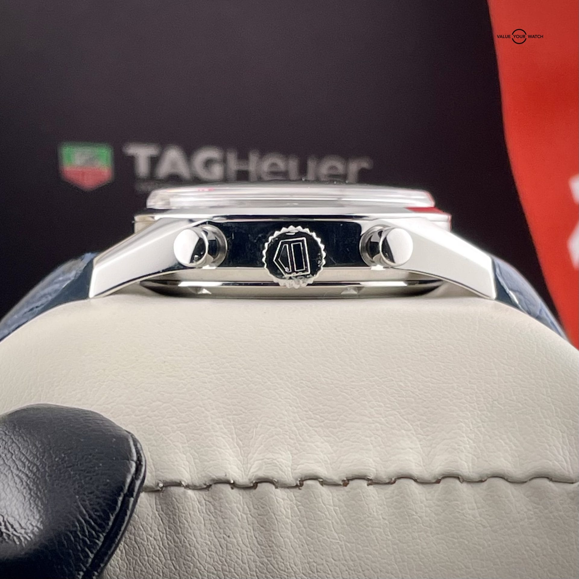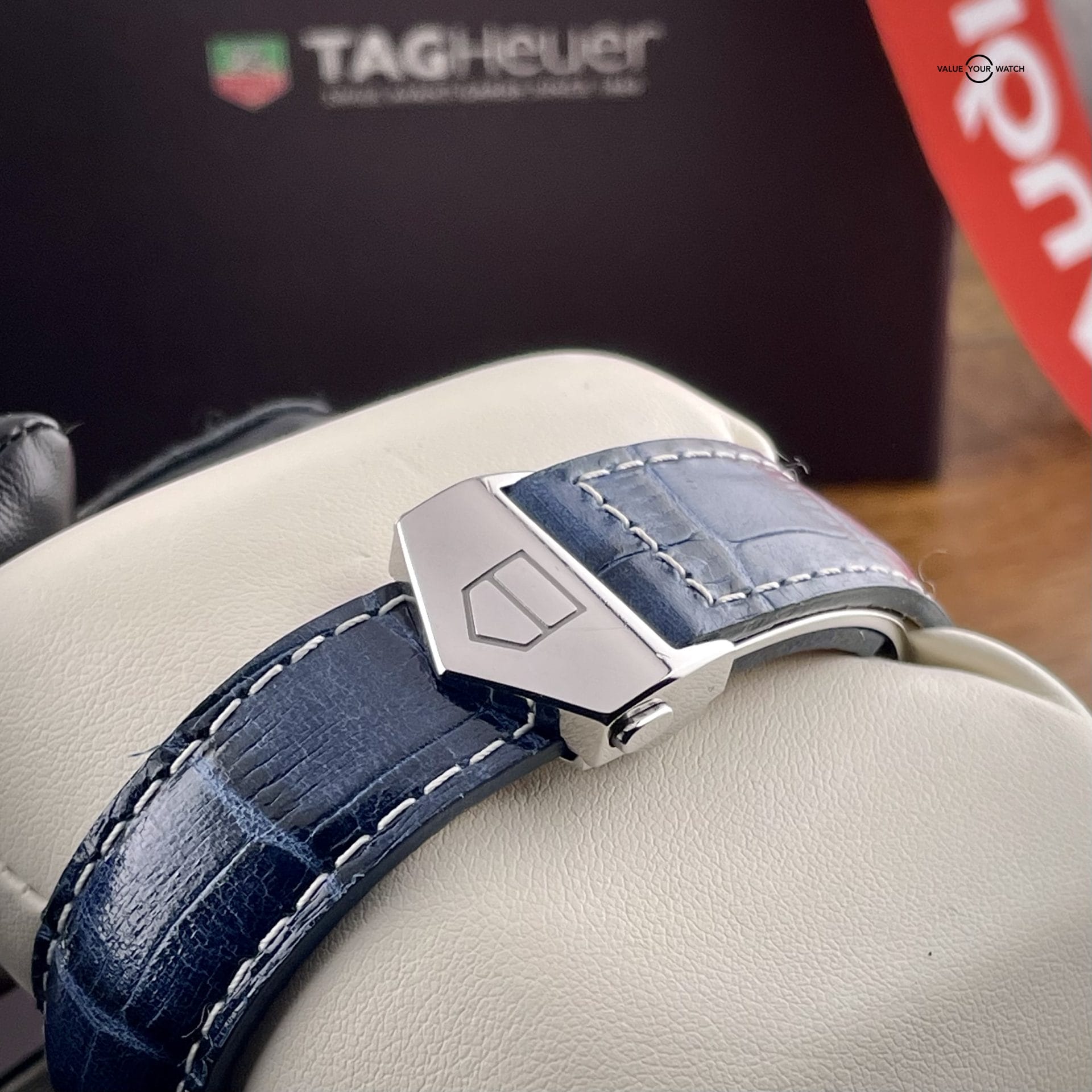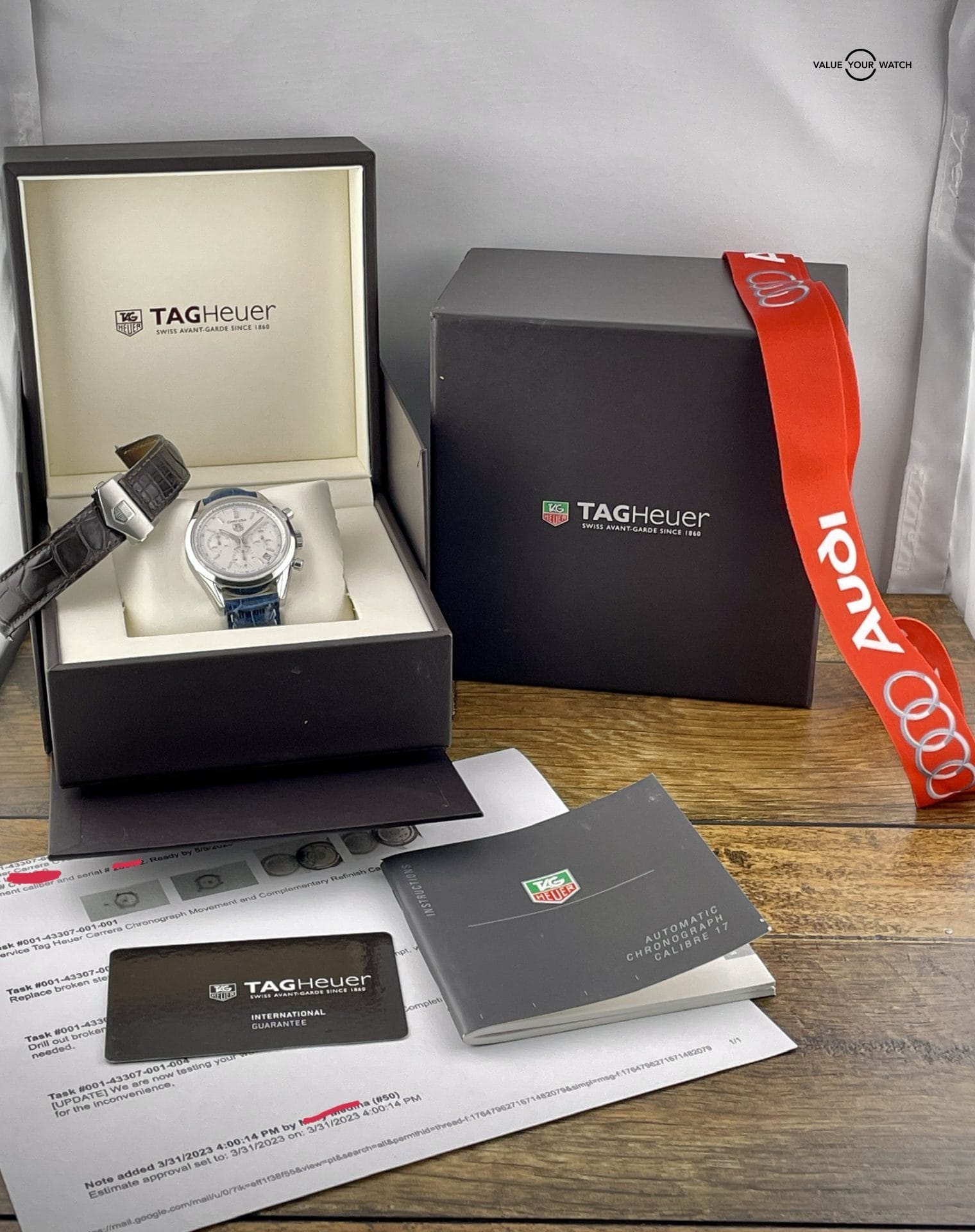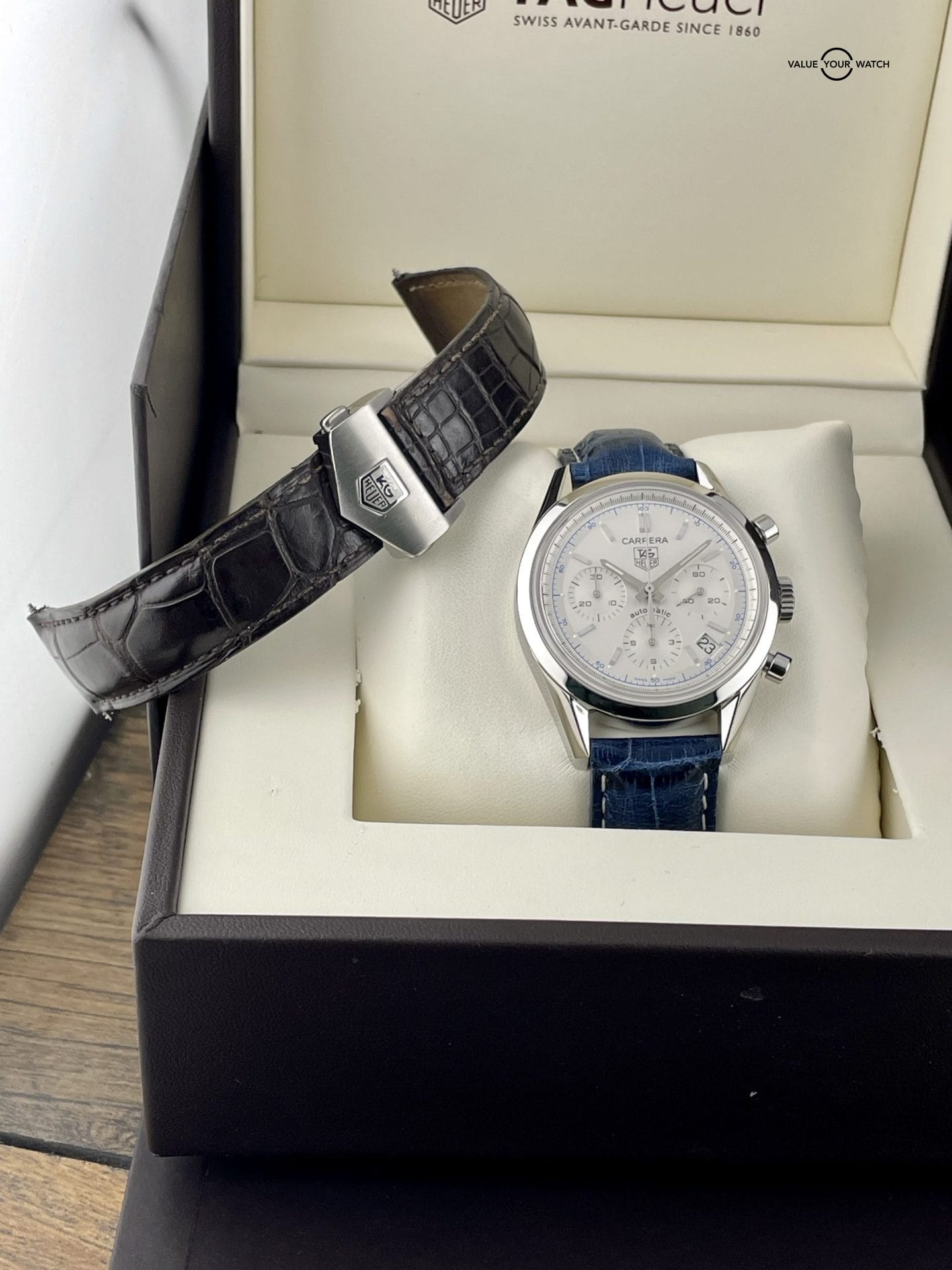 Set Contents – Inner and outer box, watch roll, booklet, open warranty card, original Tag Heuer strap (brown), aftermarket strap (blue), and two Tag Heuer deploy clasps
