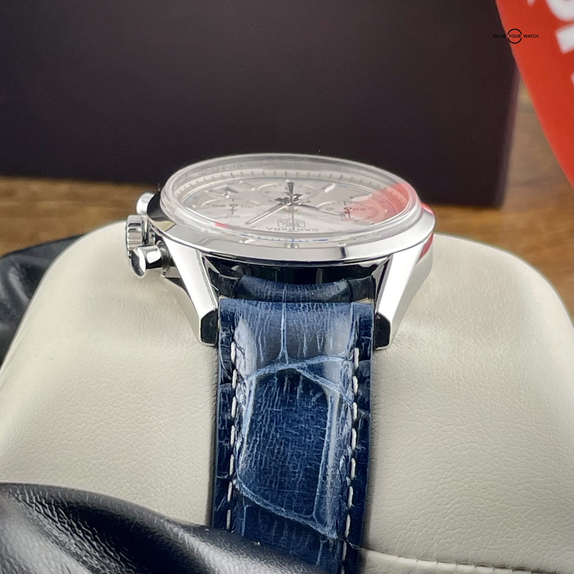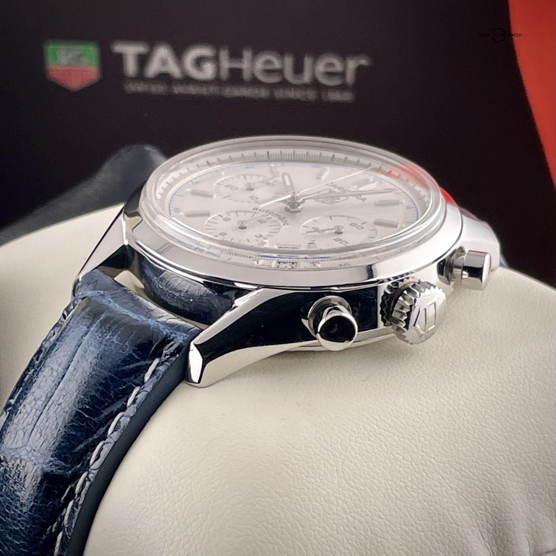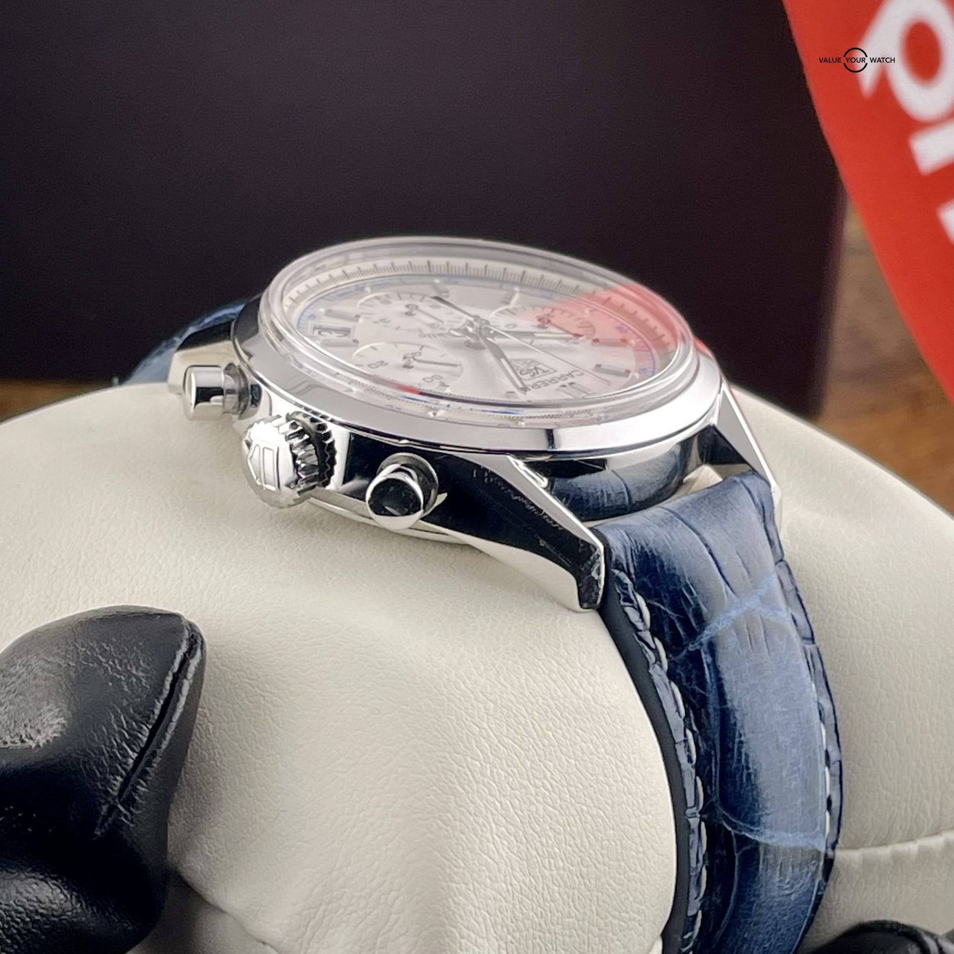 This Carrera Classic Chronograph comes as a complete set, including the original box, papers, and warranty. Moreover, it has recently undergone a service, ensuring its optimal functionality and performance. This combination of a complete set and recent service adds value and provides reassurance to potential buyers, making it an attractive option for watch enthusiasts.