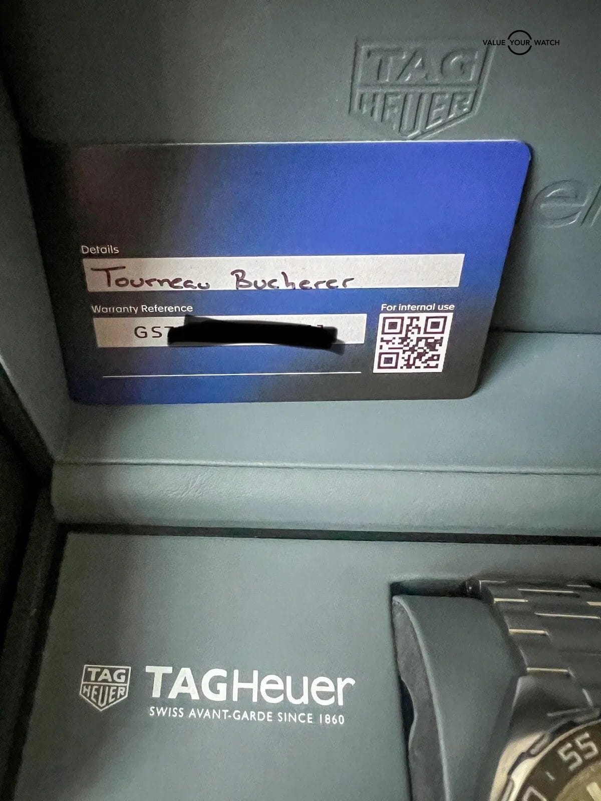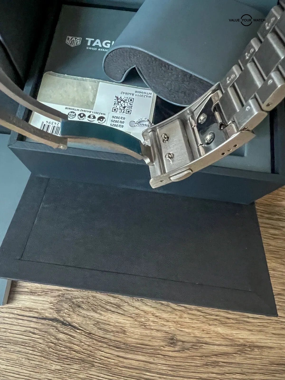 Additional features include a date indicator, self-winding mechanism, solid caseback, and a 43mm case size. The watch comes with its original box/packaging and papers, and has a reference number of WAZ2011.BA0842. Ideal for men who value style and functionality, this sporty timepiece is perfect for any occasion.