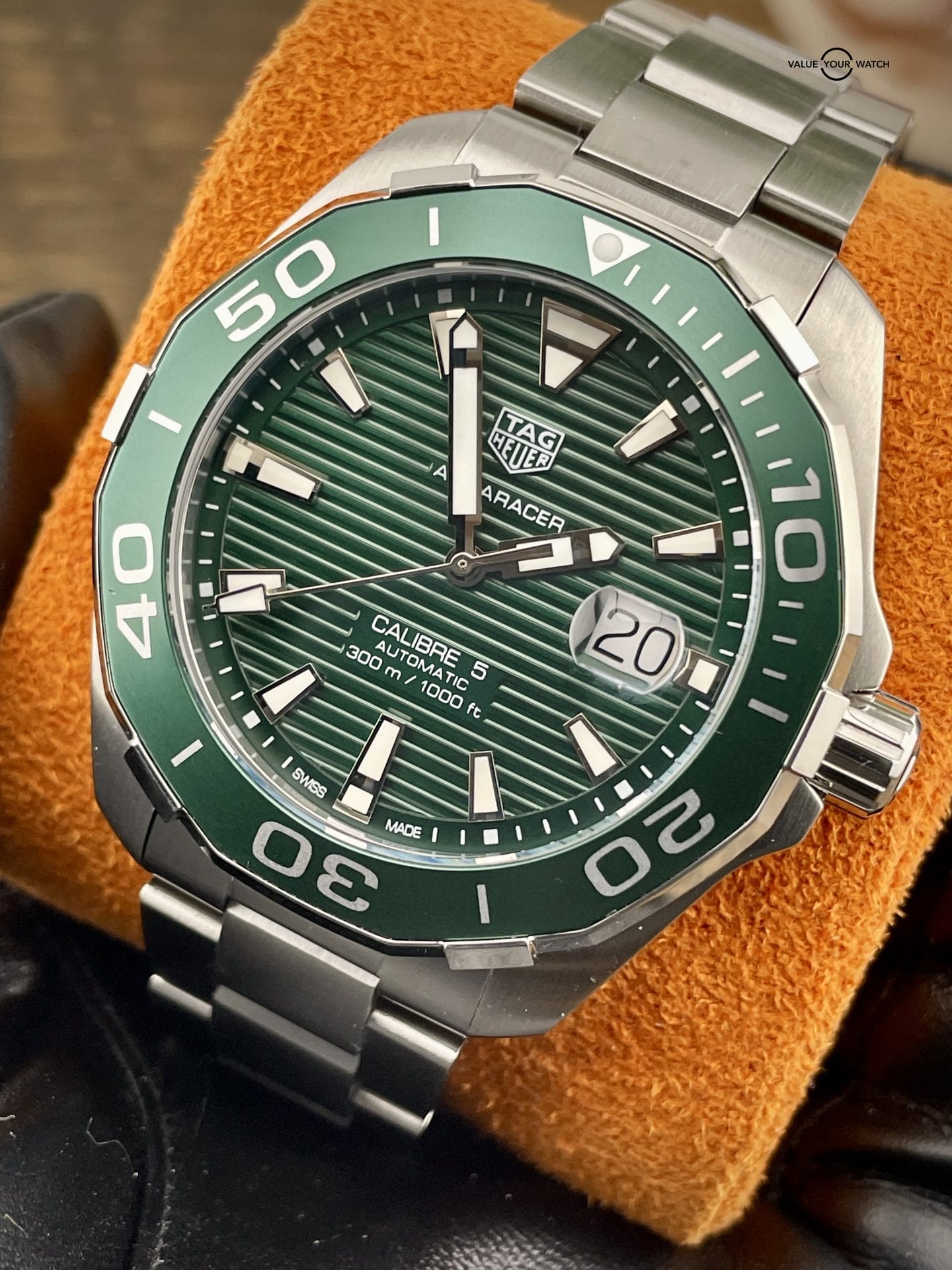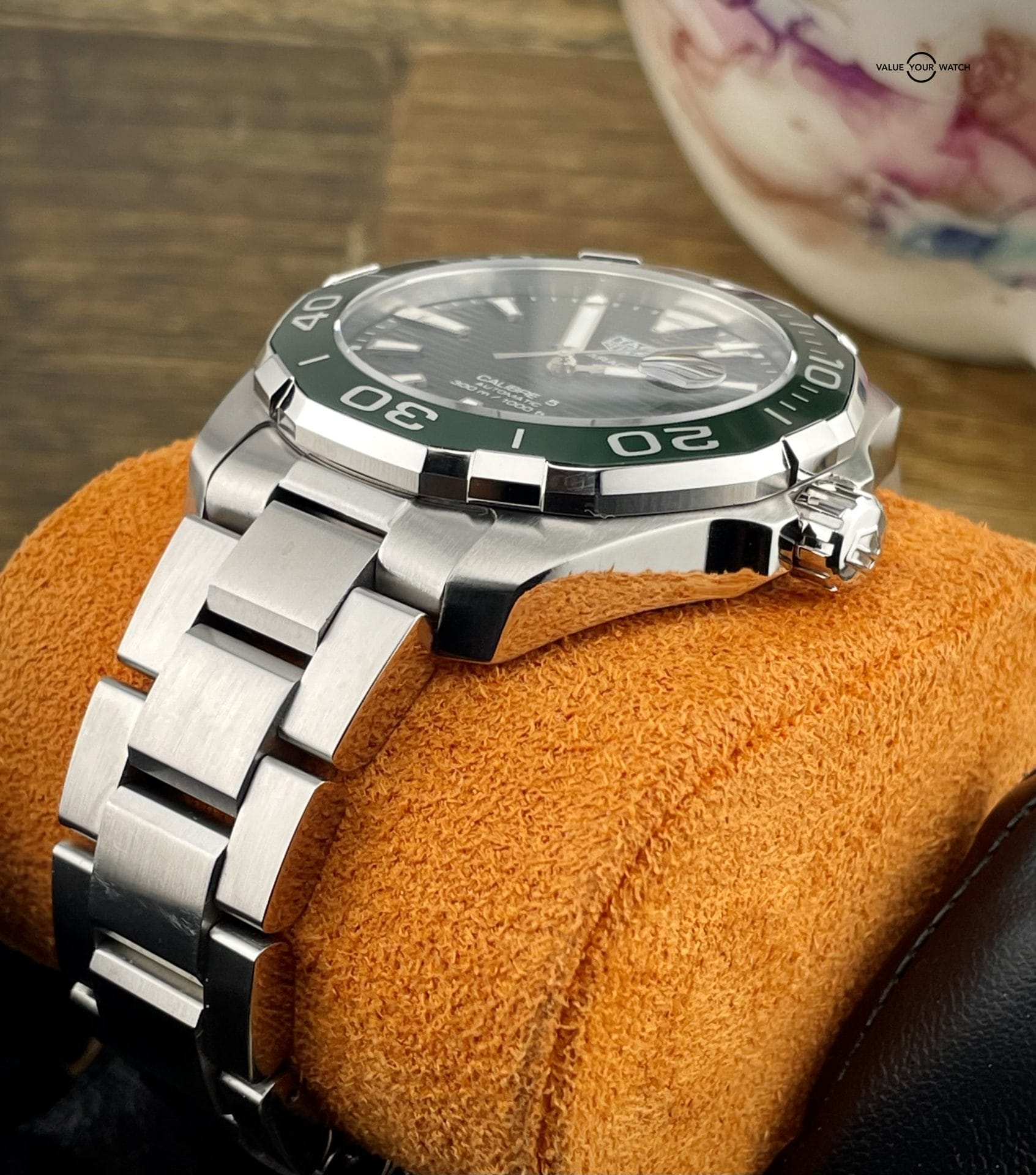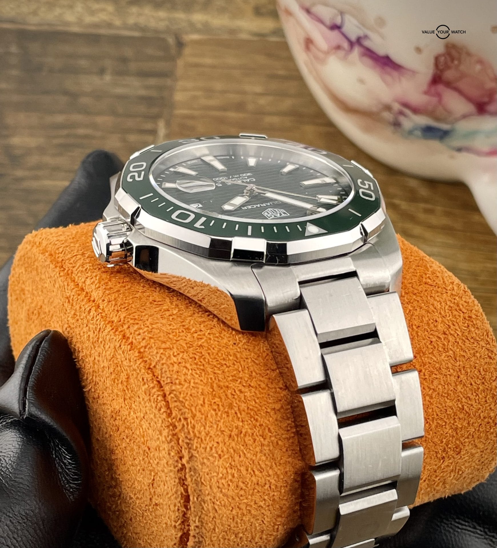 Up for sale is a Tag Heuer Aquaracer Automatic 43 mm with the HIGHLY desires ceramic green Bezel and Dial! Excellent first fine Swiss timepiece or a gift for the upcoming holidays. This is a great every day wearer or it can dress up to any occasion as needed.