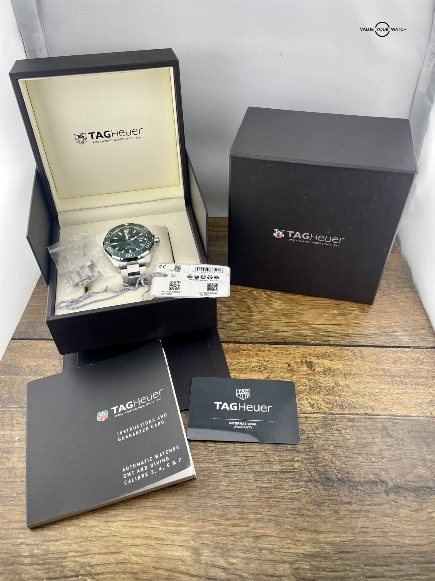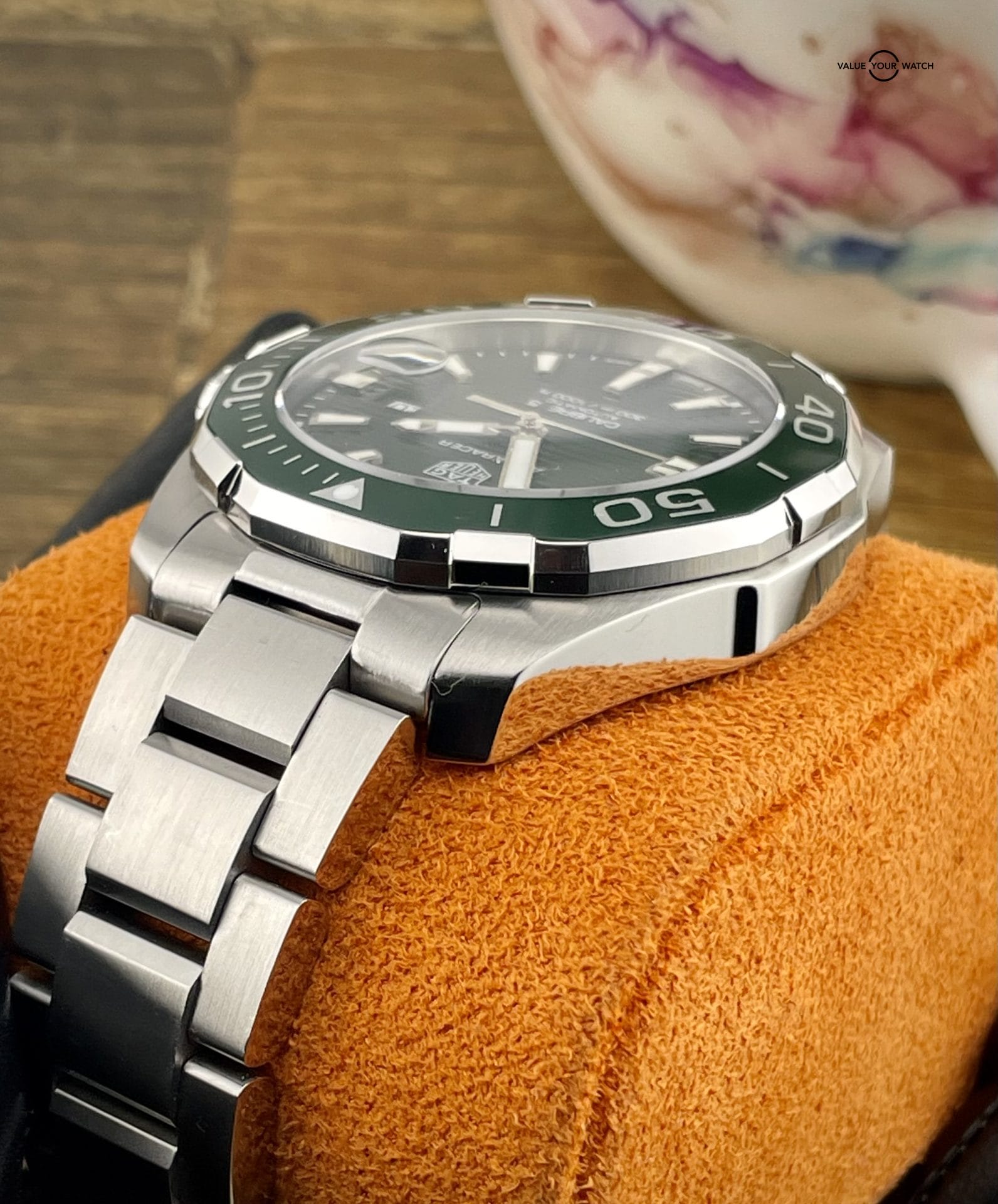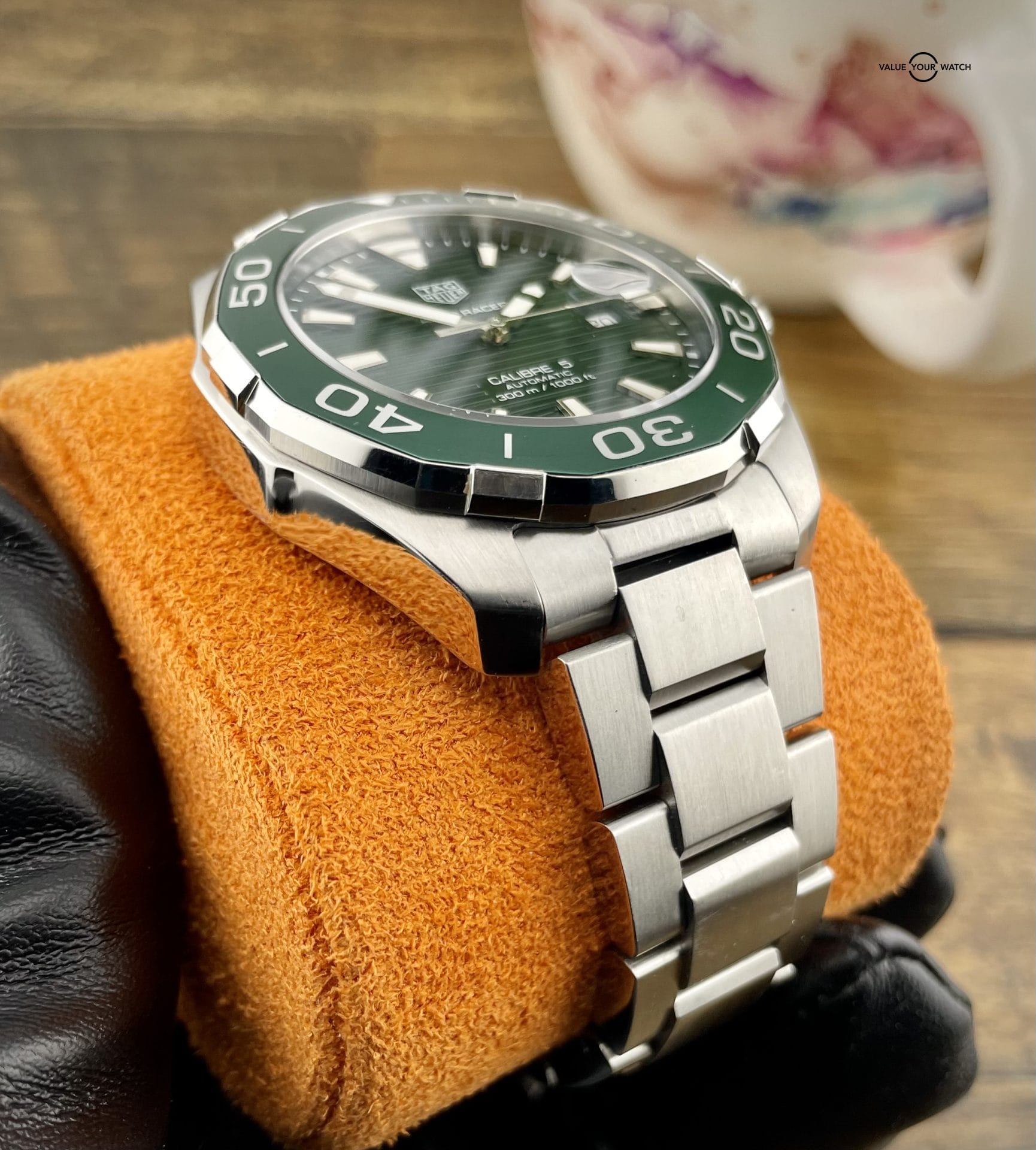 Up for sale is a Tag Heuer Aquaracer Automatic 43 mm with the HIGHLY desires ceramic green Bezel and Dial! Excellent first fine Swiss timepiece or a gift for the upcoming holidays. This is a great every day wearer or it can dress up to any occasion as needed.