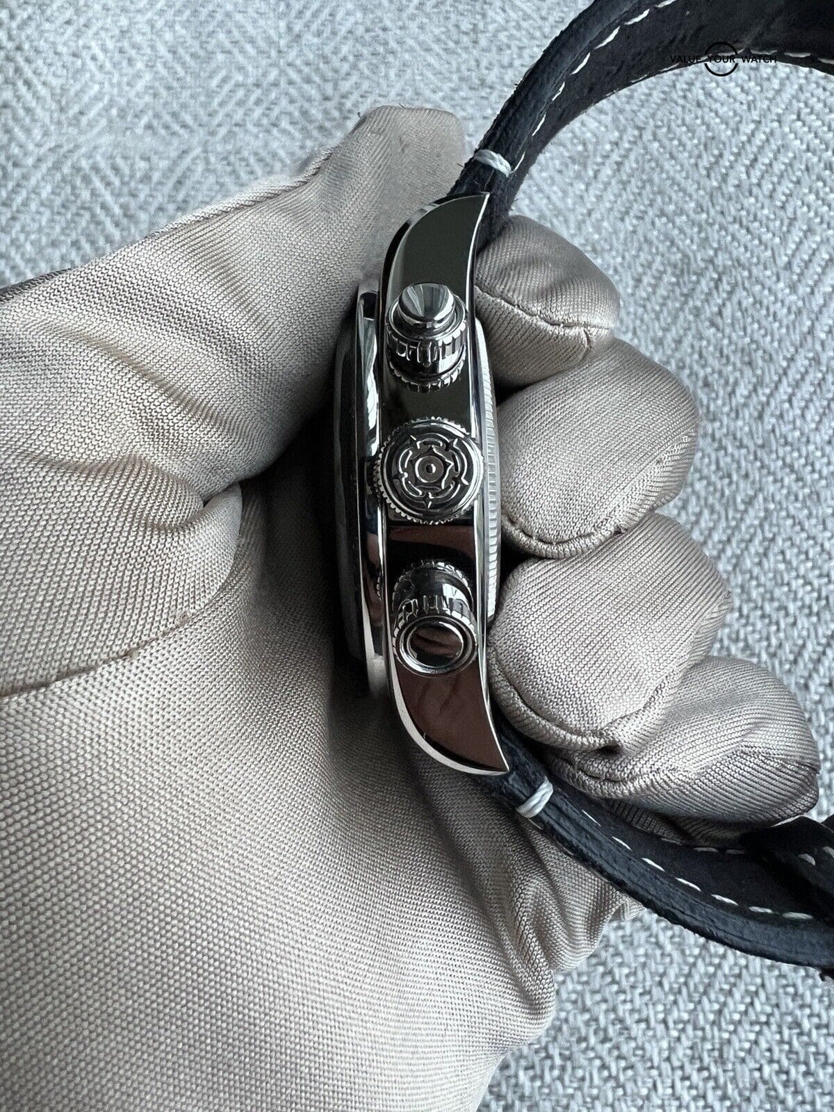 Introducing a 2023 Tudor Black Bay Chronograph Wristwatch with a complete set including the original box and papers. This Swiss-made watch has a 41mm silver stainless steel case with a black leather two-piece strap. The dial is black with arrow markers and round indexes, featuring luminous hands and indexes. The watch has a chronometer, date indicator, and small second. The bezel is a tachymeter with a rotating feature.