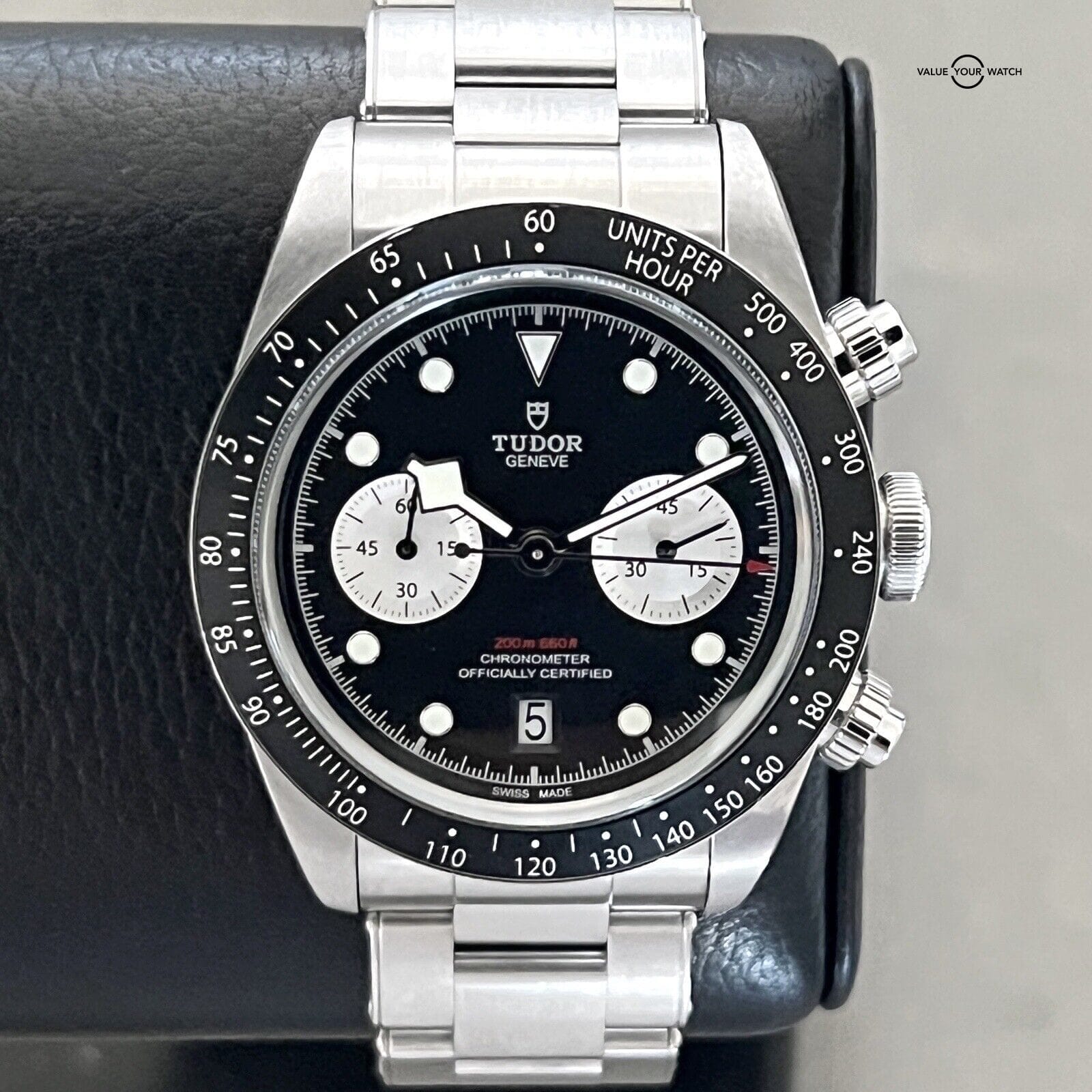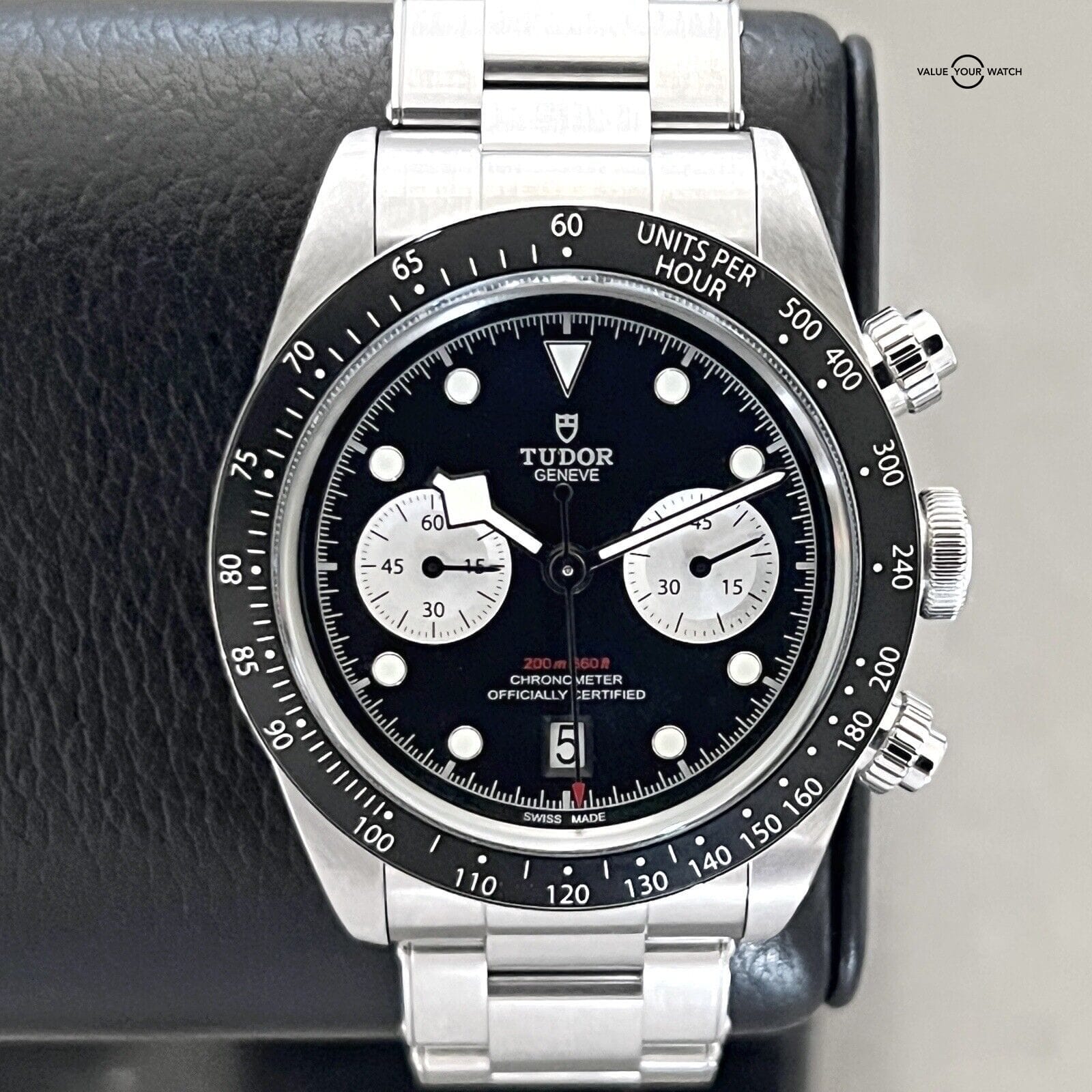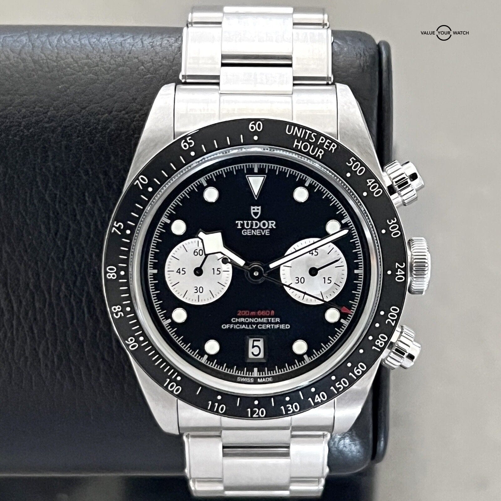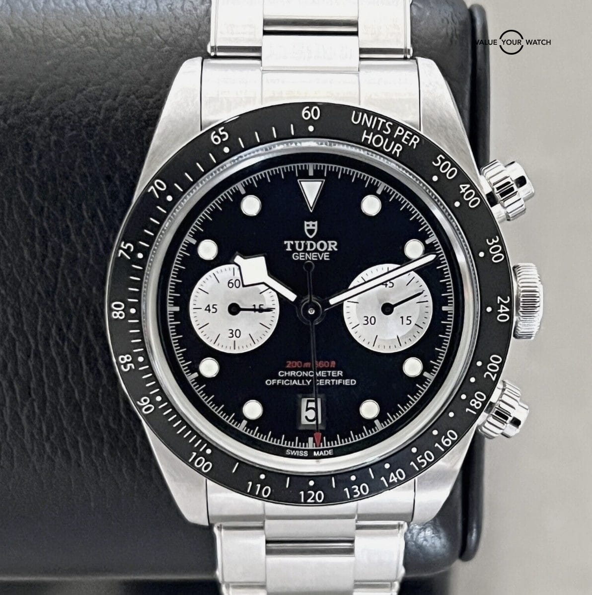 This Tudor Black Bay Chronograph 41mm wristwatch in mint condition is a luxury timepiece that combines sporty and formal styles. The stainless steel and black case color, with a black dial color, is complemented by a silver stainless steel bracelet band. The watch features a non-numeric hour marks indices, tachymeter bezel type, and chronograph features, alongside a mechanical (automatic) movement.