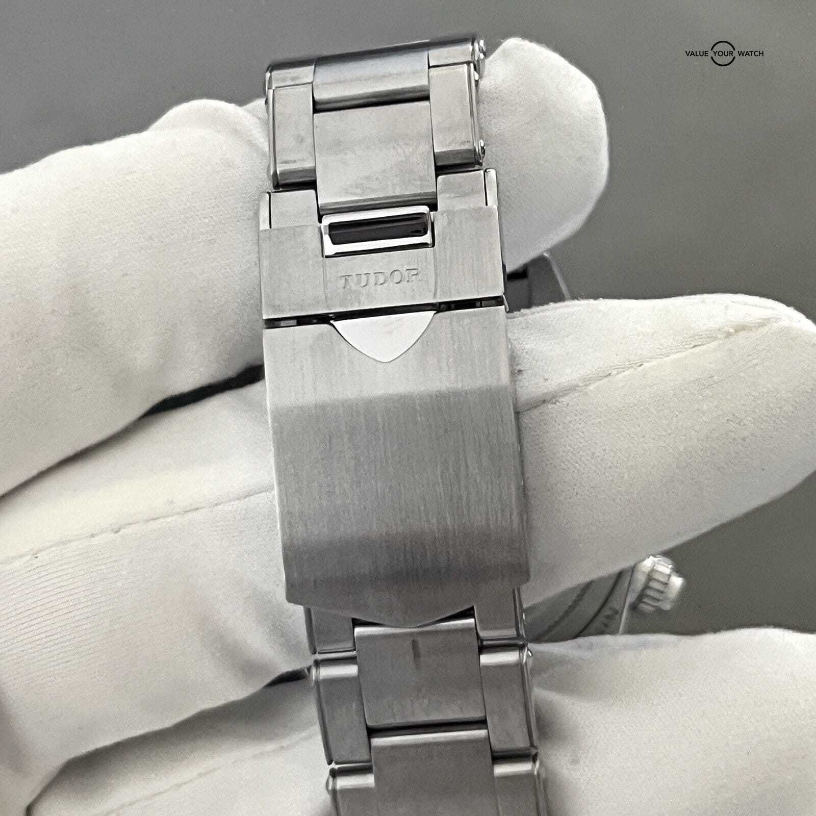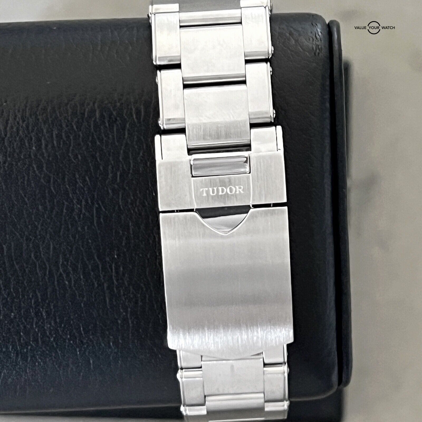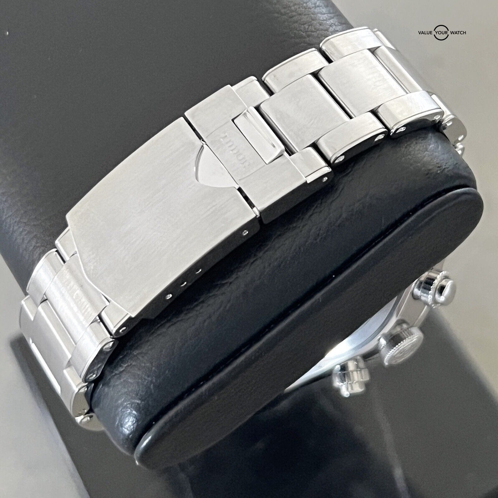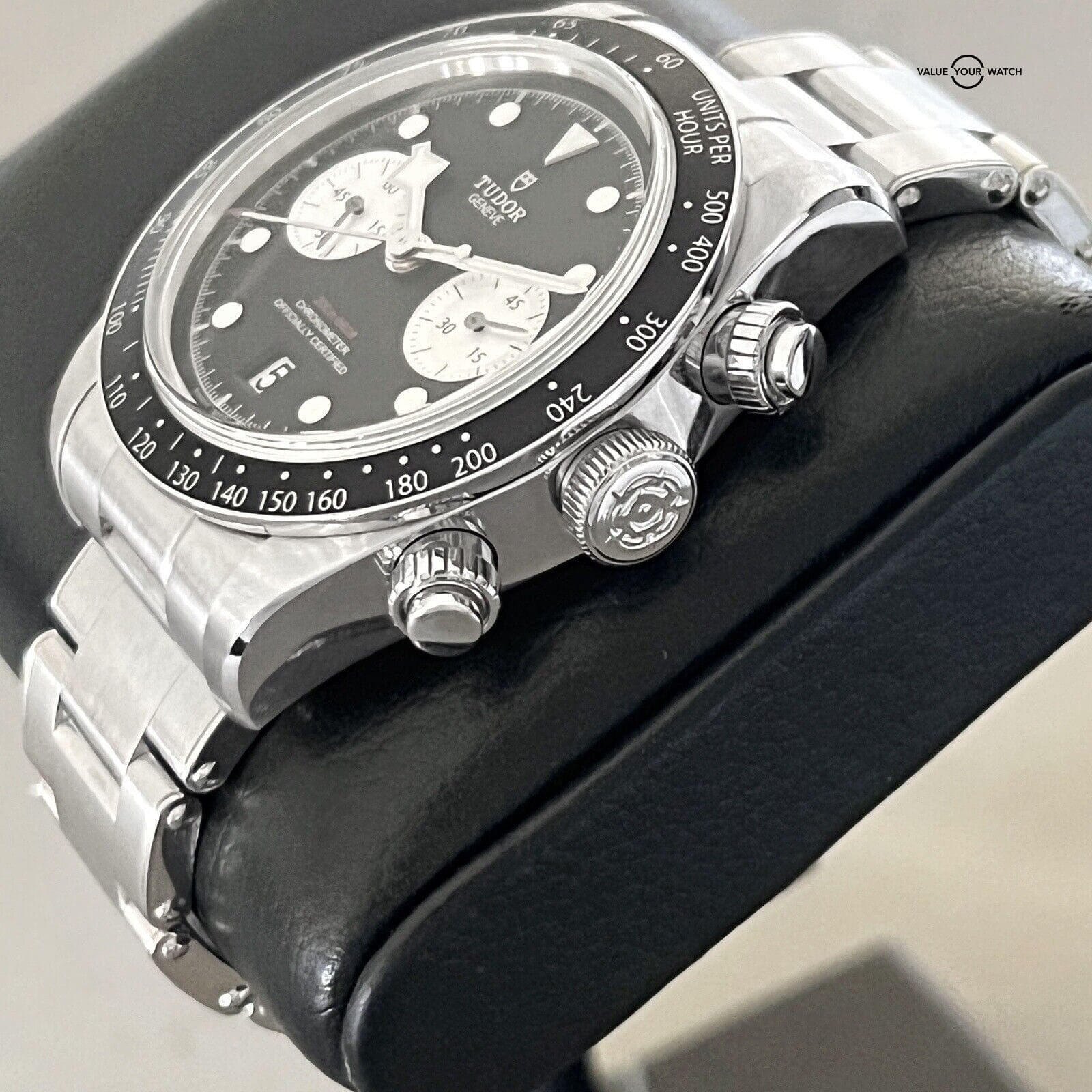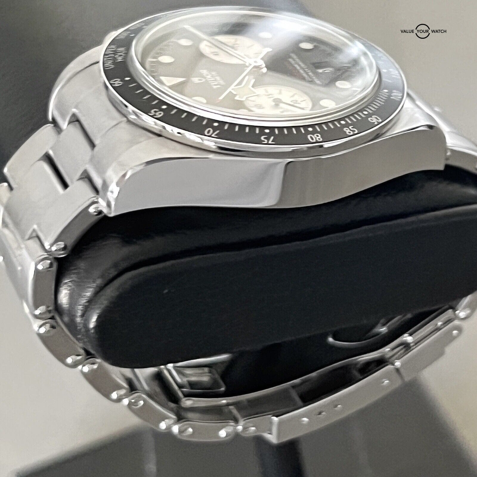 This Tudor Black Bay Chronograph 41mm wristwatch in mint condition is a luxury timepiece that combines sporty and formal styles. The stainless steel and black case color, with a black dial color, is complemented by a silver stainless steel bracelet band. The watch features a non-numeric hour marks indices, tachymeter bezel type, and chronograph features, alongside a mechanical (automatic) movement.