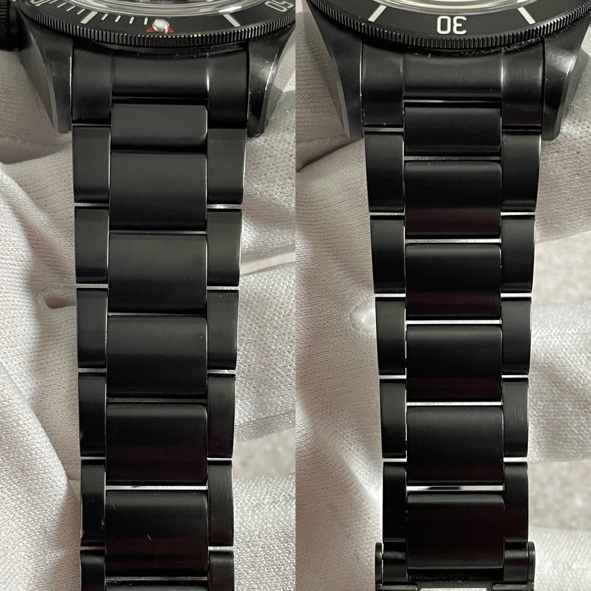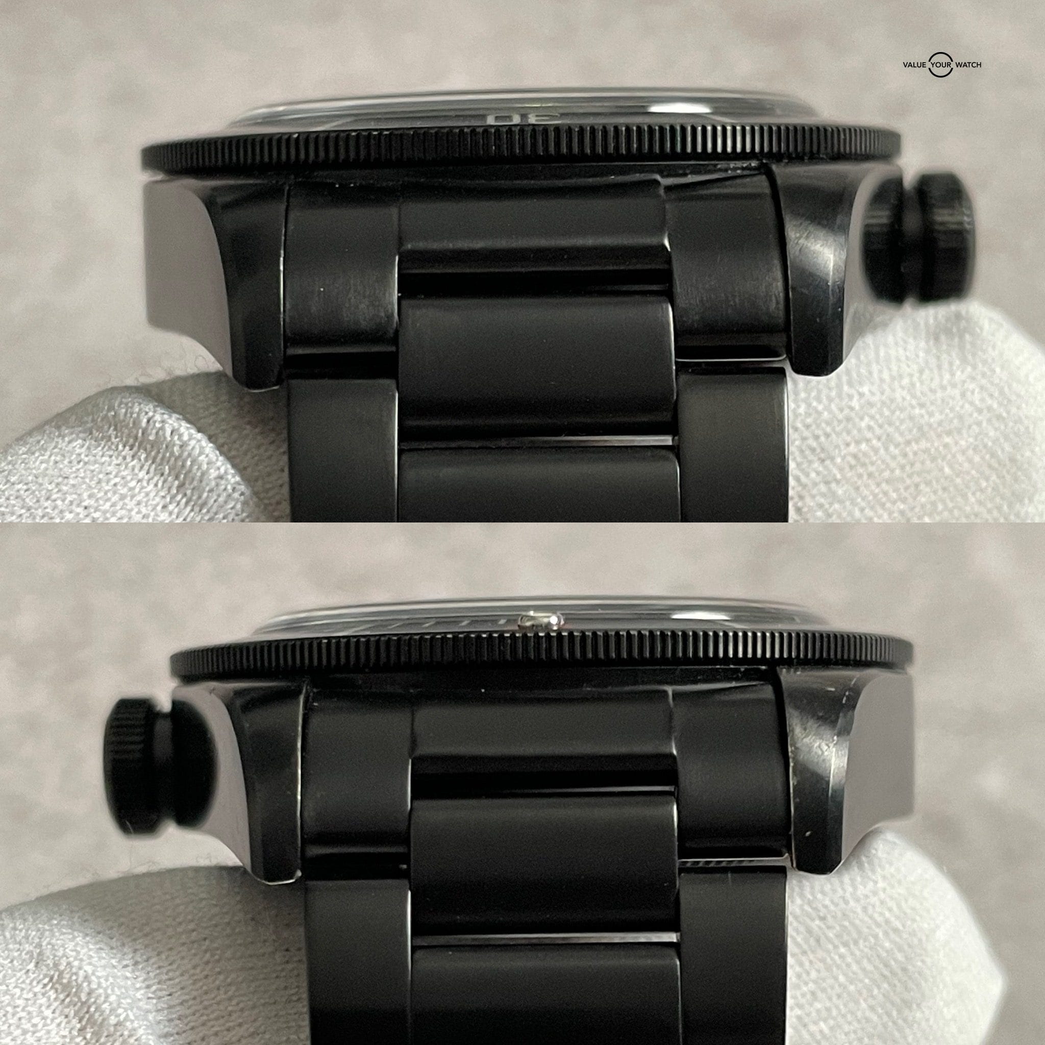 This offering is box and watch. The piece is in overall good shape. Does show some signs of wear on the clasp and a couple of the sharp edges as well as one very small spec to note on the outside of the crystal near the 4’oclock that looks like a small piece of dust. Nothing that takes away from the overall enjoyment of the watch, just normal wear on the PVD coating. Also included are the two additional black straps to change up the look…one leather and one nato. Don’t miss your chance to get this bad ass all discontinued all black PVD piece!