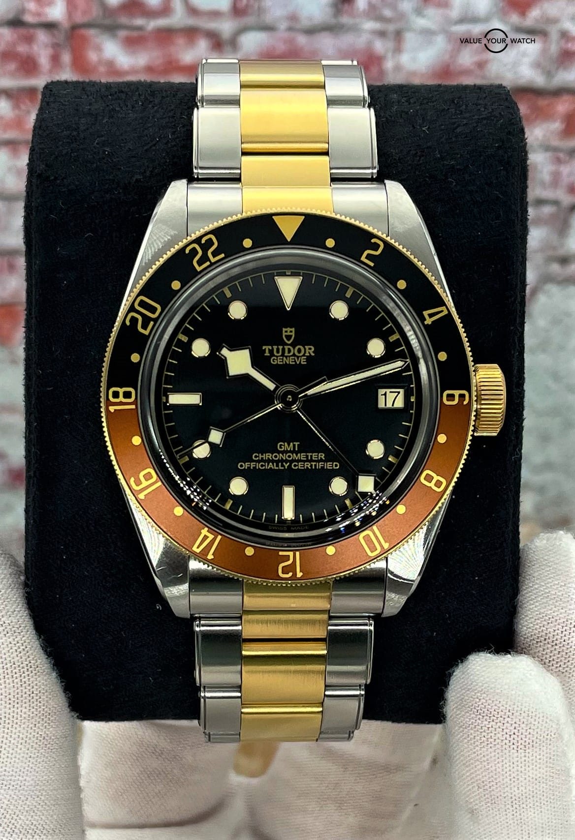 Offered by NoVA Watch Supply of Fairfax, VA: A good condition Tudor Black Bay GMT S&G “Root beer” watch, Ref # M79833MN-0001, Circa 2022. If you’ve been looking for the perfect daily piece, you need to stop right here! The Tudor Black Bay GMT S&G has it all. The two tone style is classic, the GMT function is a great tool for those who deal internationally, travel, or just like to keep track of time in another timezone, and the black and brown bezel work with any outfit and in any season. Personally I think this is one of the best bang for your buck luxury pieces between the mix metals, functionality and with Tudor being the little brother to Rolex, it feels amazing on the wrist just like its sibling but at a fraction of the price. This piece comes with the following: