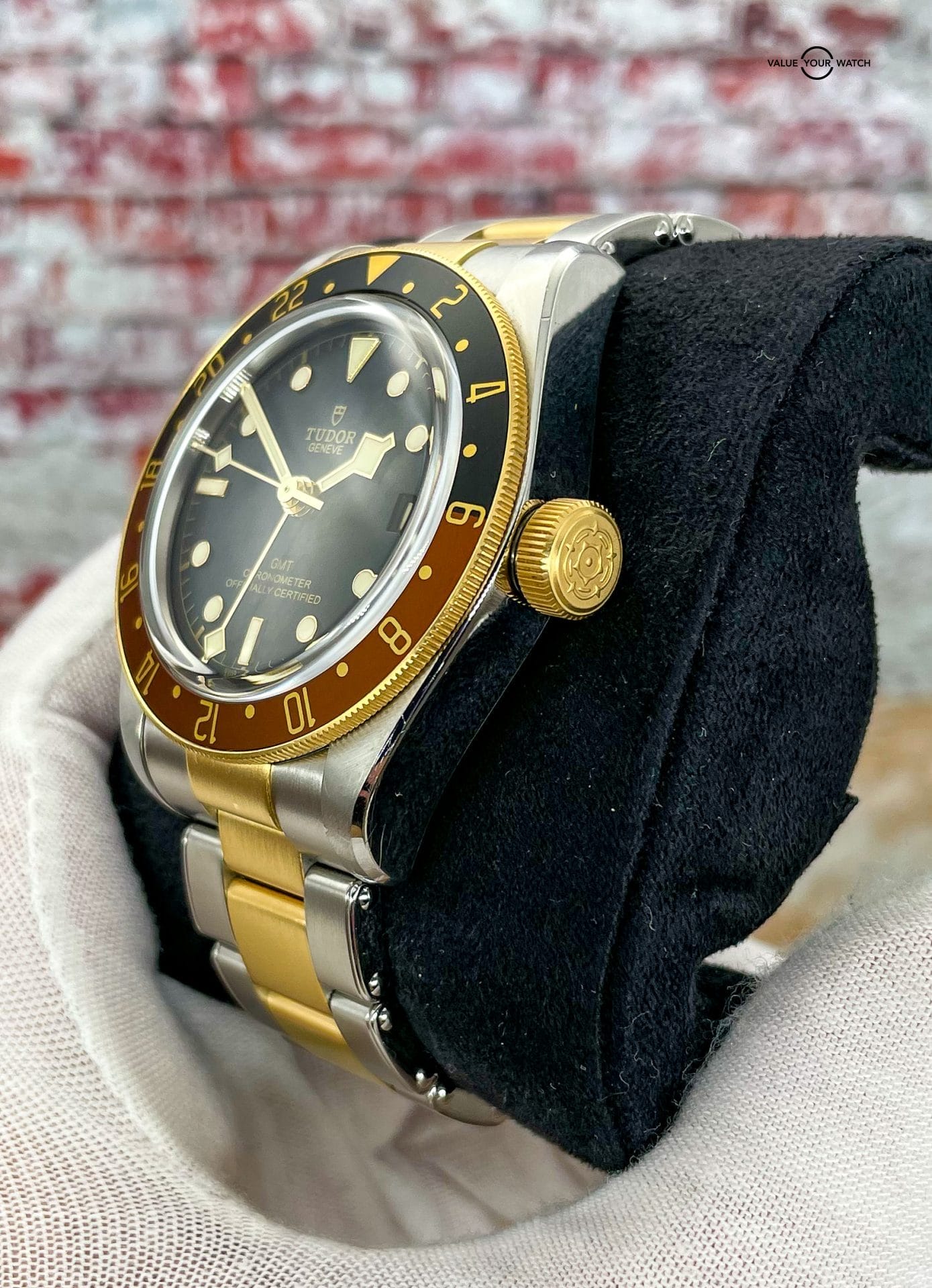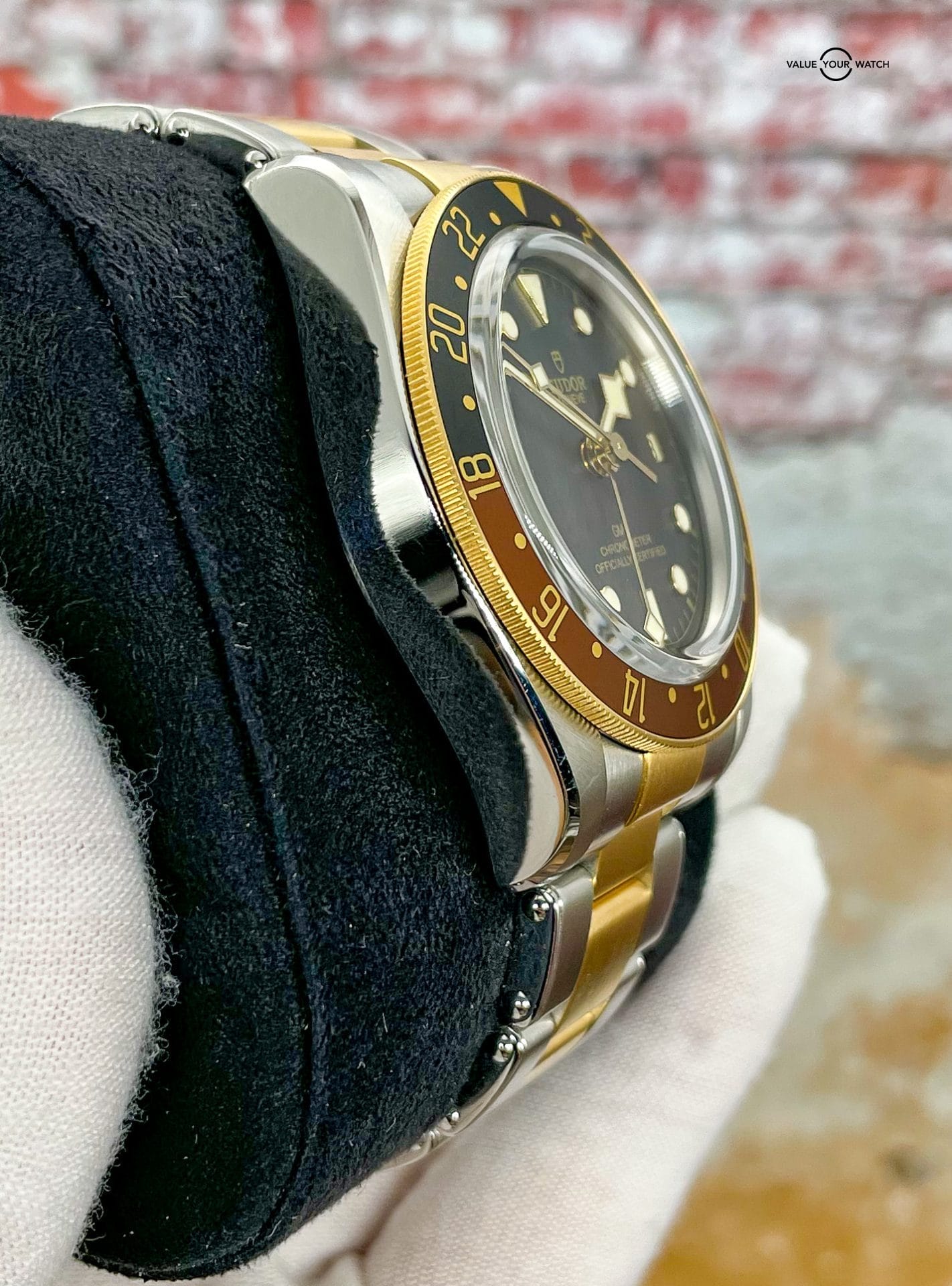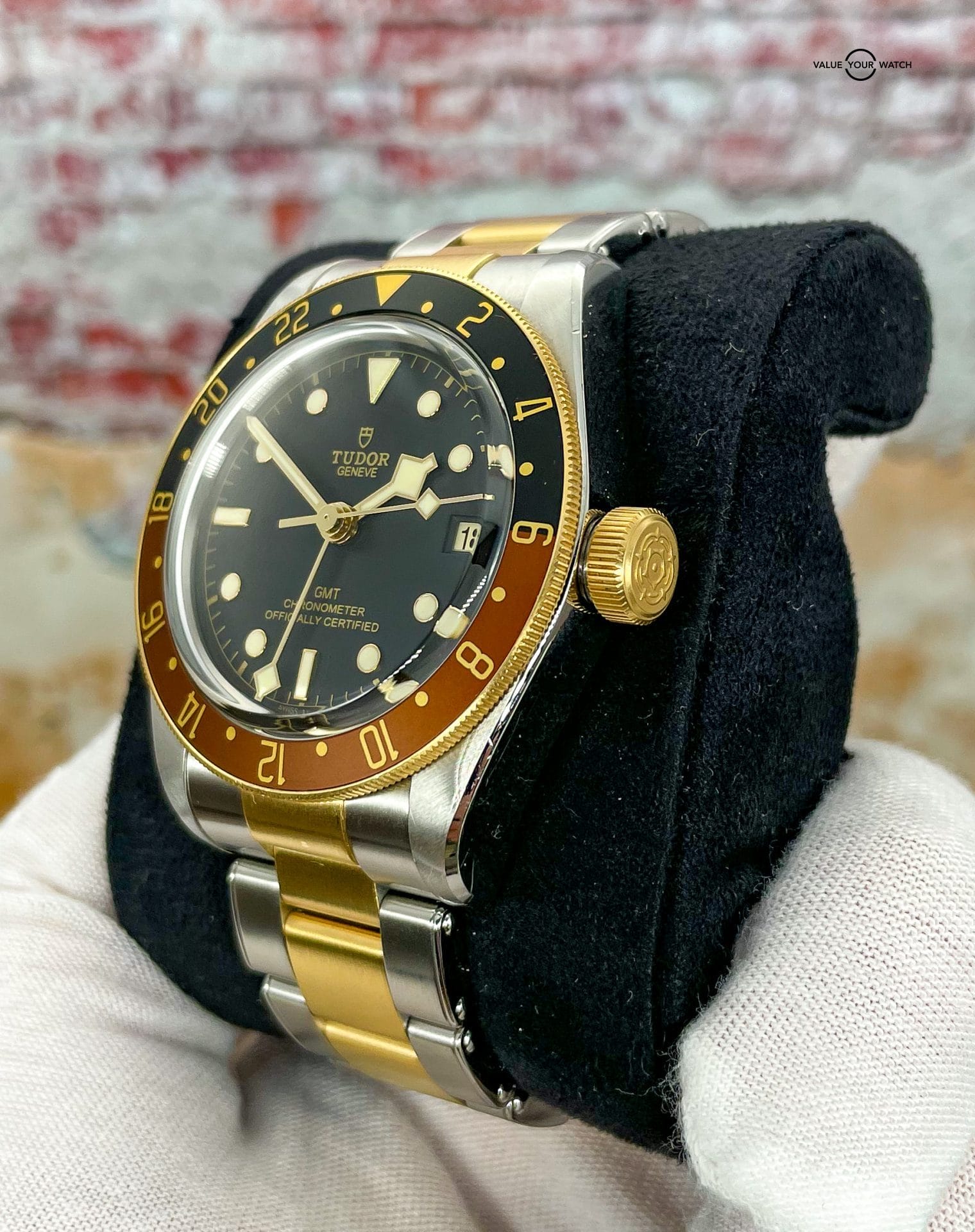 Offered by NoVA Watch Supply of Fairfax, VA: A good condition Tudor Black Bay GMT S&G “Root beer” watch, Ref # M79833MN-0001, Circa 2022. If you’ve been looking for the perfect daily piece, you need to stop right here! The Tudor Black Bay GMT S&G has it all. The two tone style is classic, the GMT function is a great tool for those who deal internationally, travel, or just like to keep track of time in another timezone, and the black and brown bezel work with any outfit and in any season. Personally I think this is one of the best bang for your buck luxury pieces between the mix metals, functionality and with Tudor being the little brother to Rolex, it feels amazing on the wrist just like its sibling but at a fraction of the price. This piece comes with the following: