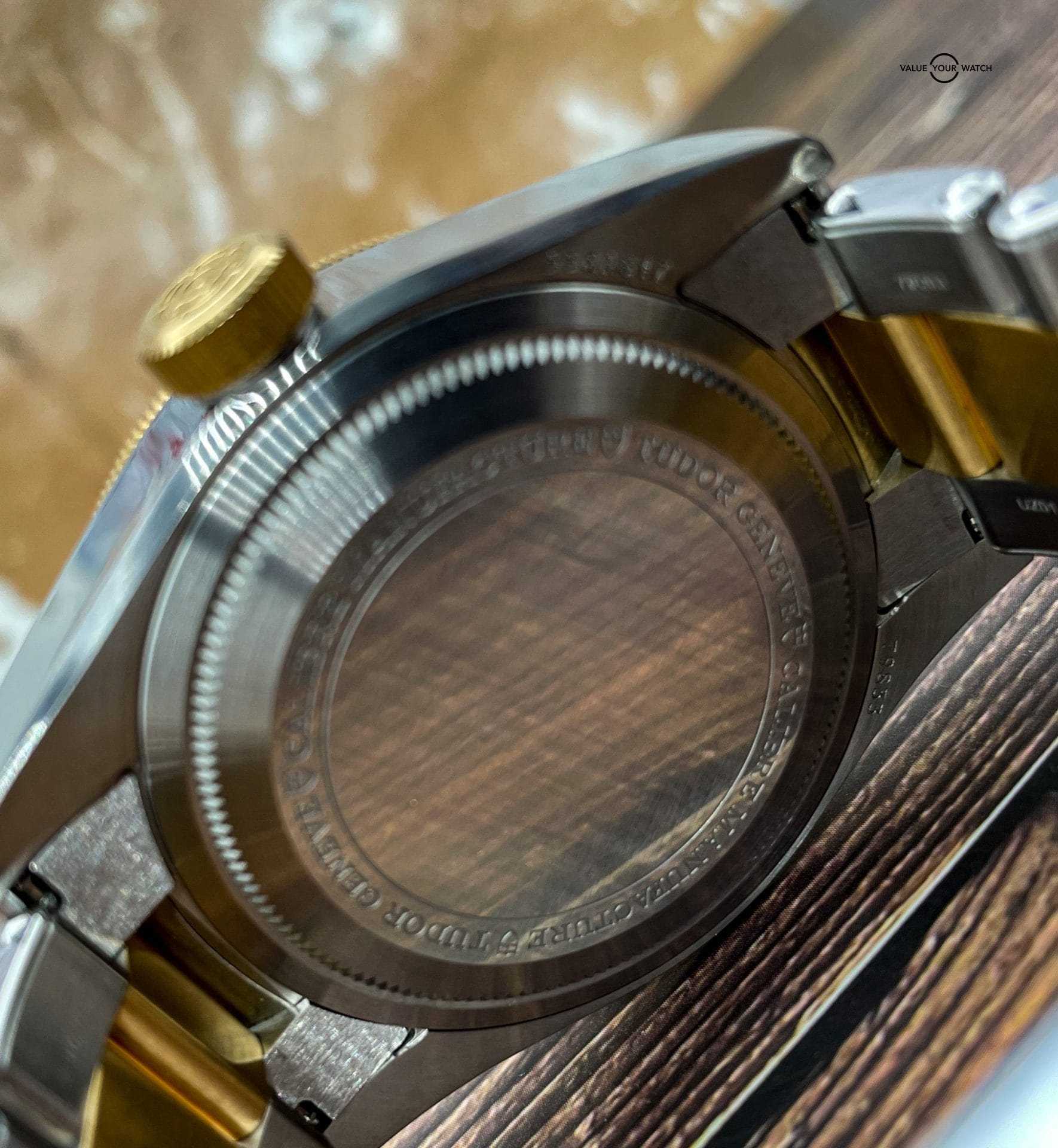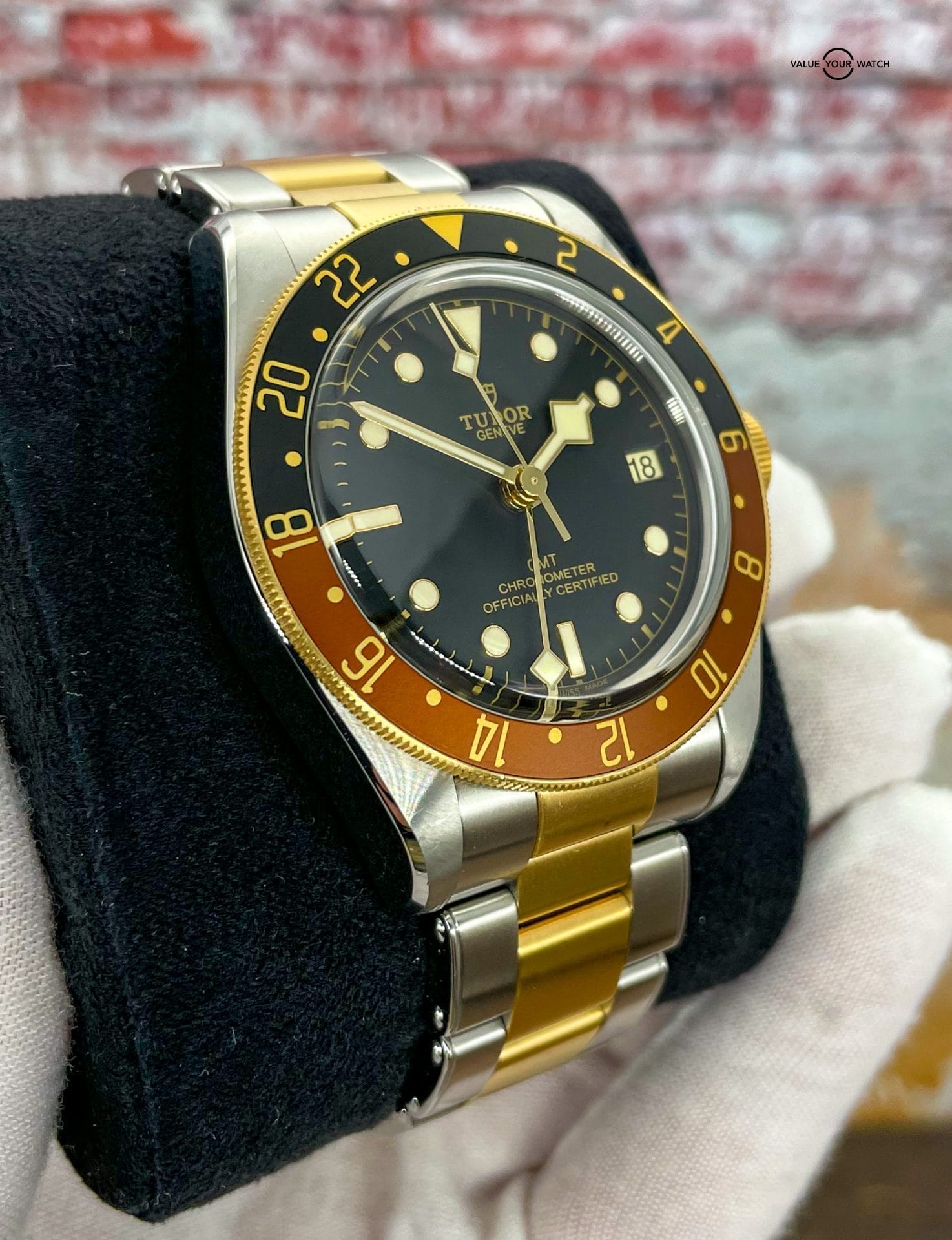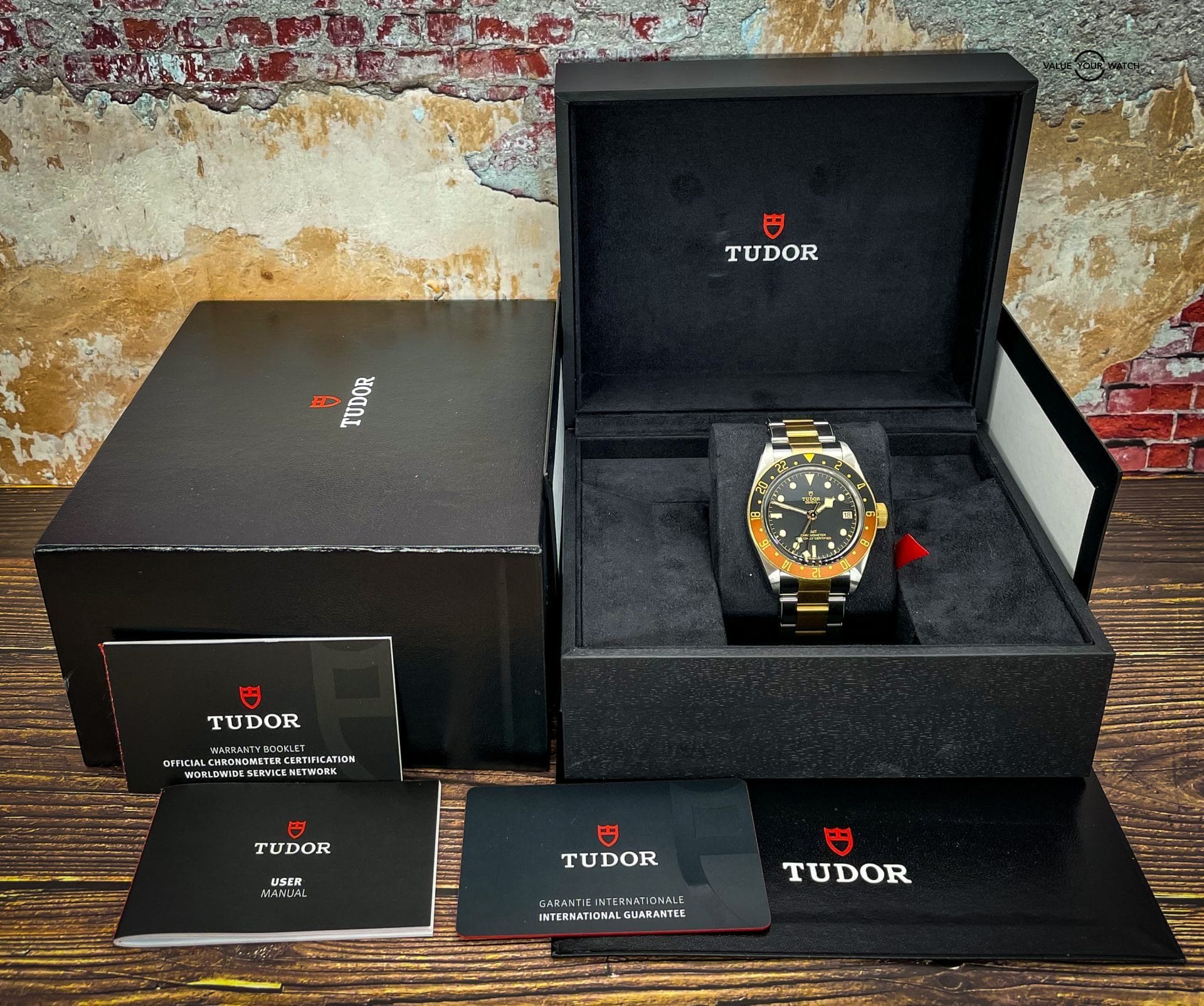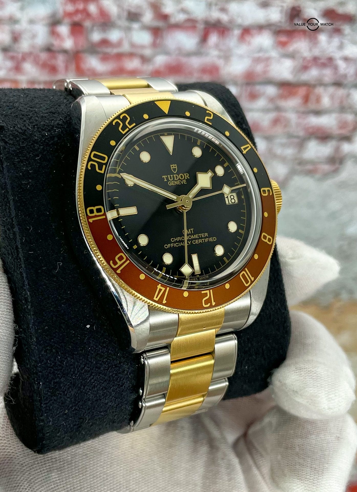 Offered by NoVA Watch Supply of Fairfax, VA: A good condition Tudor Black Bay GMT S&G “Root beer” watch, Ref # M79833MN-0001, Circa 2022. If you’ve been looking for the perfect daily piece, you need to stop right here! The Tudor Black Bay GMT S&G has it all. The two tone style is classic, the GMT function is a great tool for those who deal internationally, travel, or just like to keep track of time in another timezone, and the black and brown bezel work with any outfit and in any season. Personally I think this is one of the best bang for your buck luxury pieces between the mix metals, functionality and with Tudor being the little brother to Rolex, it feels amazing on the wrist just like its sibling but at a fraction of the price. This piece comes with the following: