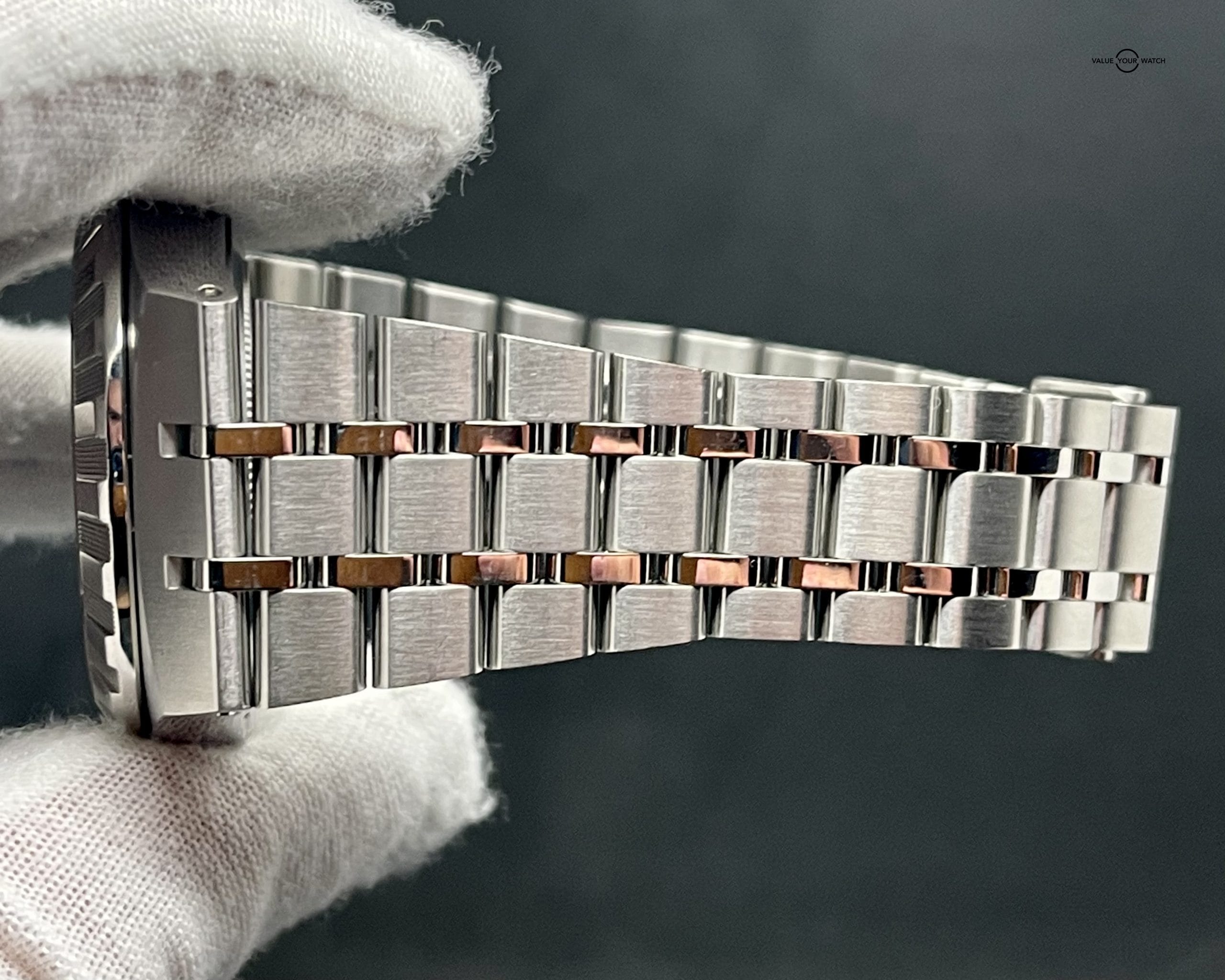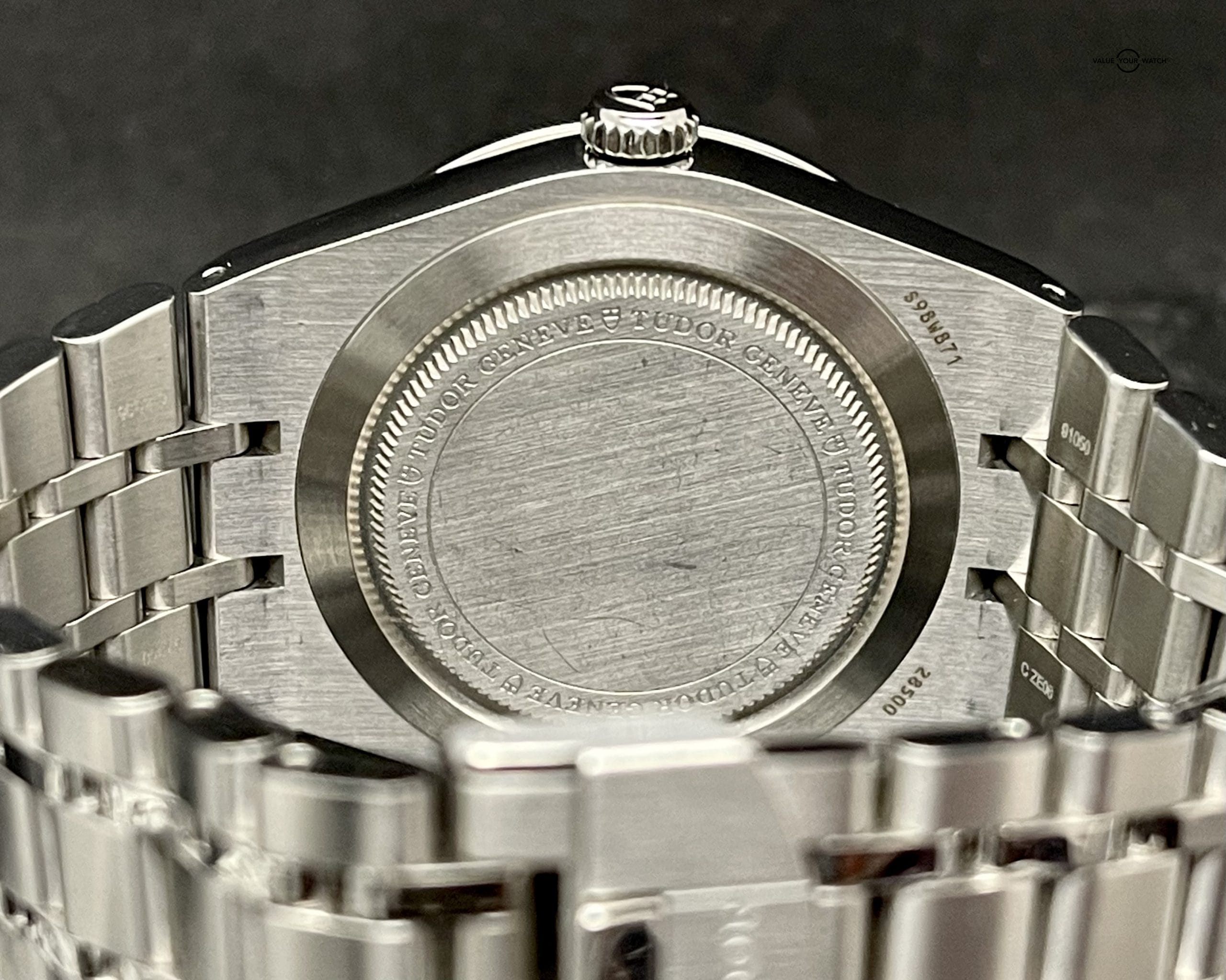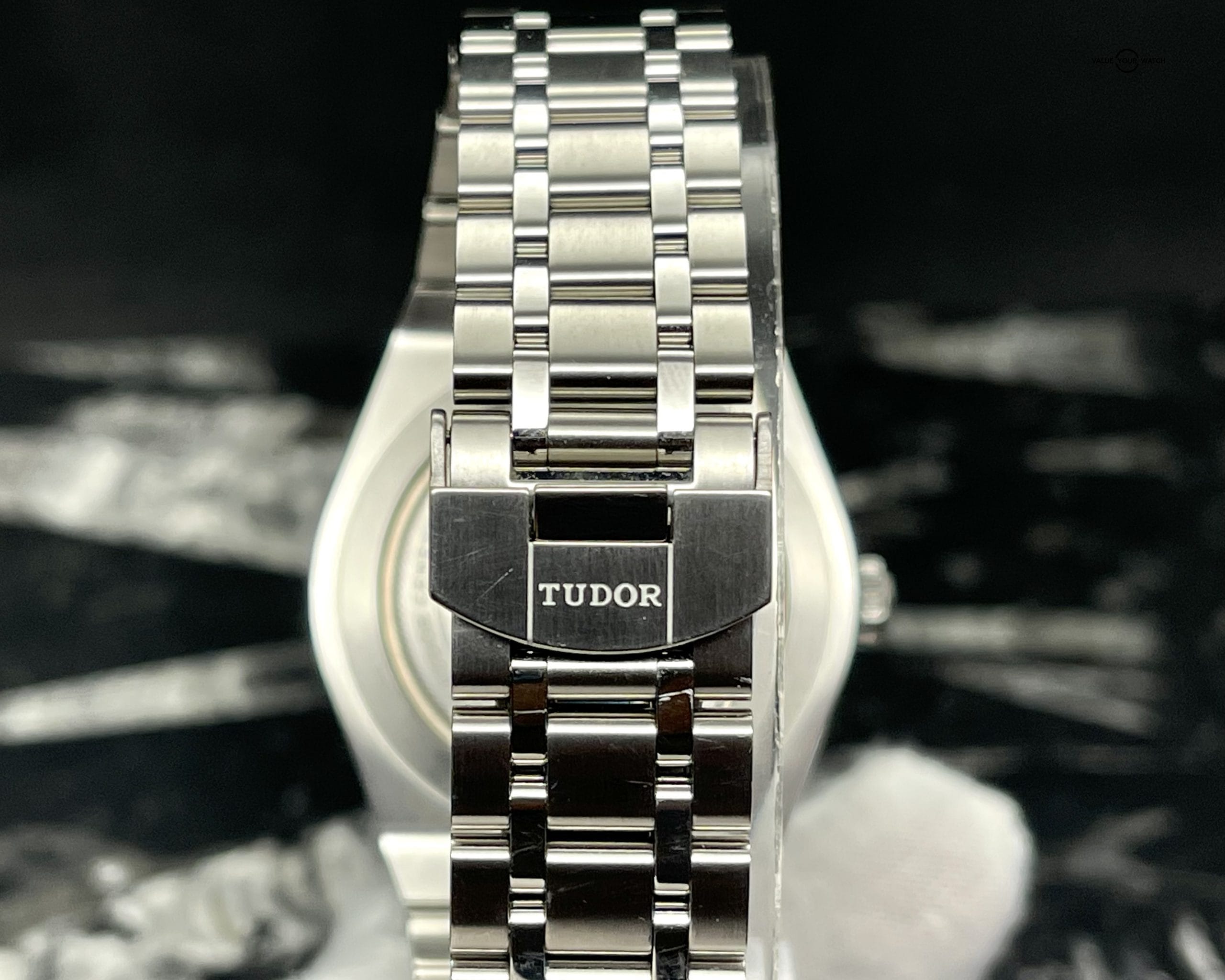 This watch comes with outer protective sleeve, inner protective foam, outer box, inner box, double hang tags, and extra links. The case shows some marks on the bottom lugs but is otherwise fairly clear, the bracelet and buckle are in great shape aside from some wear concentrated to the top links, and the sapphire crystal is flawless. Get this beautiful pre-owned time piece before it’s gone!