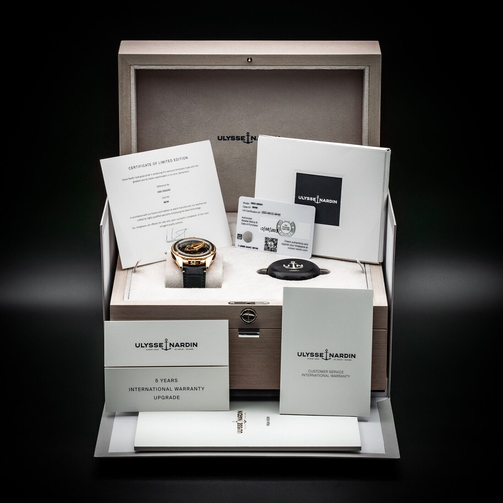 It will come as a complete set with all boxes and paperwork. Certificates, warranty card, warranty booklet, manual, winding tool, everything. This watch was purchased brand new on December 9th, 2023 and was never worn. The 5 year UN warranty will be valid until December 2028.