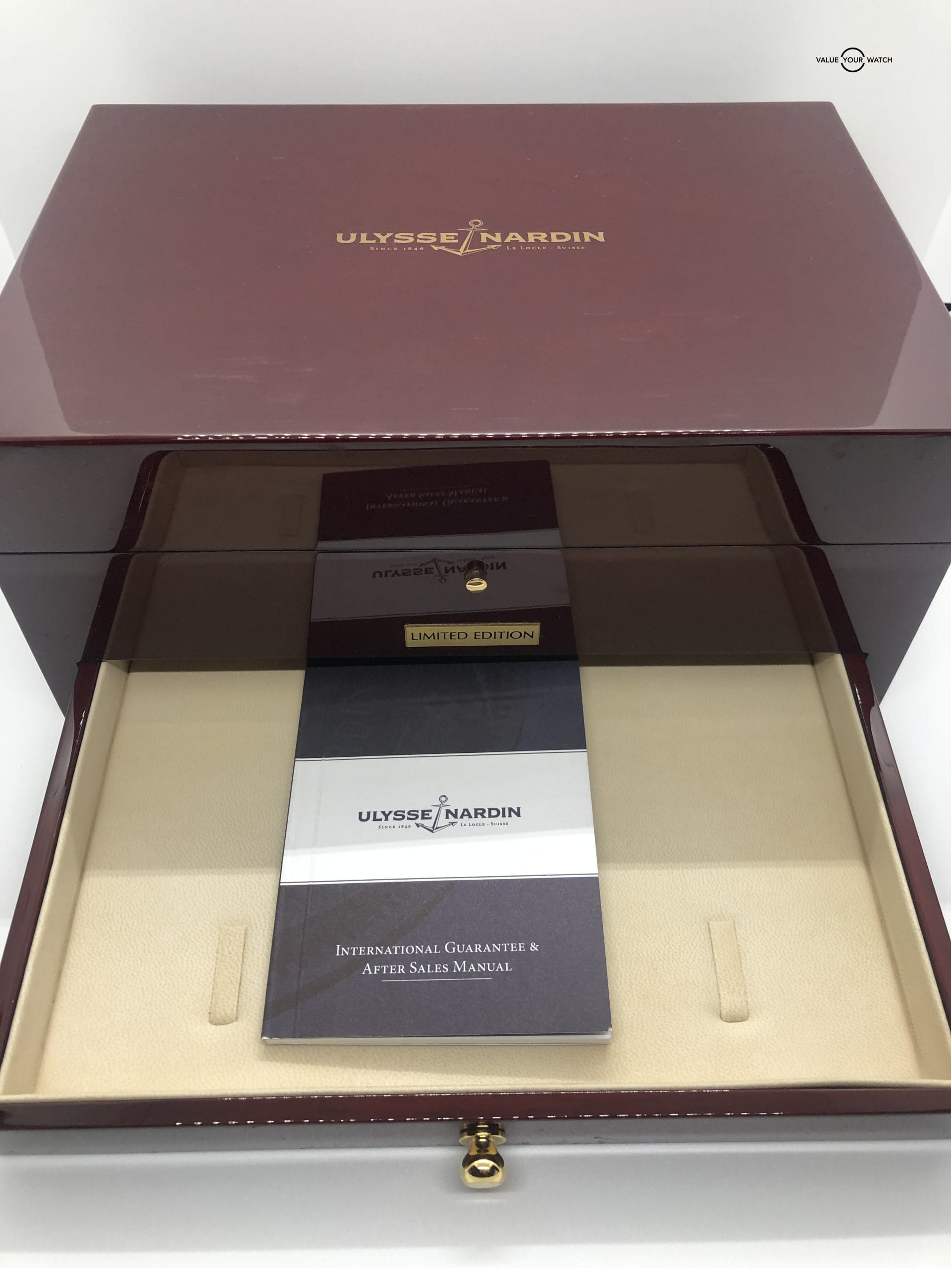 For your consideration is the 45.8mm Ulysse Nardin Marine Perpetual Calendar in sapphire green. Rubber clad on stainless steel. Only 1 of 28 pieces ever created and only one in the United States.
