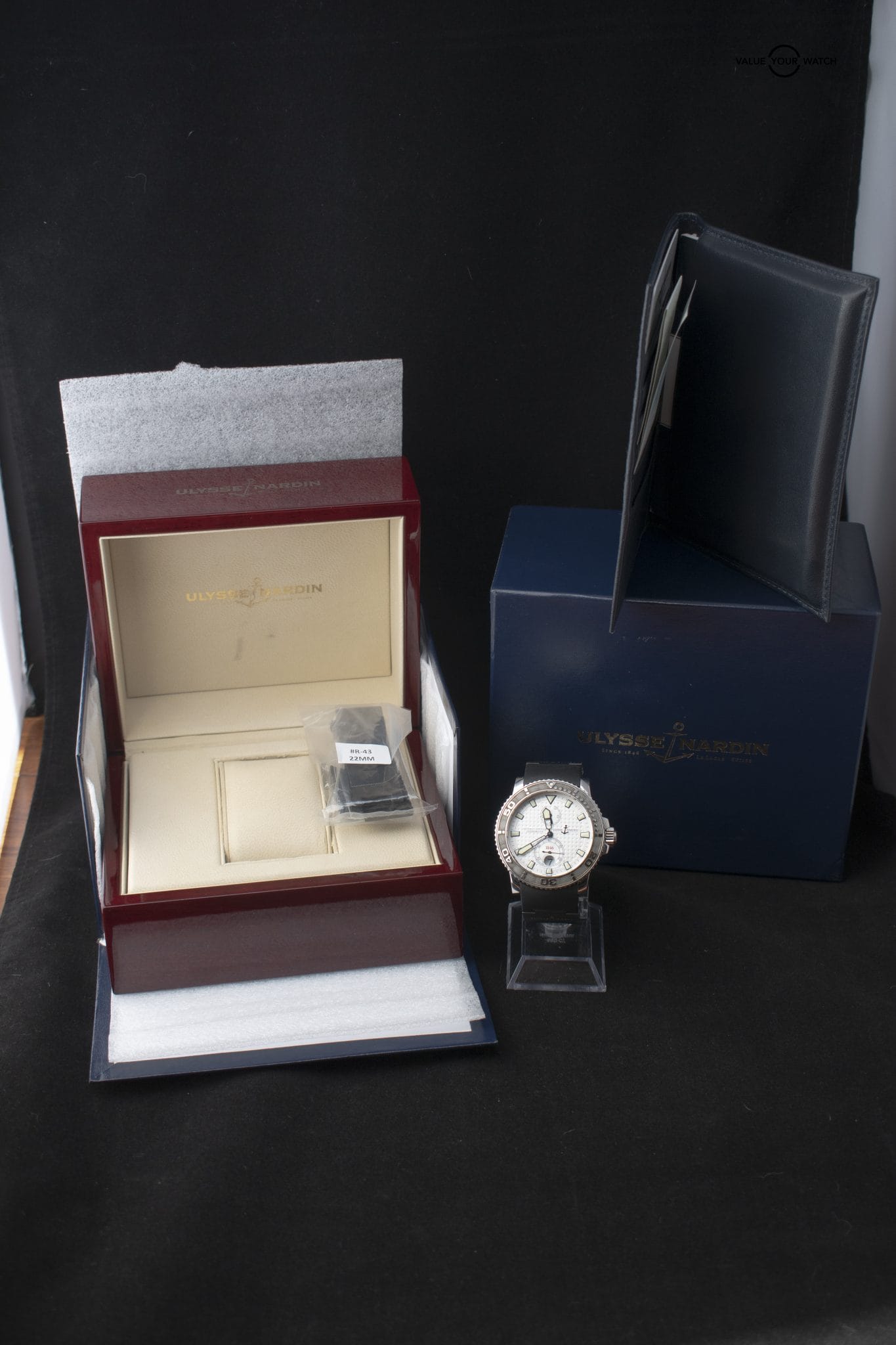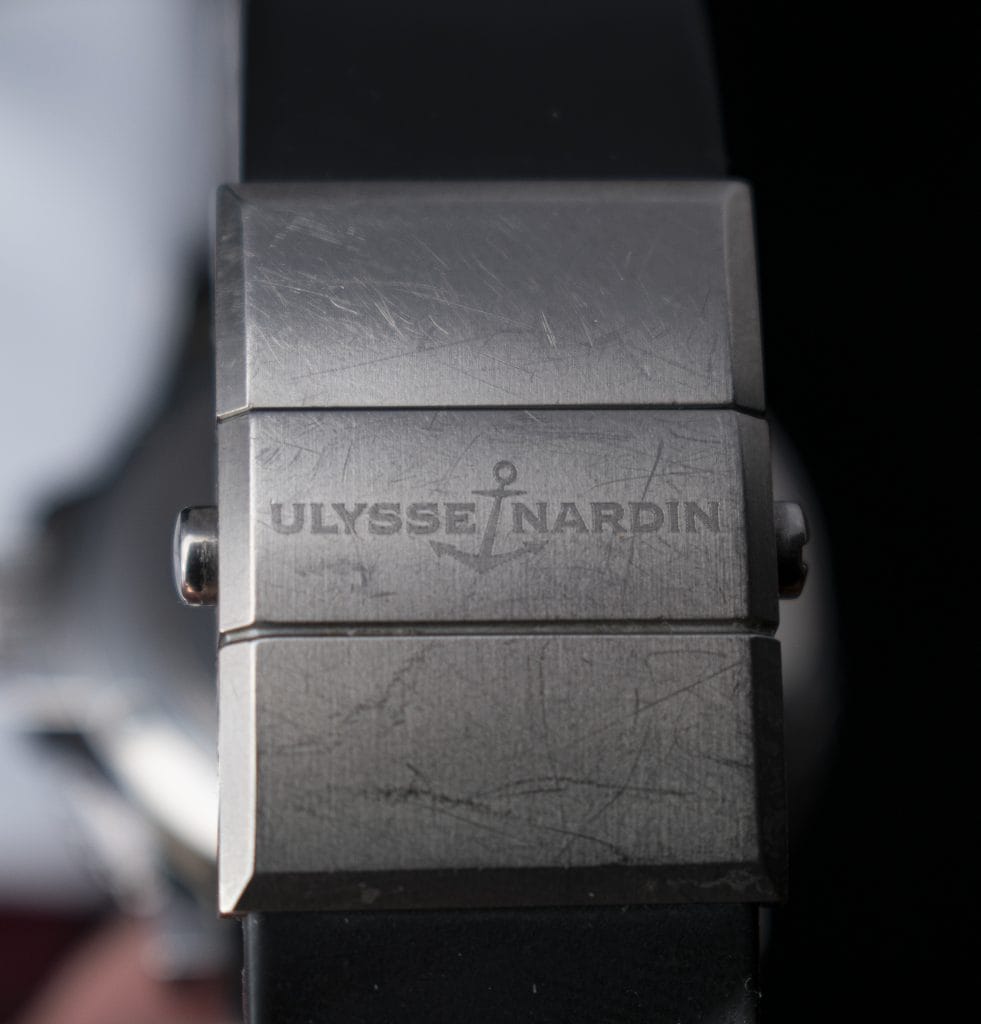 For sale is a Ulysse Nardin Maxi Marine chronometer with a stunning silver dial and black rubber deployment strap. The timepiece is in great condition with some wear on the band hardware as shown in the photos. Please note that the band currently on the watch is sized at 7″; however there is an uncut rubber strap included with the sale so fit will not be an issue.