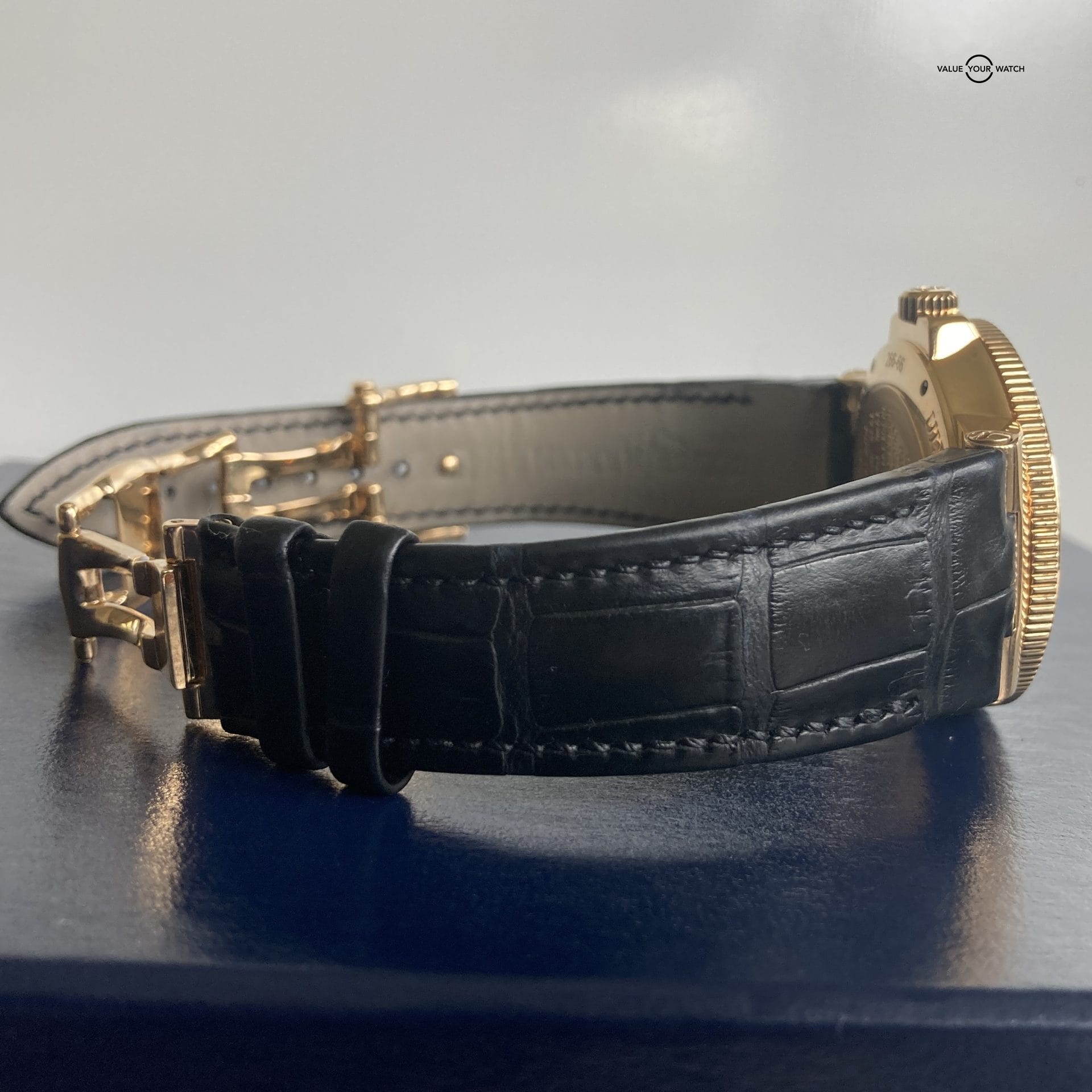 This Ulysse Nardin Maxi Marine Chronometer Ref: 266-66 wristwatch is a luxurious and elegant timepiece perfect for any occasion. The 41mm round case is made of 18k rose gold with a blue dial and Arabic numerals. It is fitted with a bolstered two-piece adjustable black leather strap with a butterfly clasp.