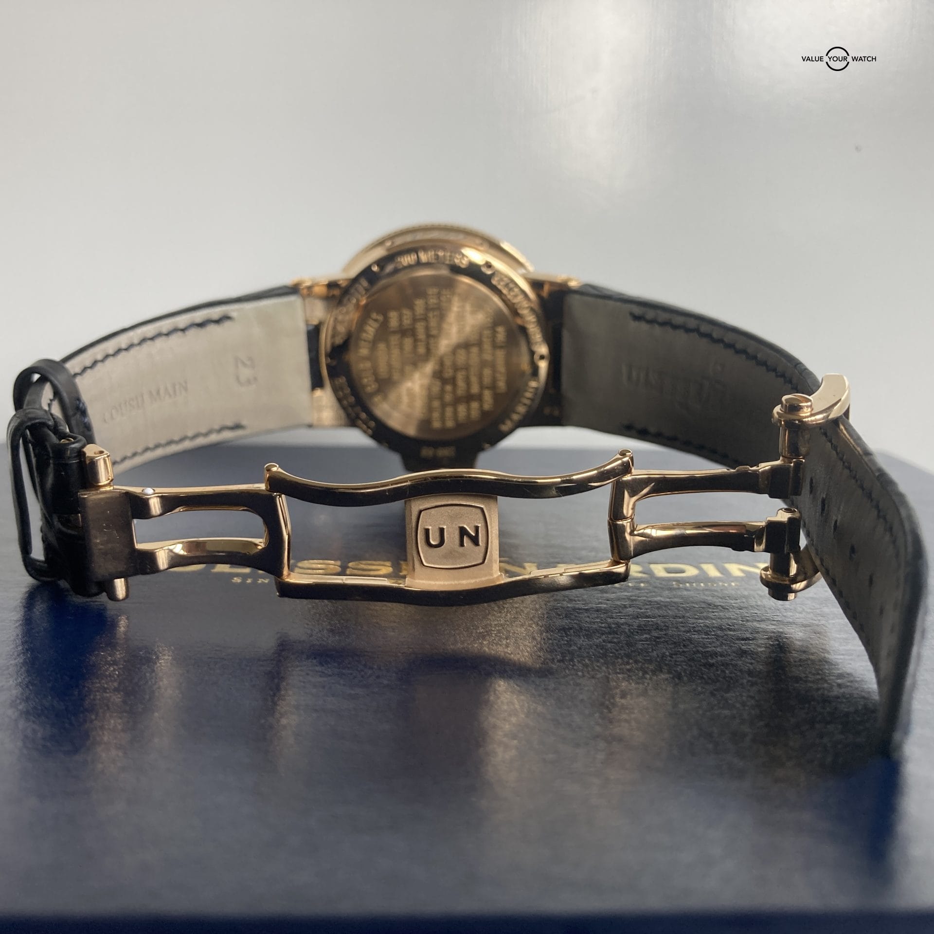 Design and Materials: This Ulysse Nardin watch features an 18k rose gold case, lending it a warm and luxurious appearance. The striking blue dial complements the rose gold accents, creating a visually appealing contrast. The watch is often accompanied by a blue alligator leather strap, adding to its sophistication.