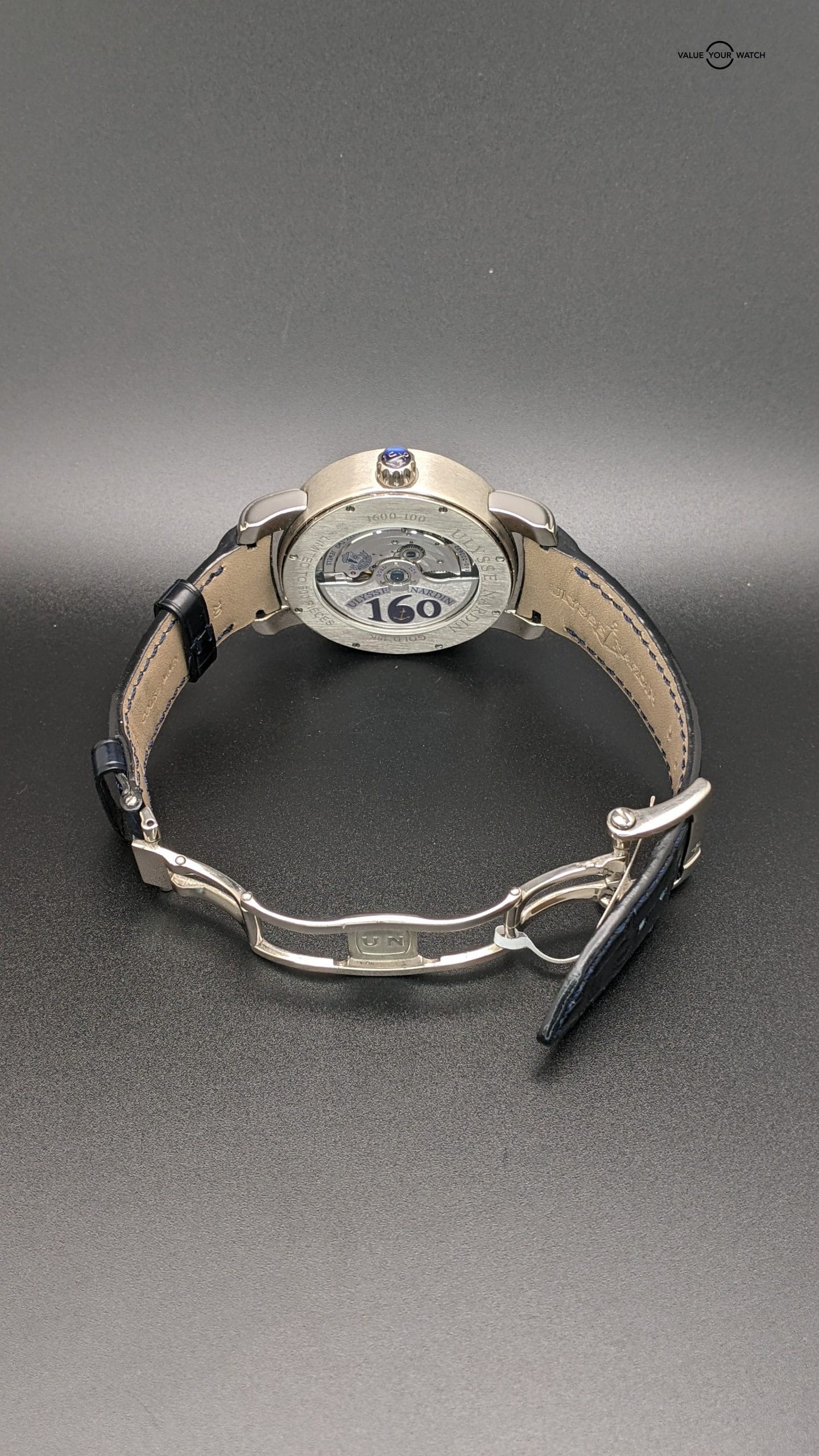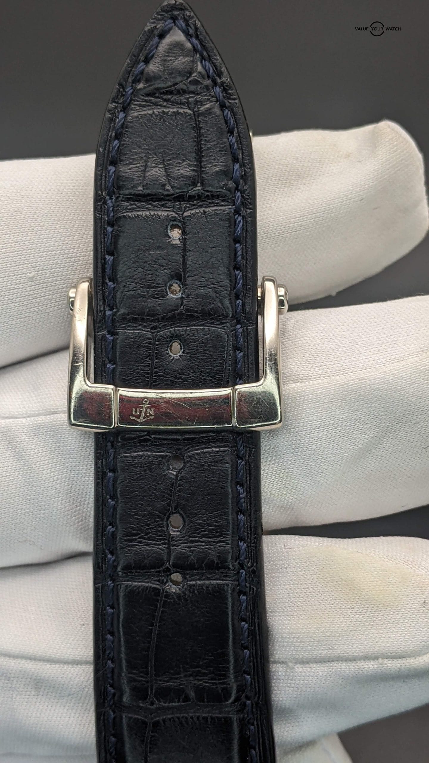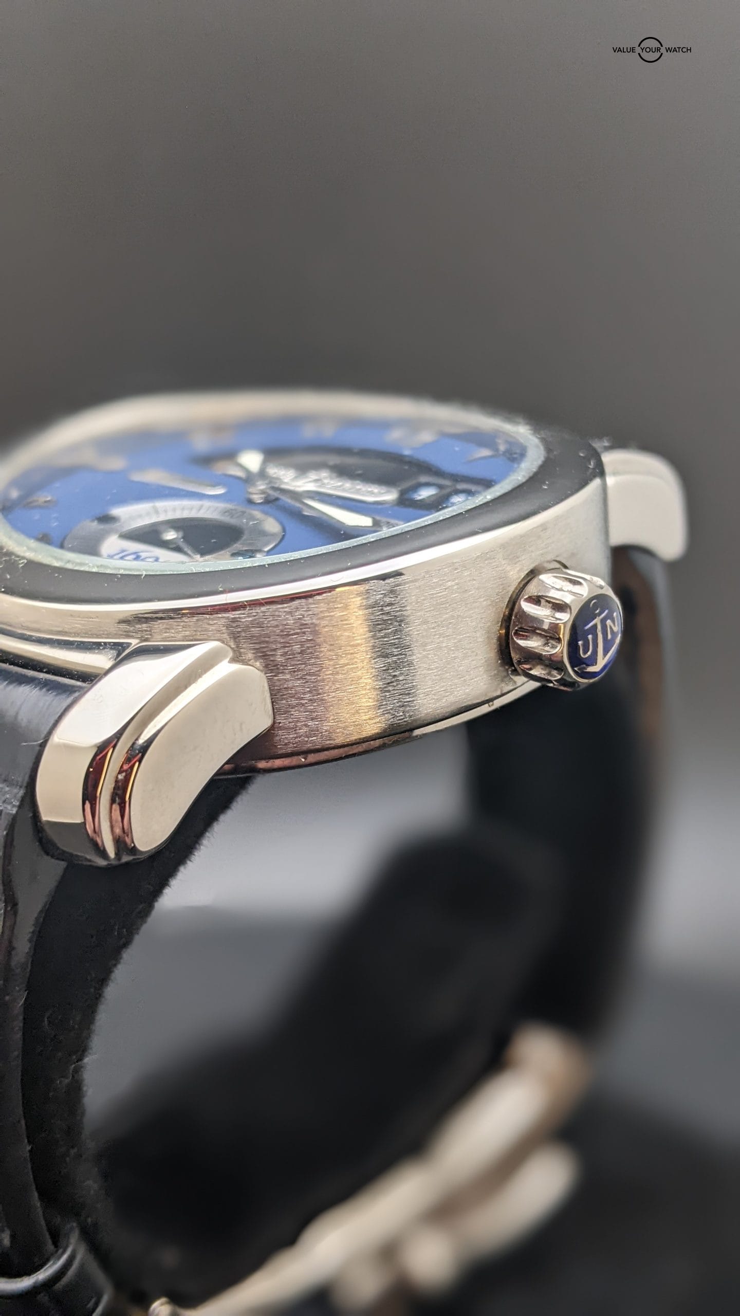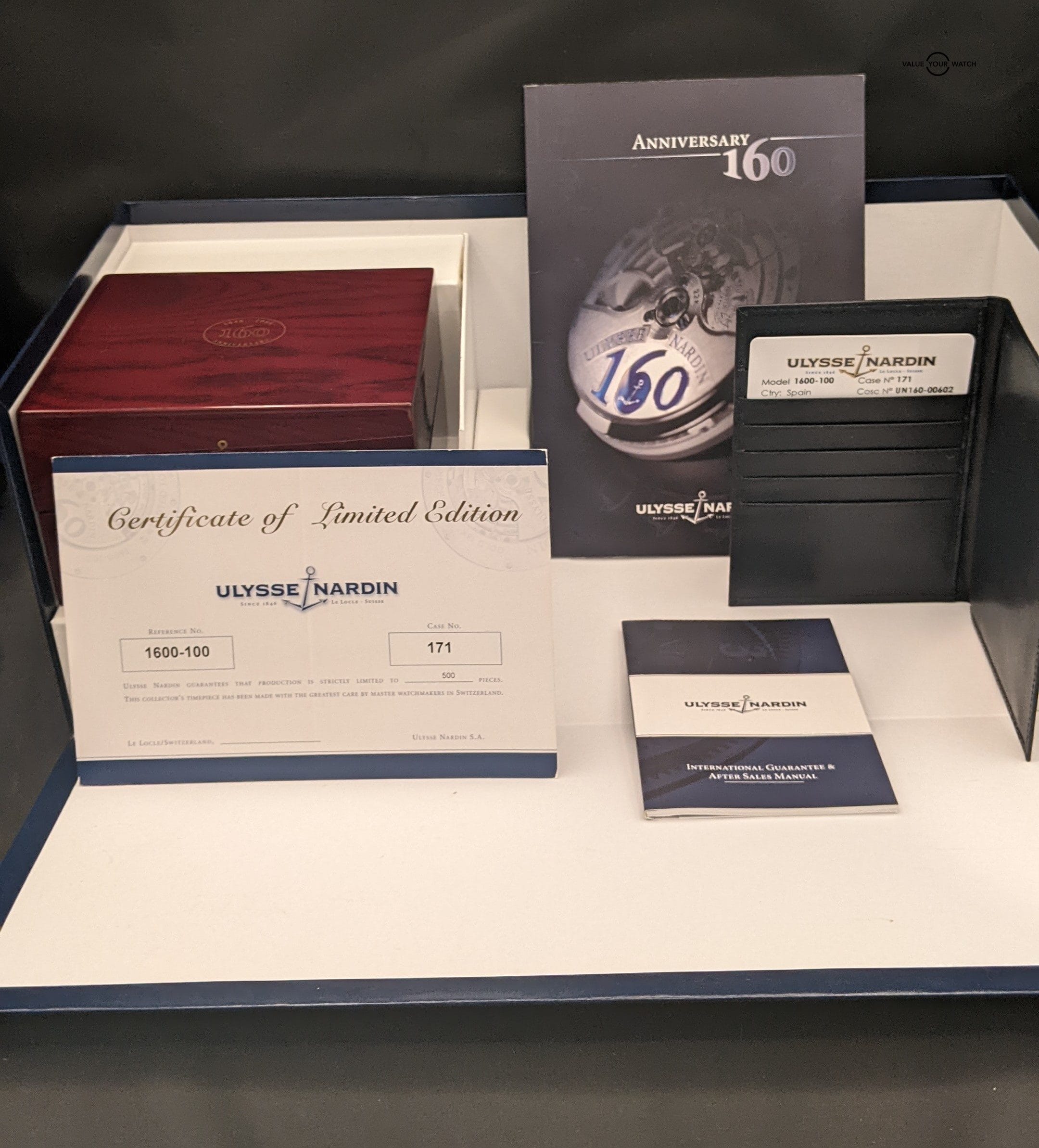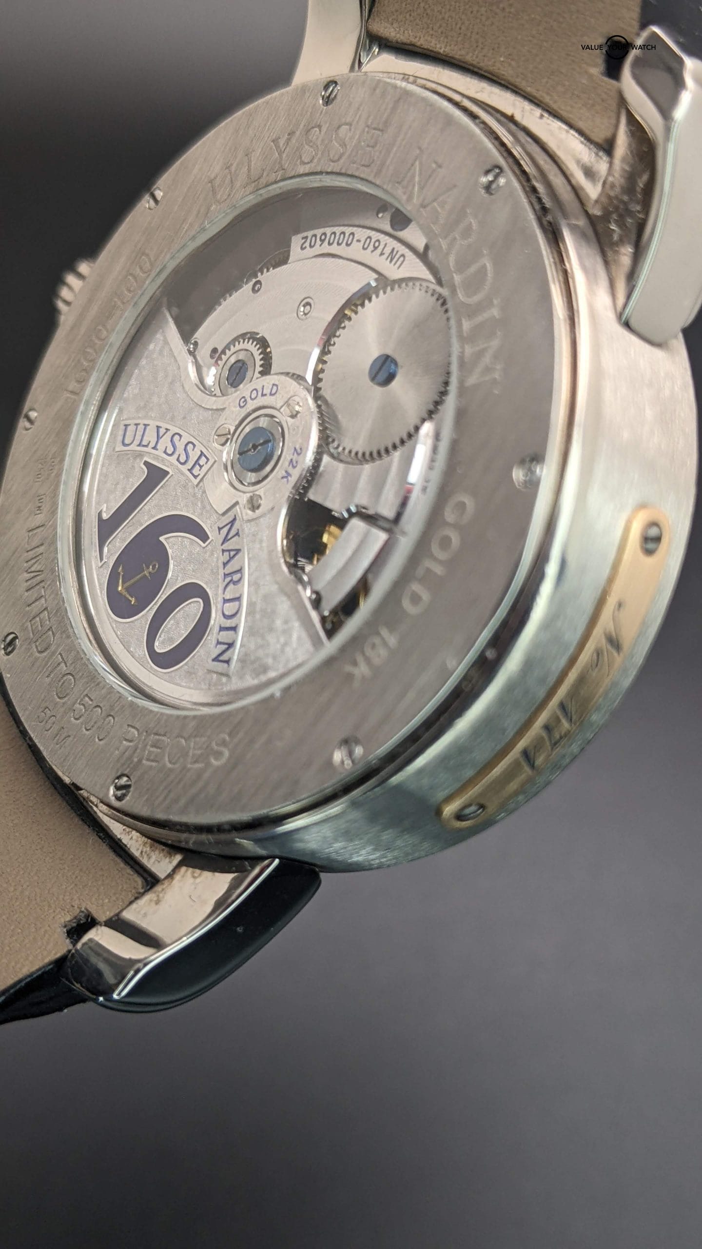 This watch is number 171 of 500 that were made in white gold for the 160 anniversary of Ulysse Nardin. These rare watches feature UNs first in-house designed and manufactured movement.