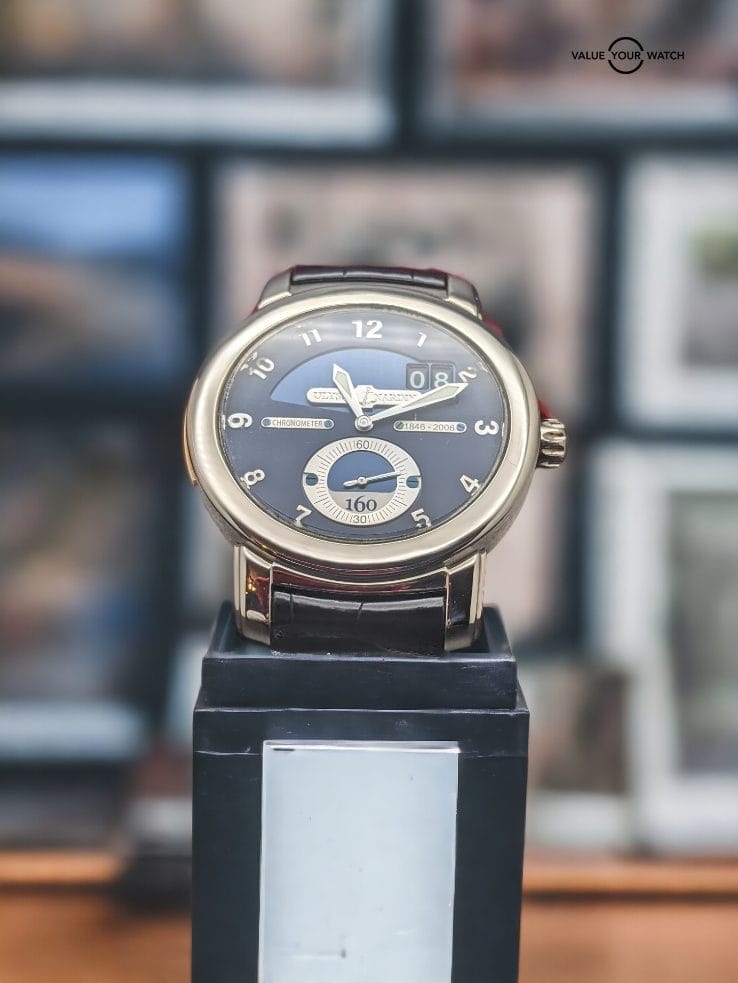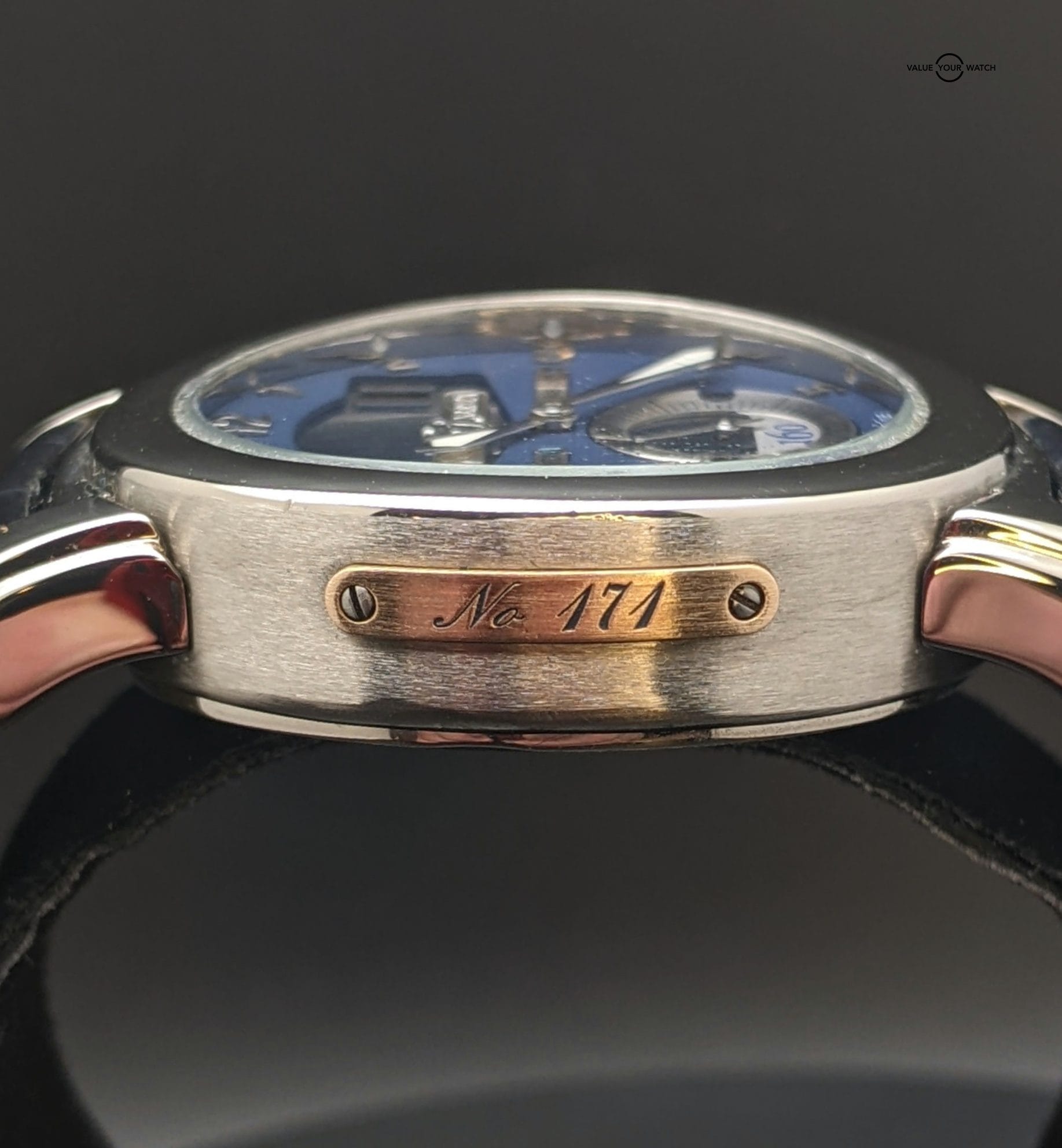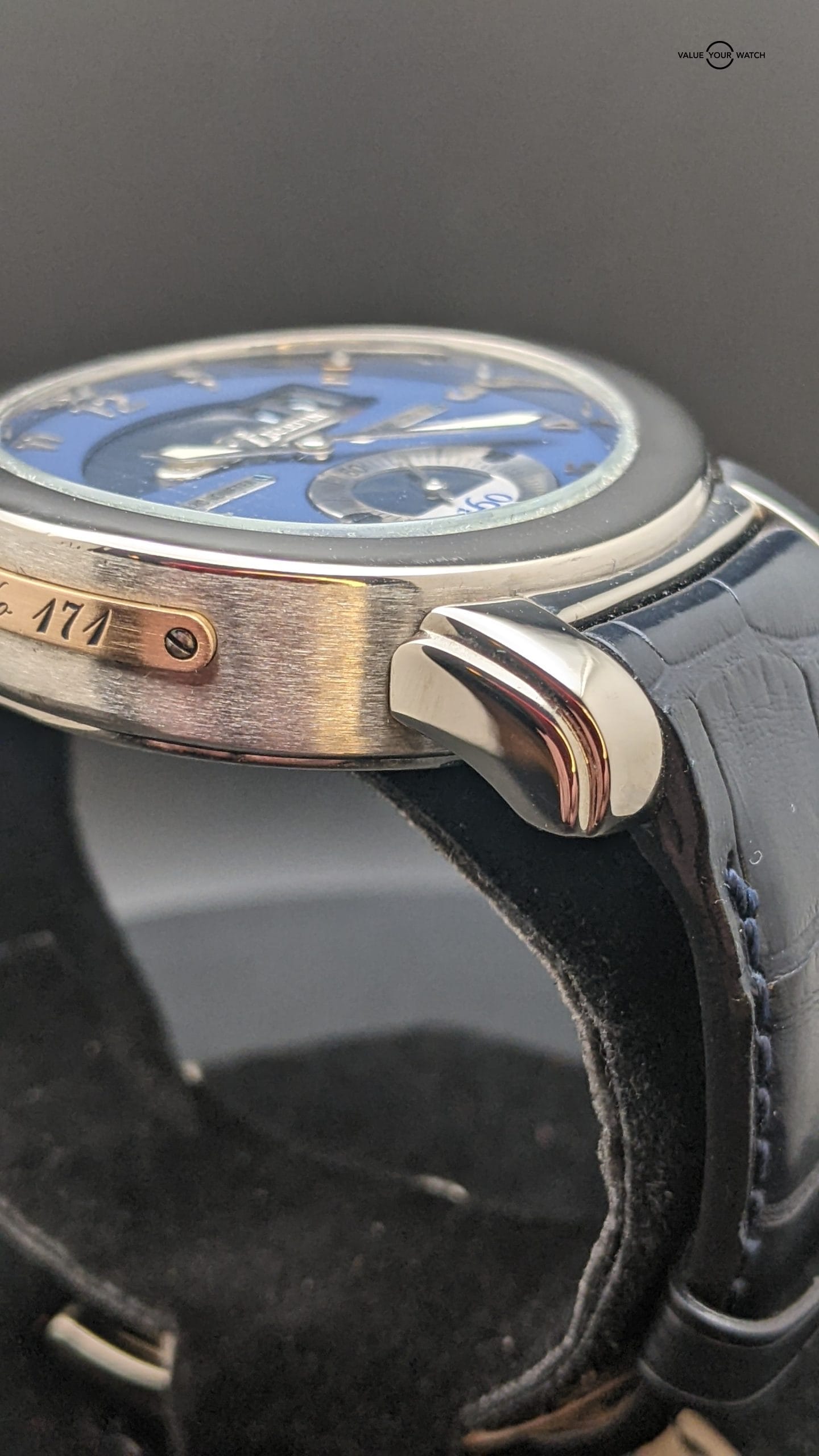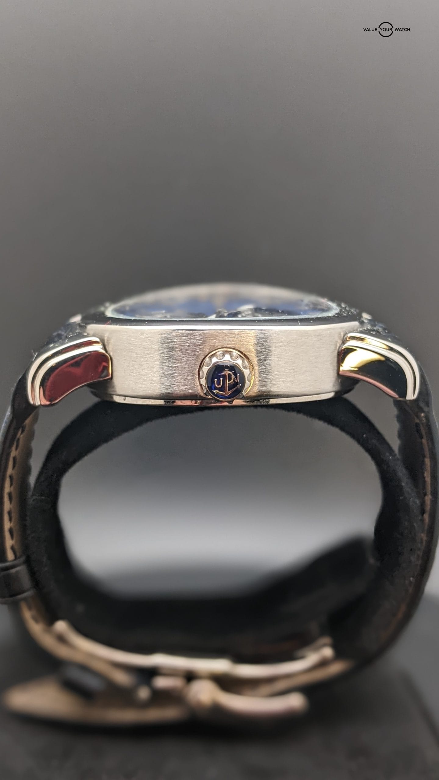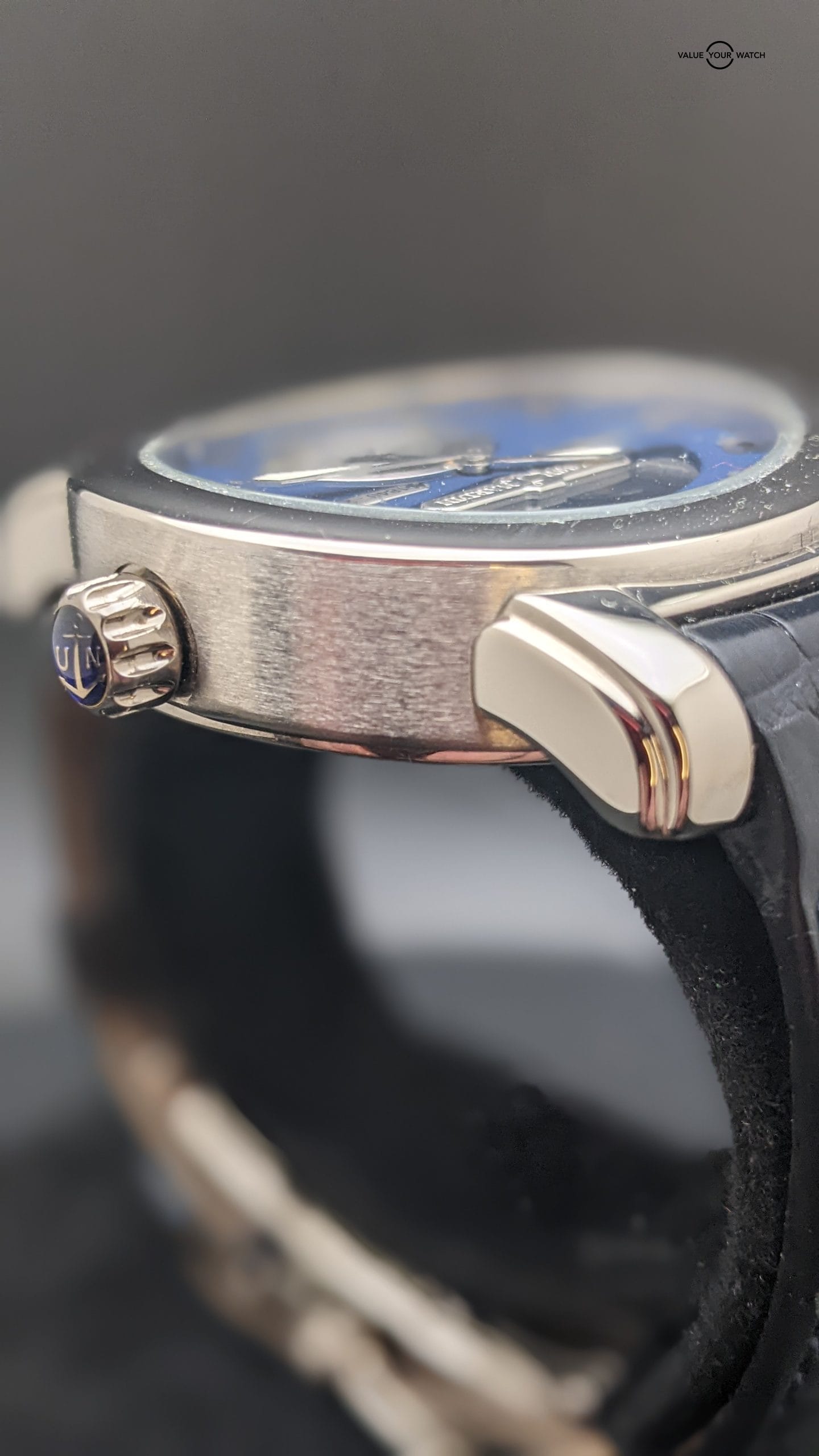 This watch is number 171 of 500 that were made in white gold for the 160 anniversary of Ulysse Nardin. These rare watches feature UNs first in-house designed and manufactured movement.