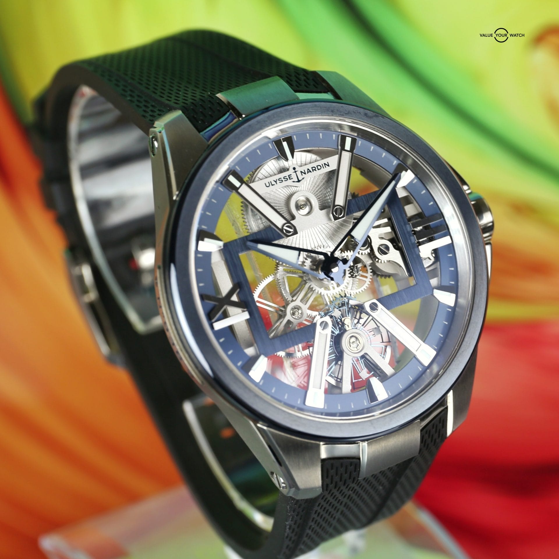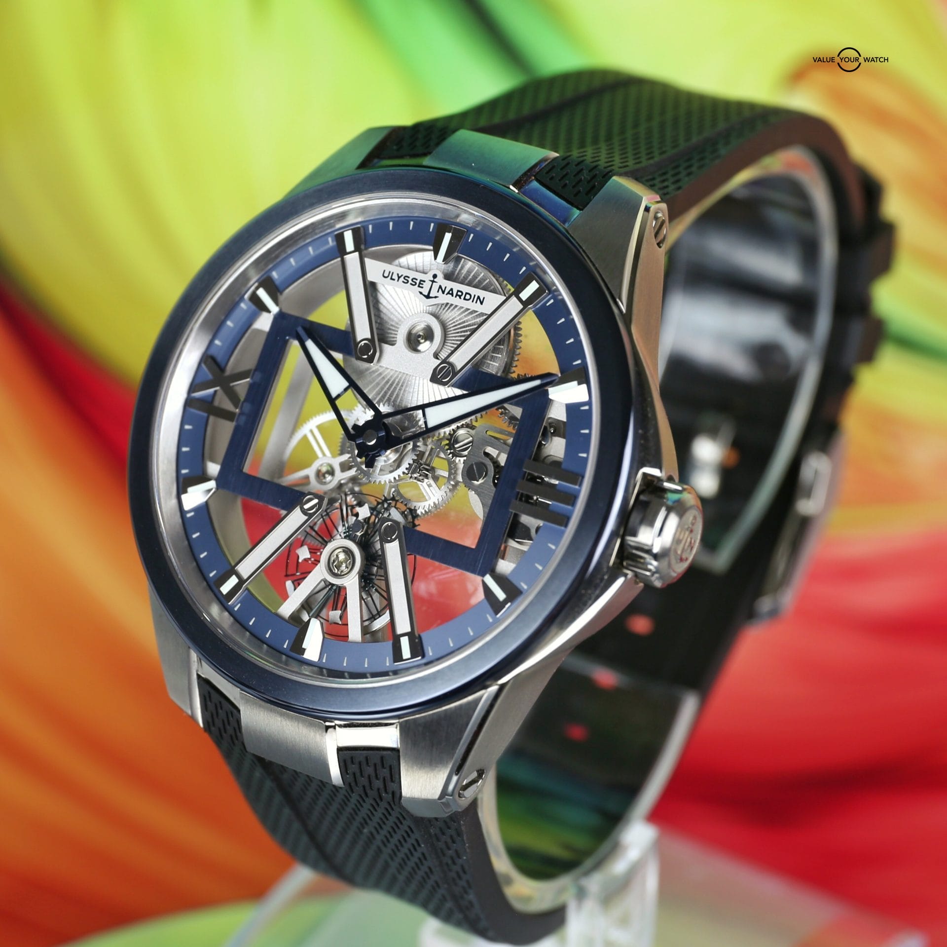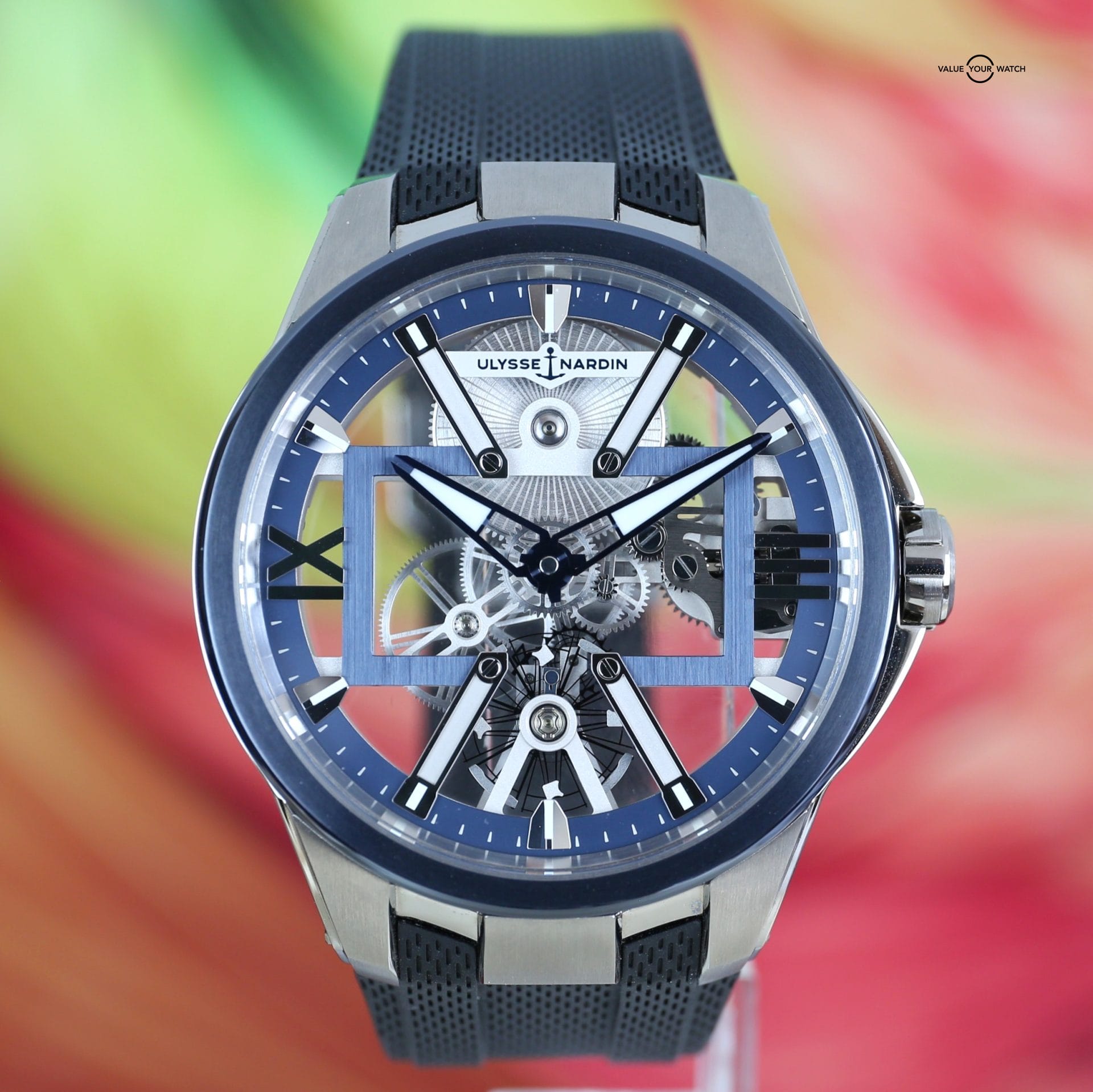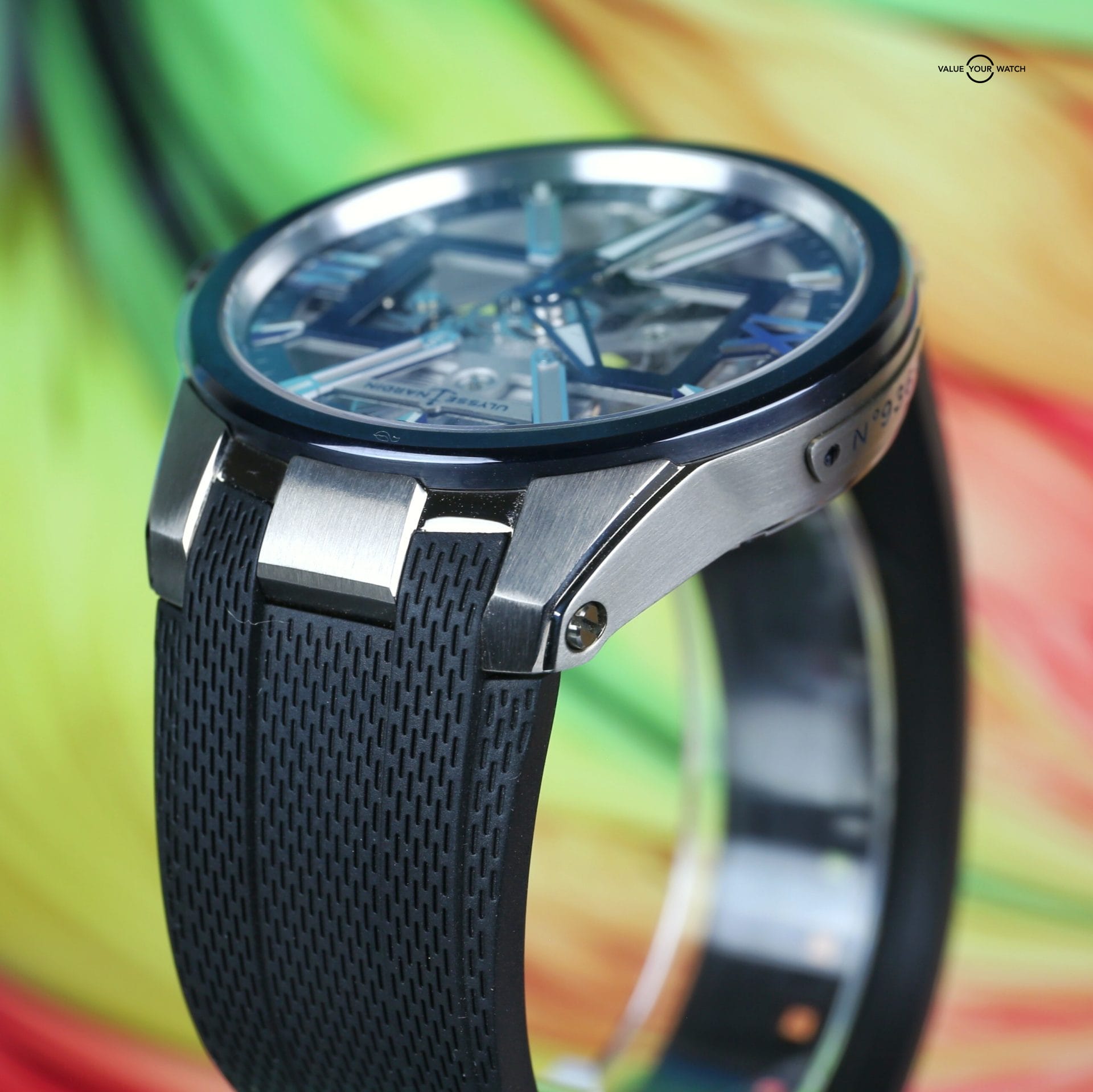 A pristine, near new, example of a Ulysse Nardin Blast Skeleton X 42mm Titanium case, with a brushed finished blue PVD coated bezel ring and rubber strap.