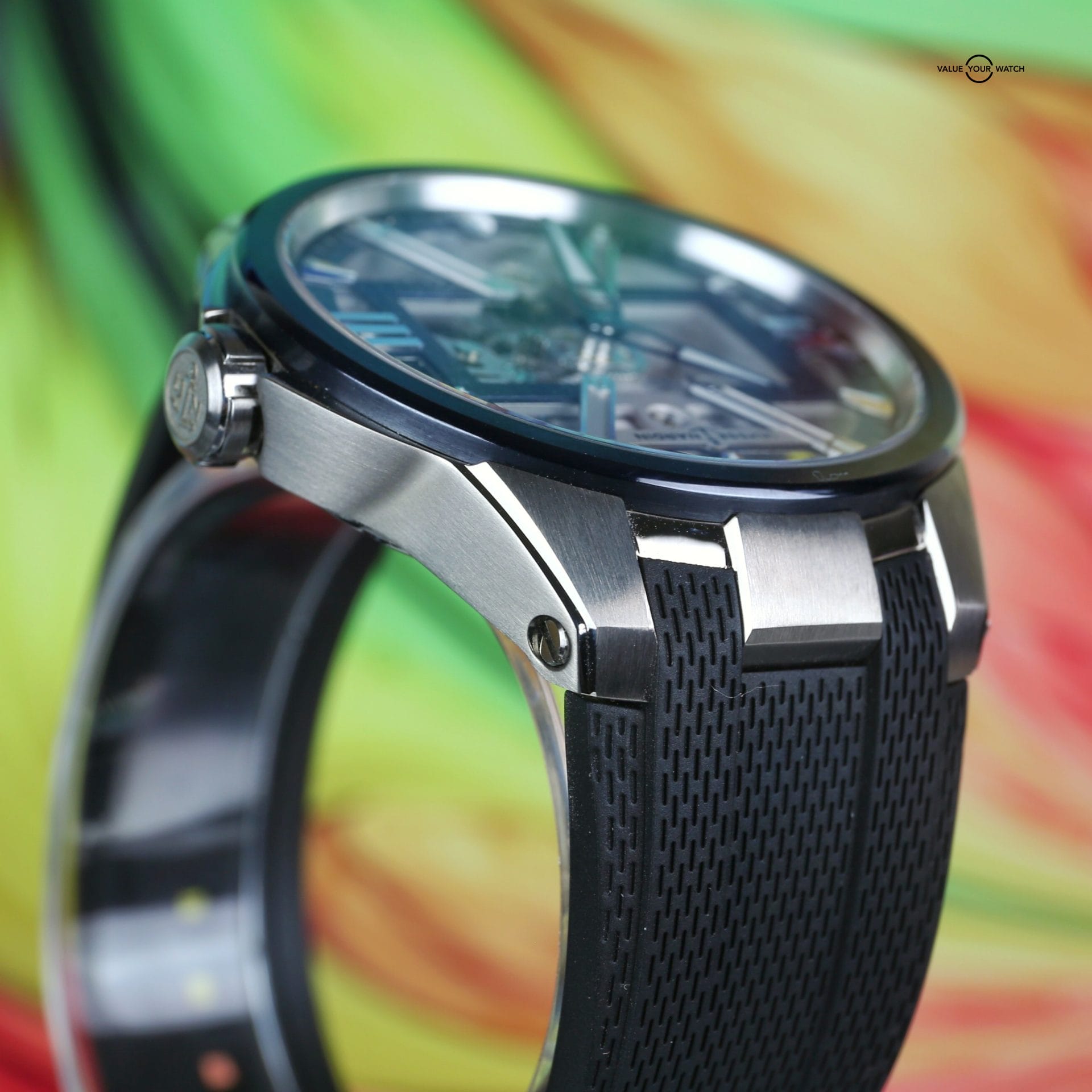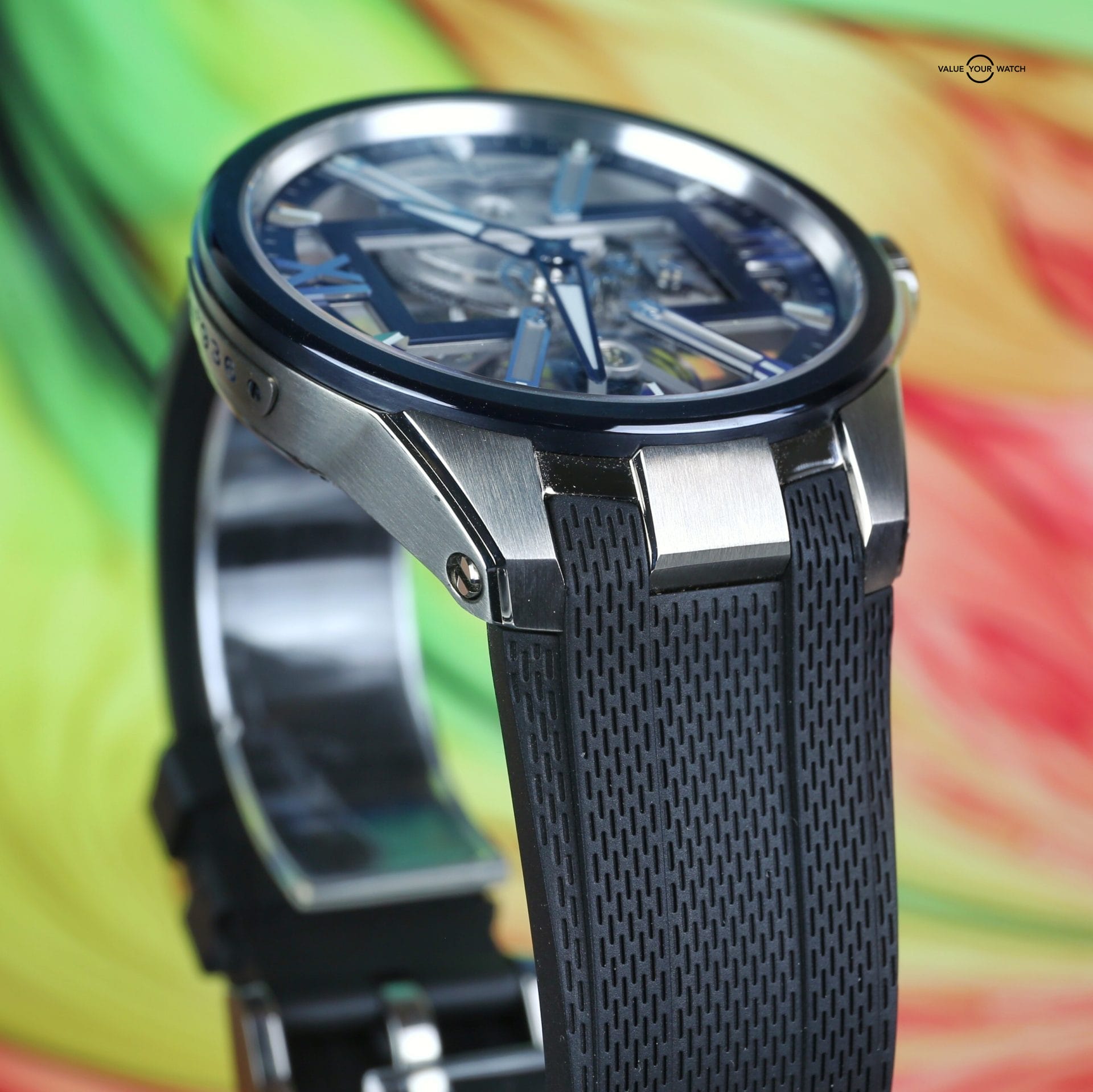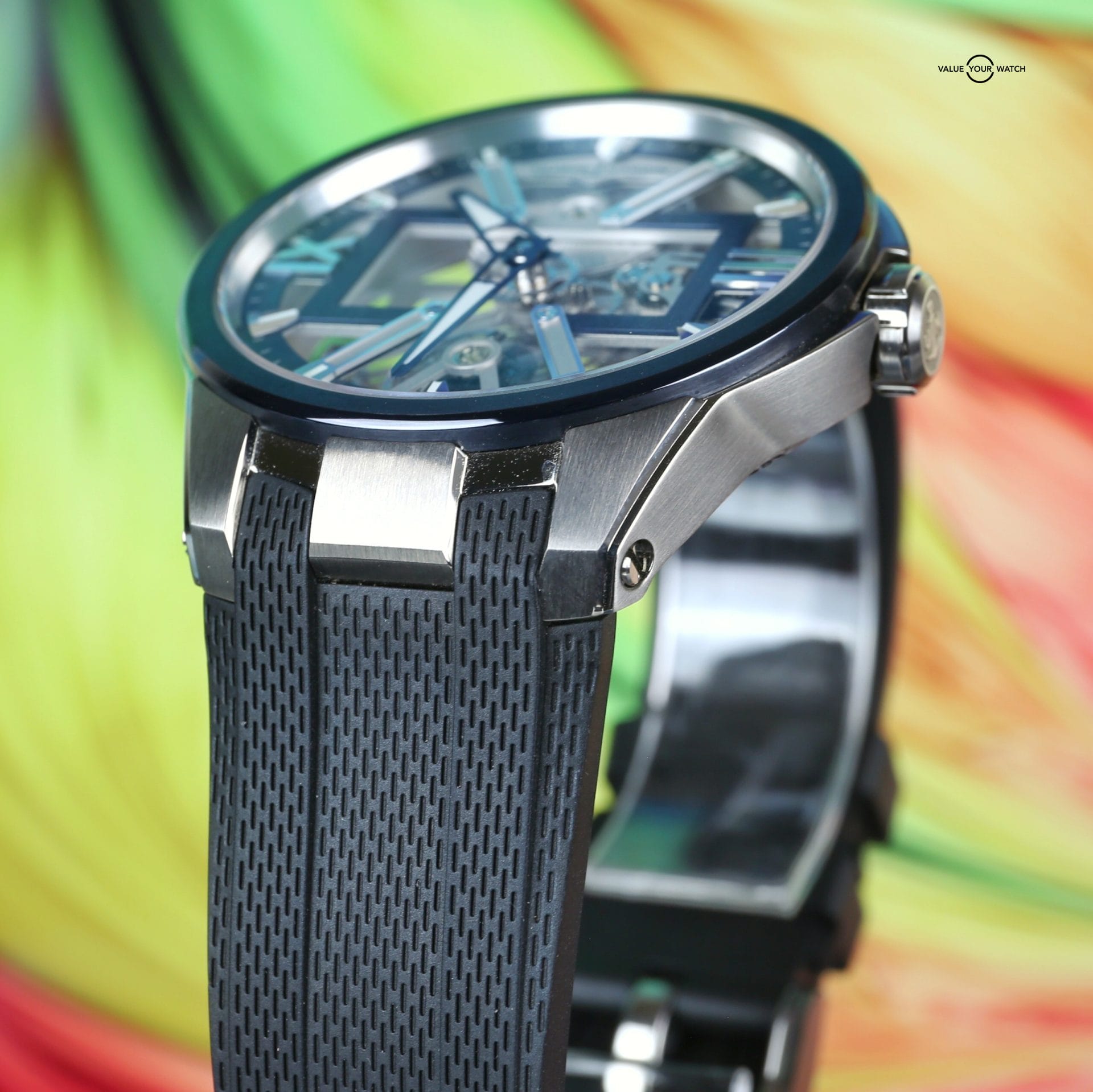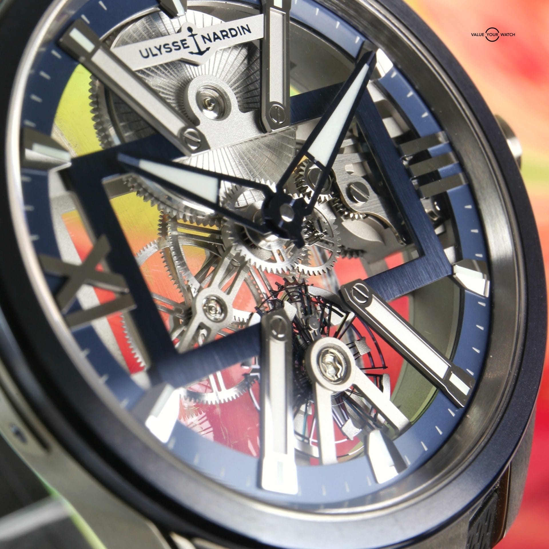 A pristine, near new, example of a Ulysse Nardin Blast Skeleton X 42mm Titanium case, with a brushed finished blue PVD coated bezel ring and rubber strap.