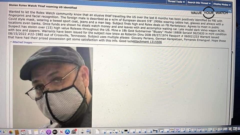 He is known to be working with another female who sits in a get away vehicle. If he attempts to reach out to buy a watch it is best to avoid interaction. If you have the skill set to catch this fella best of luck to you.