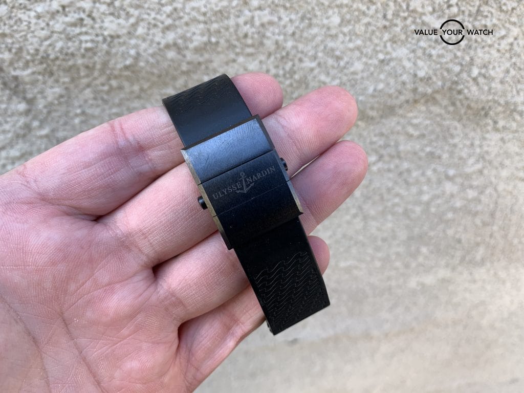 To accommodate the beautiful case, this watch features a transparent exhibition caseback showcasing the automatic self-winding UN-26 movement with an approximate 42 hour power reserve. This watch also features a factory titanium deployment clasp with an original UN rubber strap. The strap has been cut to fit an approximately 7.75” wrist.