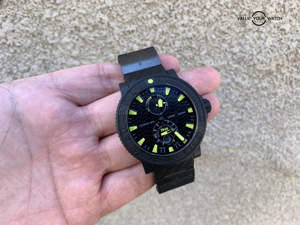 This beautiful watch is not your average Ulysse Nardin. Featuring a strong and durable stainless steel case and bezel in a black rubber coating. This Black Sea features the rare yellow luminescent markers that pop out in the night or day!