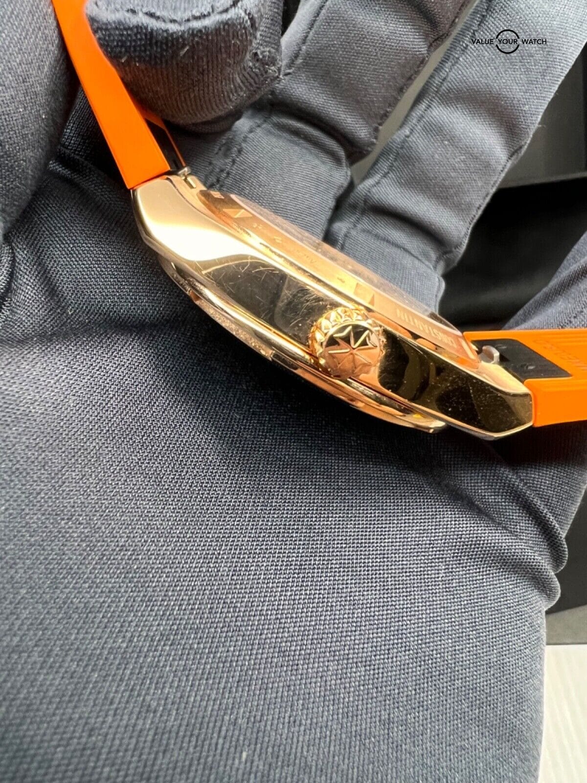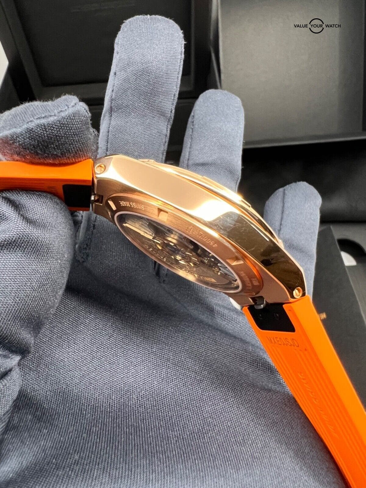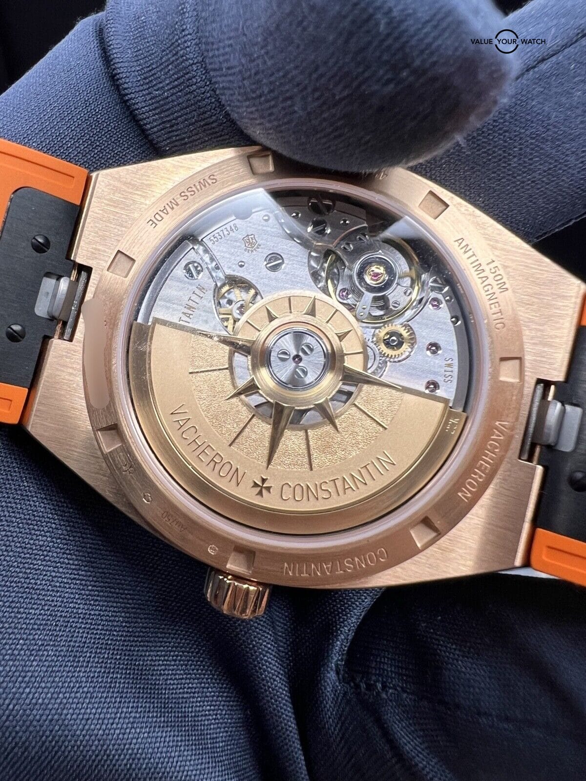 Pay particular attention to the authenticity and condition of the VIP orange rubber strap, as it is a unique and distinguishing feature of this Vacheron Constantin Overseas model. Verify that the strap is in excellent condition and that it securely attaches to the watch case.