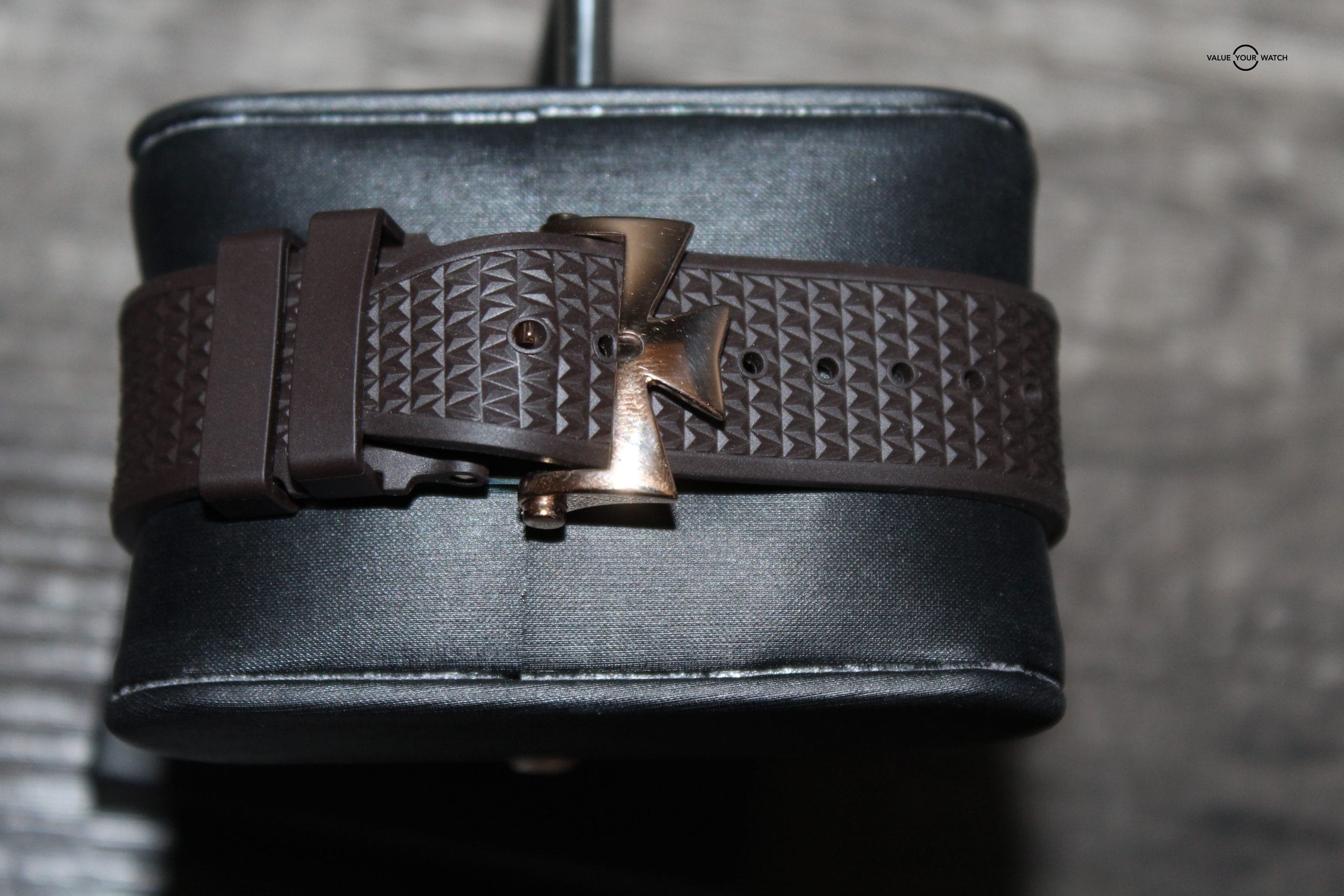 This elegant yet casual Vacheron Constantin Oversea Chronograph (2022) 18K Rose Gold case with interchangeable leather and rubber straps. This beautiful timepiece displays an open-worked caseback revealing an oscillating weight in 22k gold showcasing a decoration inspired by the wind rose in the spirit of travel. Self-winding movement which is stamped wit the Hallmark of Geneva.