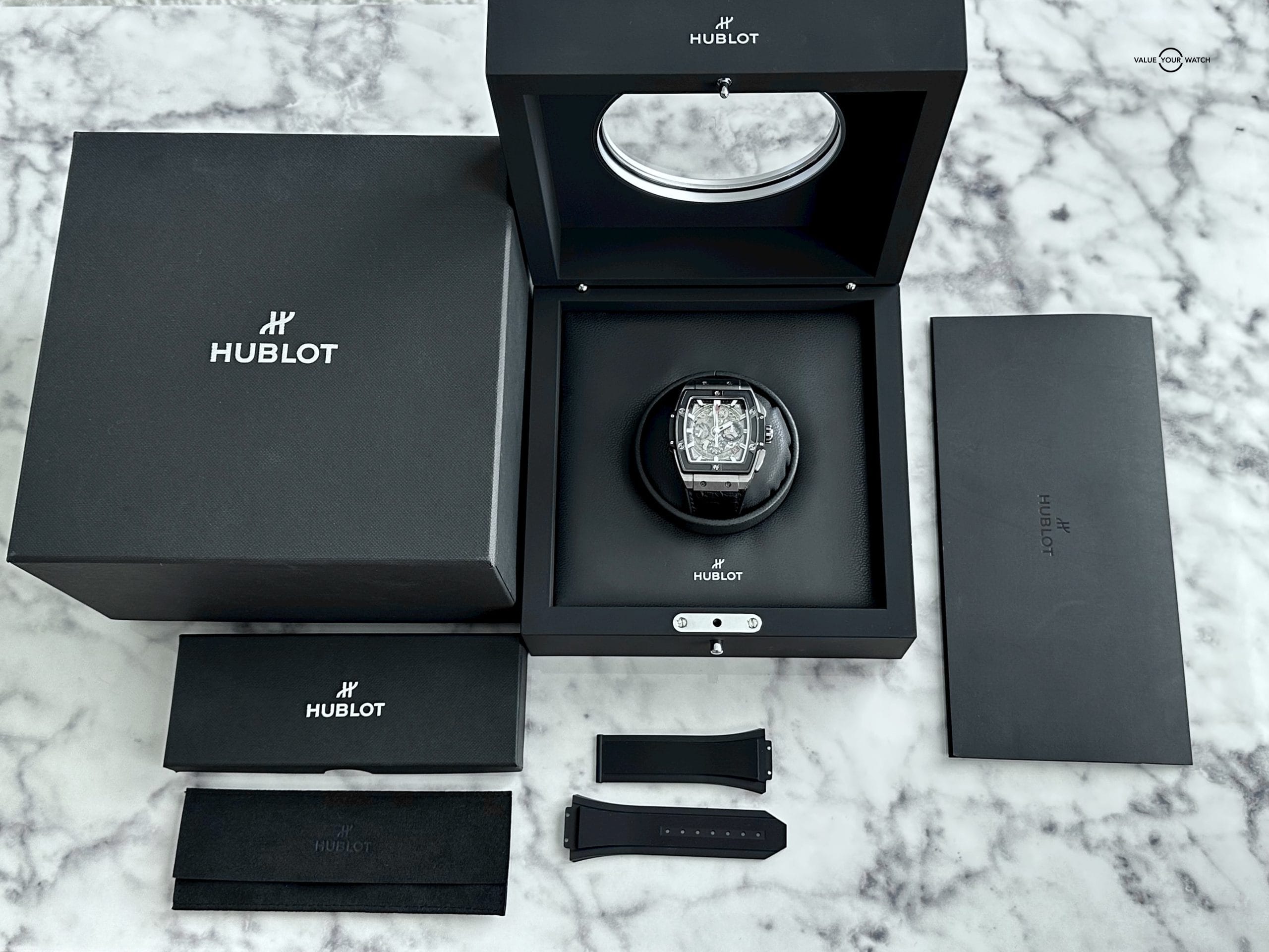 Hublot outer box, Hublot inner watch box, Hublot e-Warranty (dated 11/24/2021), Hublot black Alligator strap, Hublot black-lined rubber strap, Hublot strap case and pouch, & original Hublot reciept