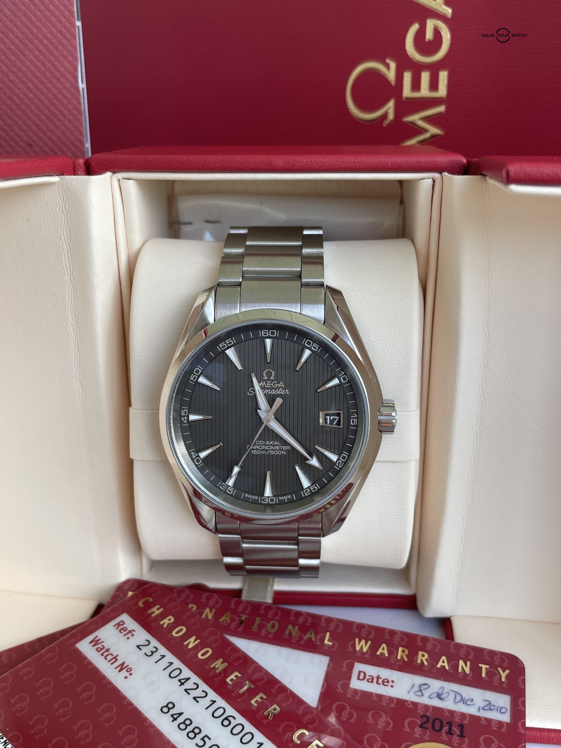 Watch comes with the Omega Service red travel, Cards, and manual. I will include the servicing receipt and Omega purchase back.