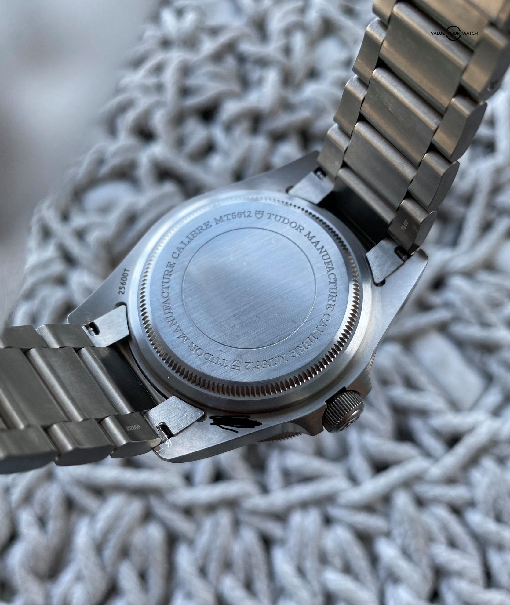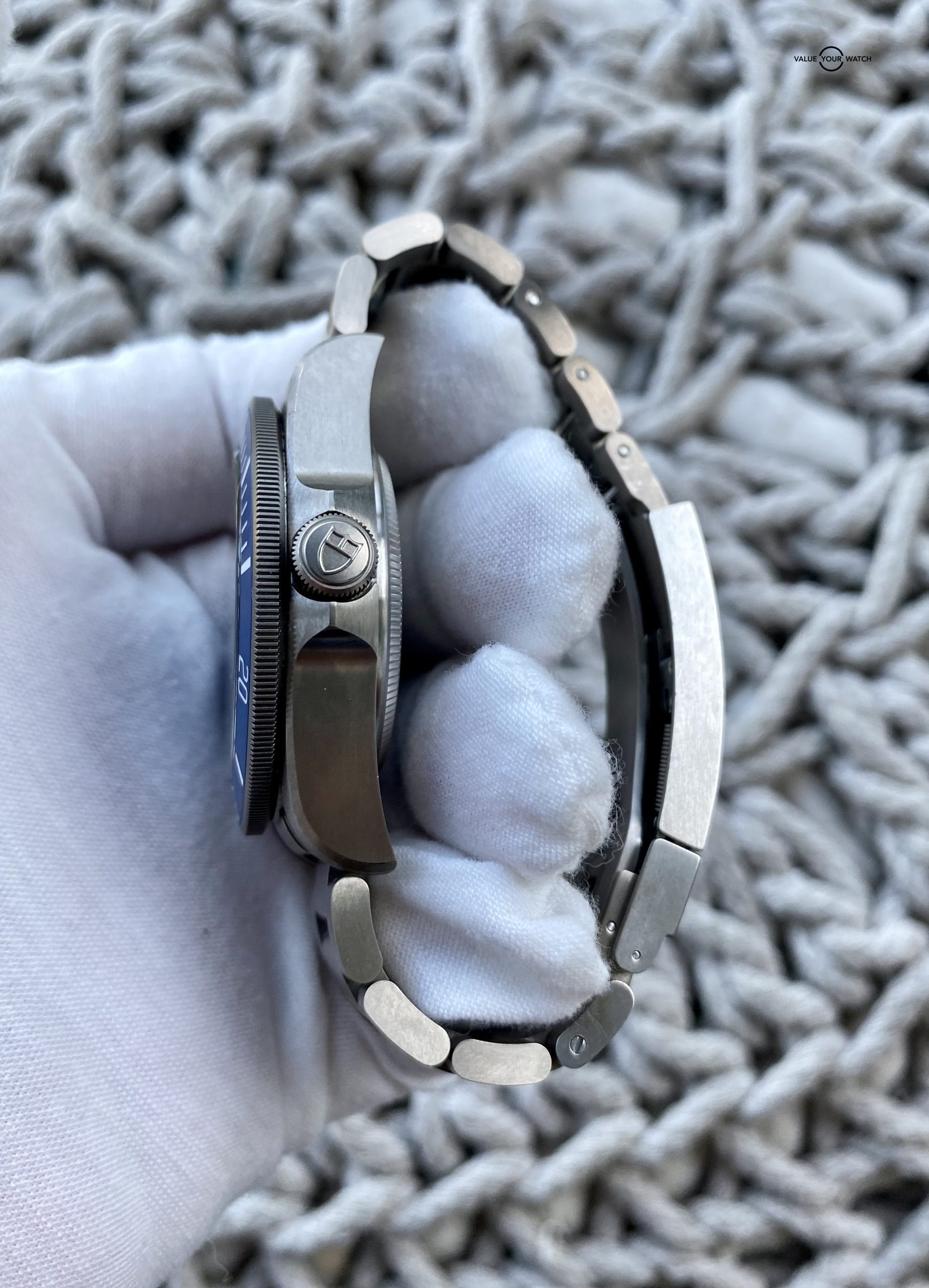 The overall condition of the watch is really good for a preowned Titanium piece. Small scuffs on the brushed finish about the bracelet, case edges and corners are free from any dings or dents, crystal is perfect, clasp has some desk rash, a lot of which aren’t very noticeable while wearing. Watch some complete with outer sleeve, outer box, inner box, warranty card, hang tag, full links, aftermarket blue rubber strap.