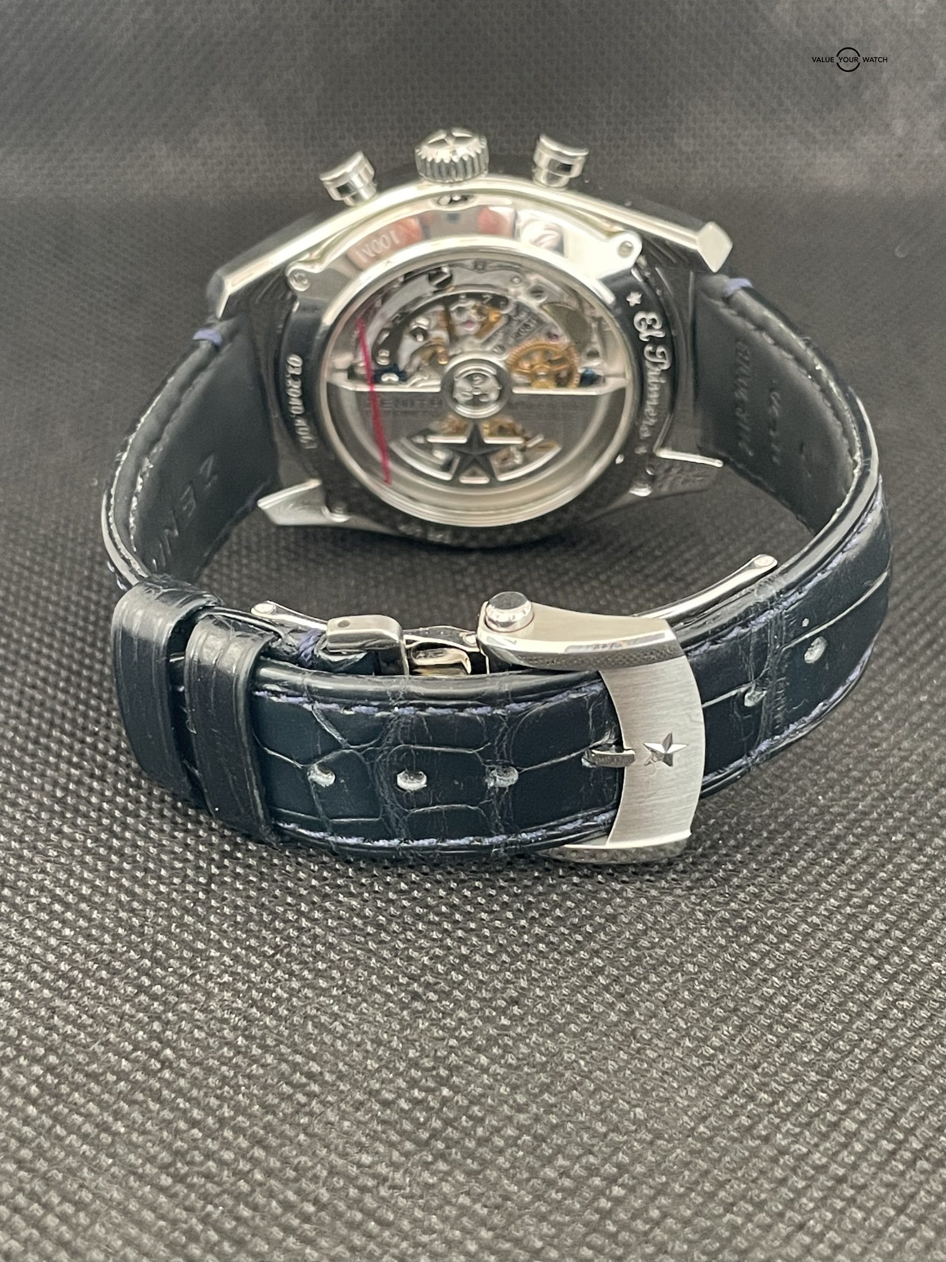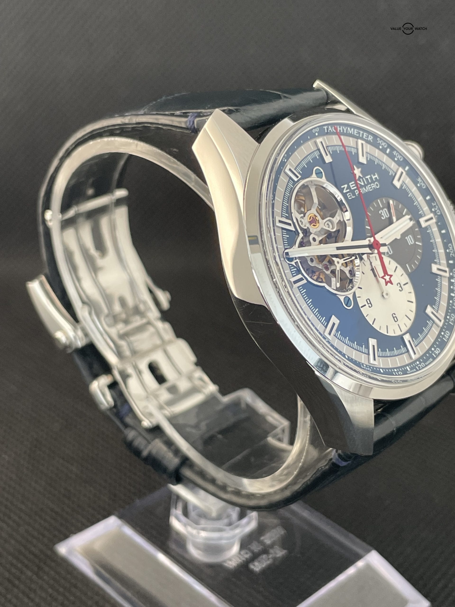 This lovely Zenith Chronomaster El Primero Open “work” or “Open heart” sit on a perfect 42mm stainless steel case size. The leather strap is on prestige condition with hardly any sign of wear. Run an automatic El Primero 4061 movement with 31 jewels, 50-hours power reserve, 30-minute chronograph, blue “open worked” dial with exposed escapement, applied stick markers, luminescent hands, sapphire crystal, display back with “stickers”, water resistant to 100 meters, Like New with Zenith box and papers dated July 2021. I will include a Zenith El primero history book on the sale, This is a true stunner in Person!