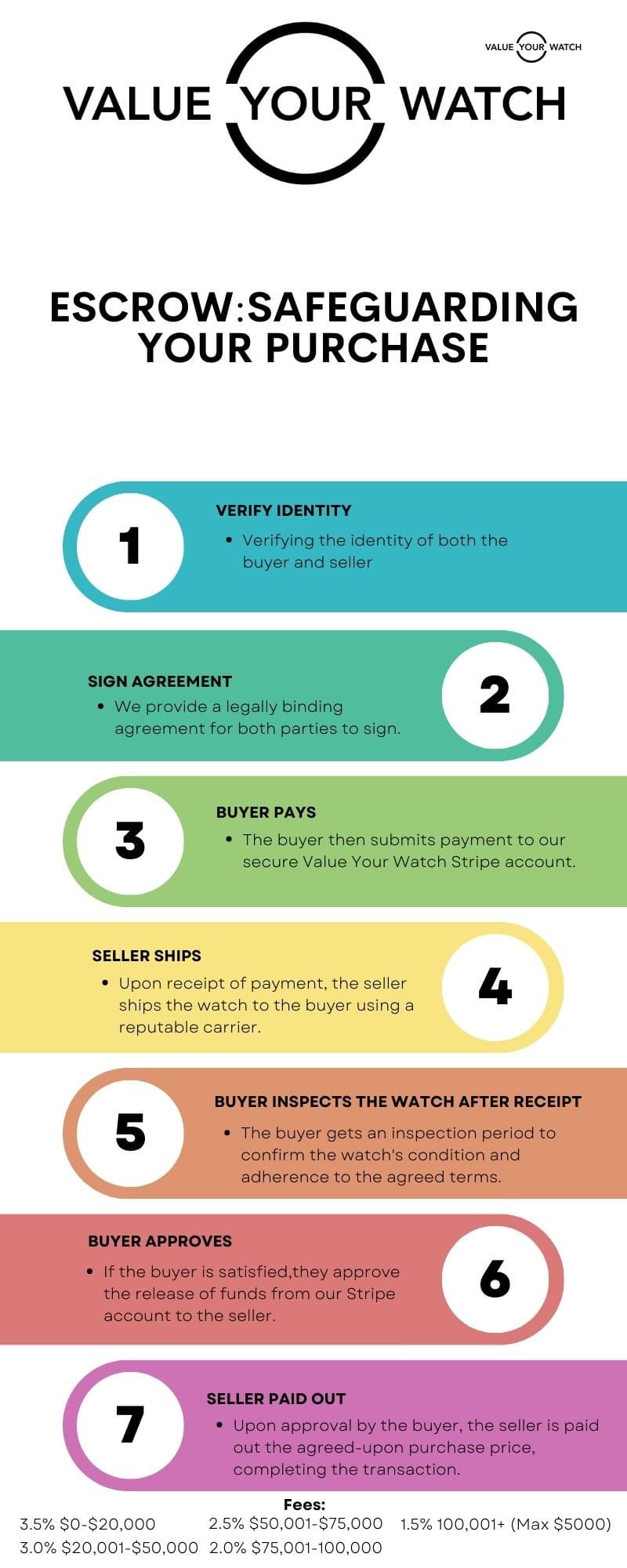 Our Escrow service is specifically tailored to meet the needs of the luxury watch market, offering a streamlined and transparent process for buyers and sellers alike. Whether you are looking to purchase a rare and collectible timepiece, or are interested in selling a piece from your personal collection, our Verified Value Purchase service provides a safe and secure way to conduct your transaction.