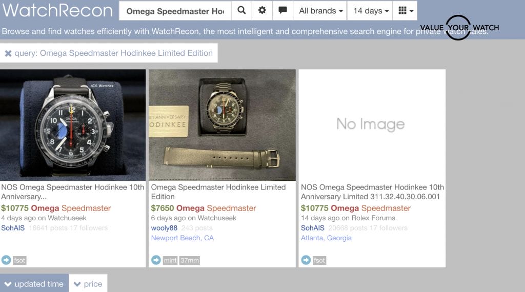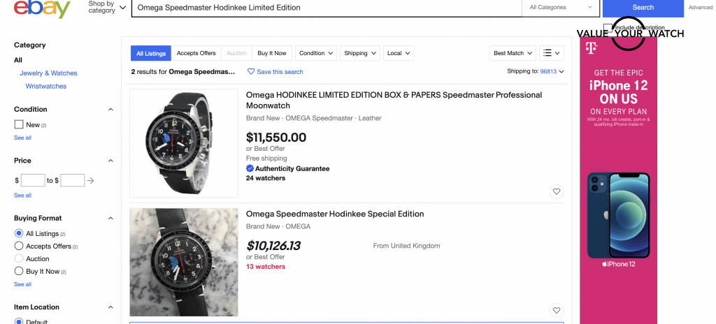If you are searching for an Omega Speedmaster Hodinkee Limited Edition on eBay, you will be able to see on each platform the asking prices of the watch. The watch value you are looking for is the average of 3-5 watches listed on each platform.